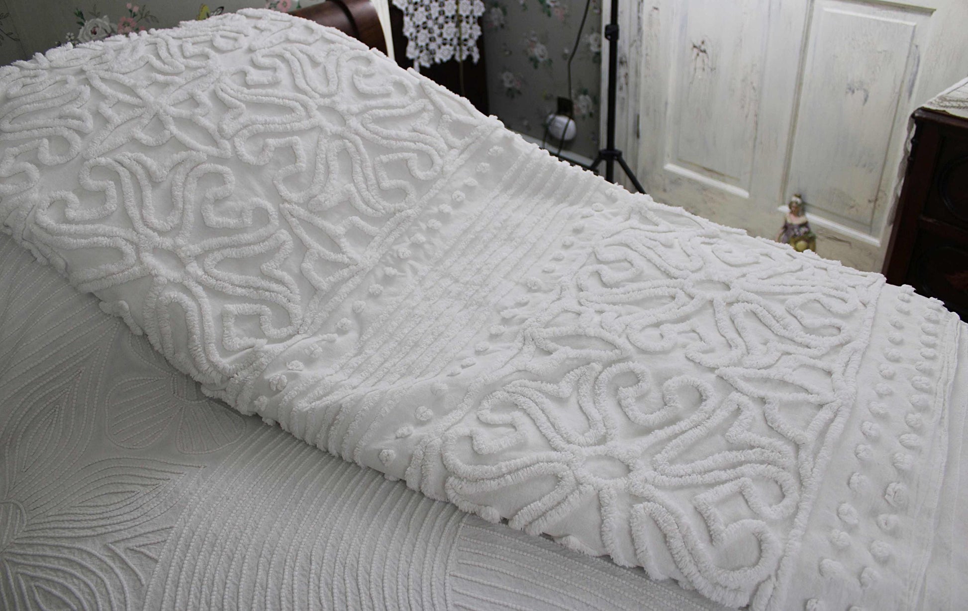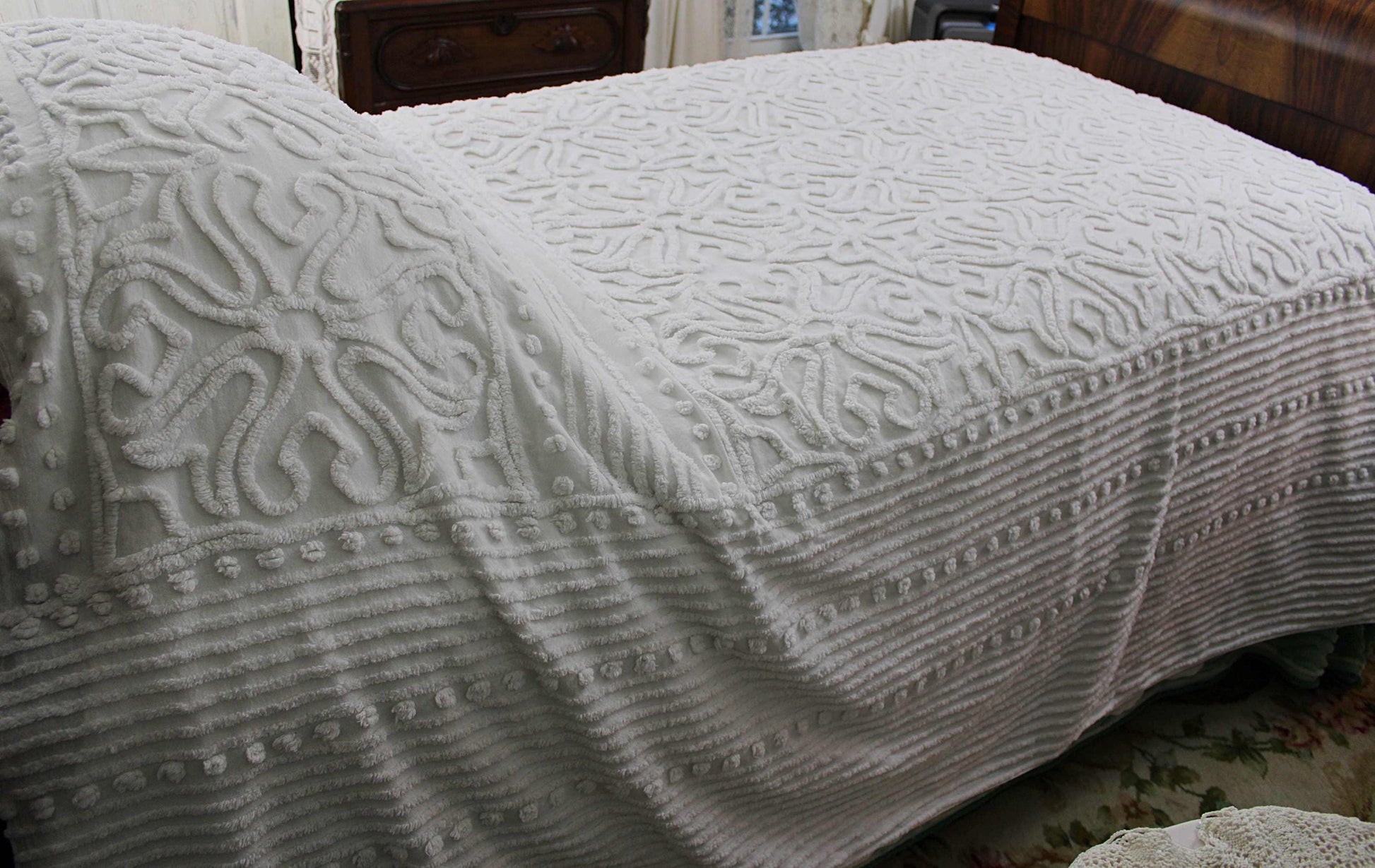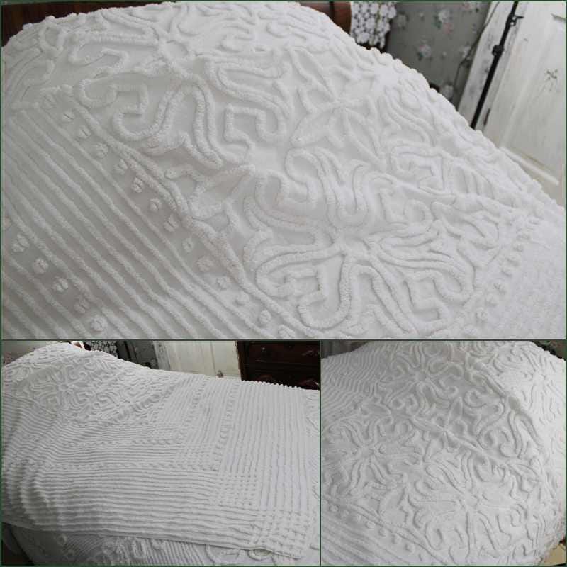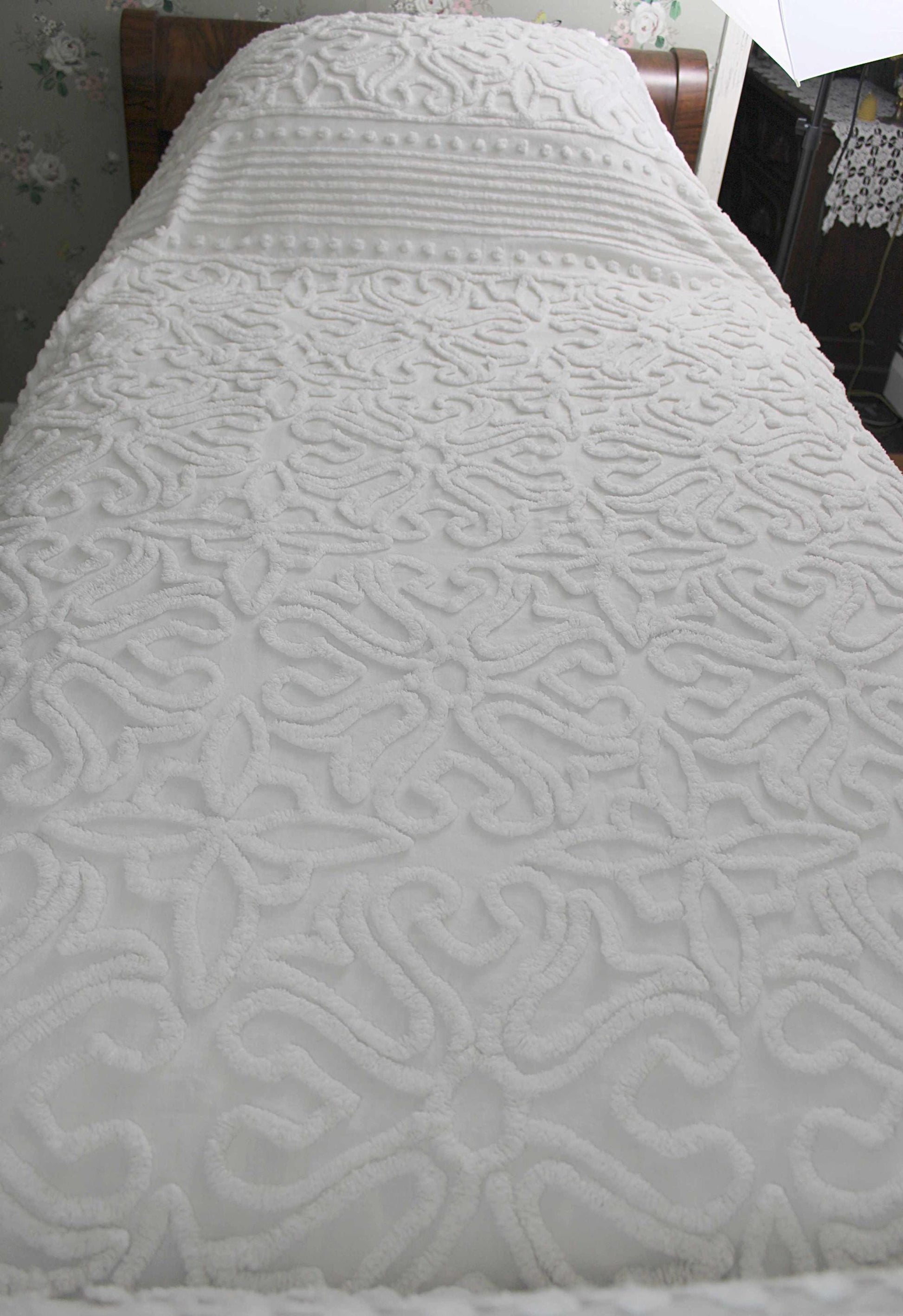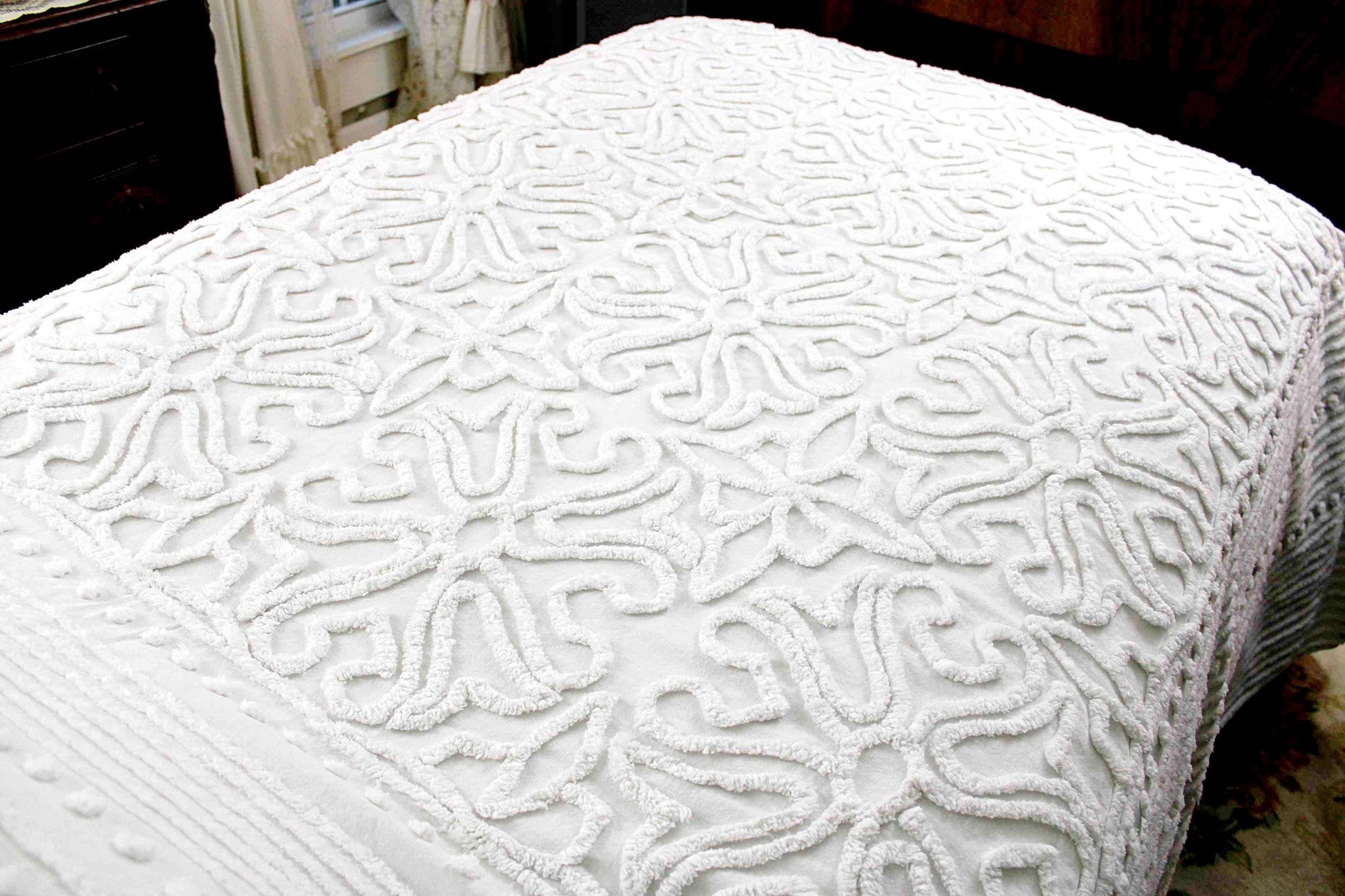A heavenly vintage chenille bedspread to incorporate into your farmhouse style decor. Beautiful, large sculpted scrollwork predominates the central portion, while the sides feature a simple line design interspersed with dots.Ideal as a summer coverlet, the bedspread is lightweight, 100% cotton. Or, it's versatile enough to layer with your other favorite linens for an effortlessly chic look.