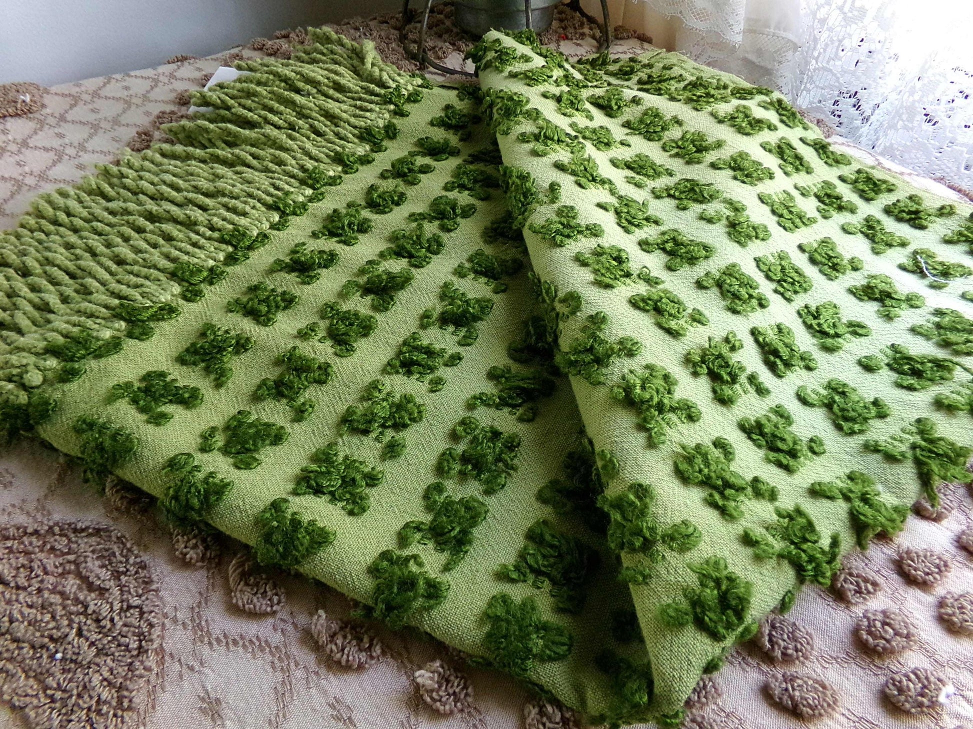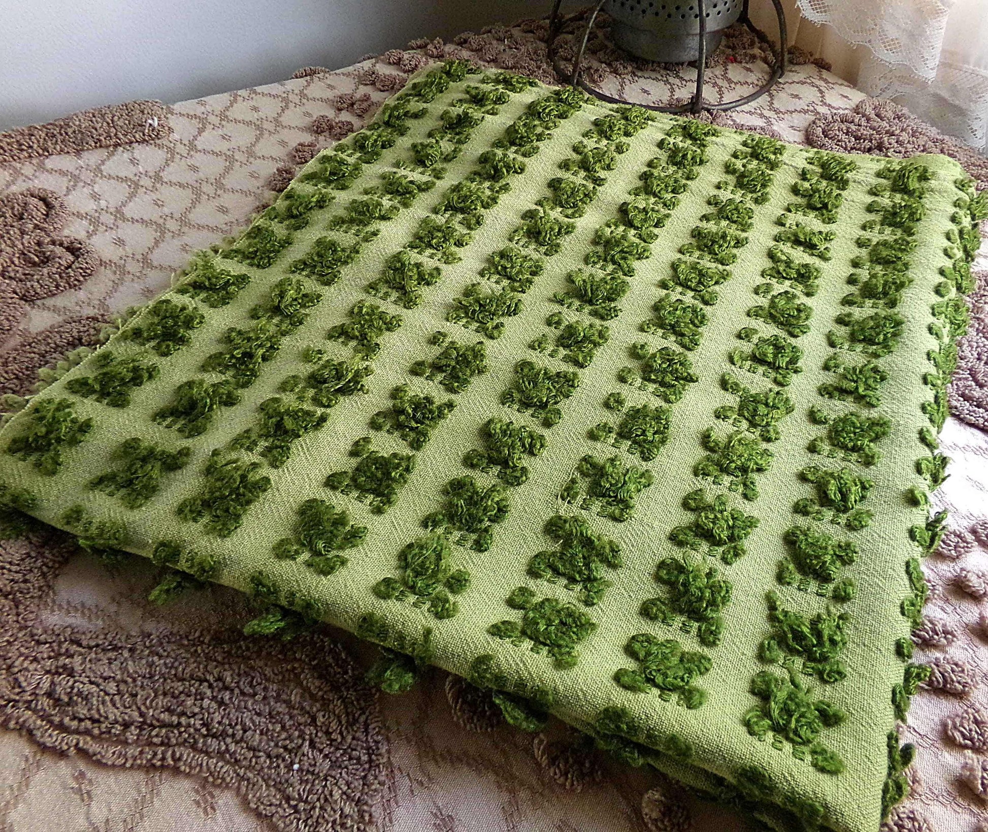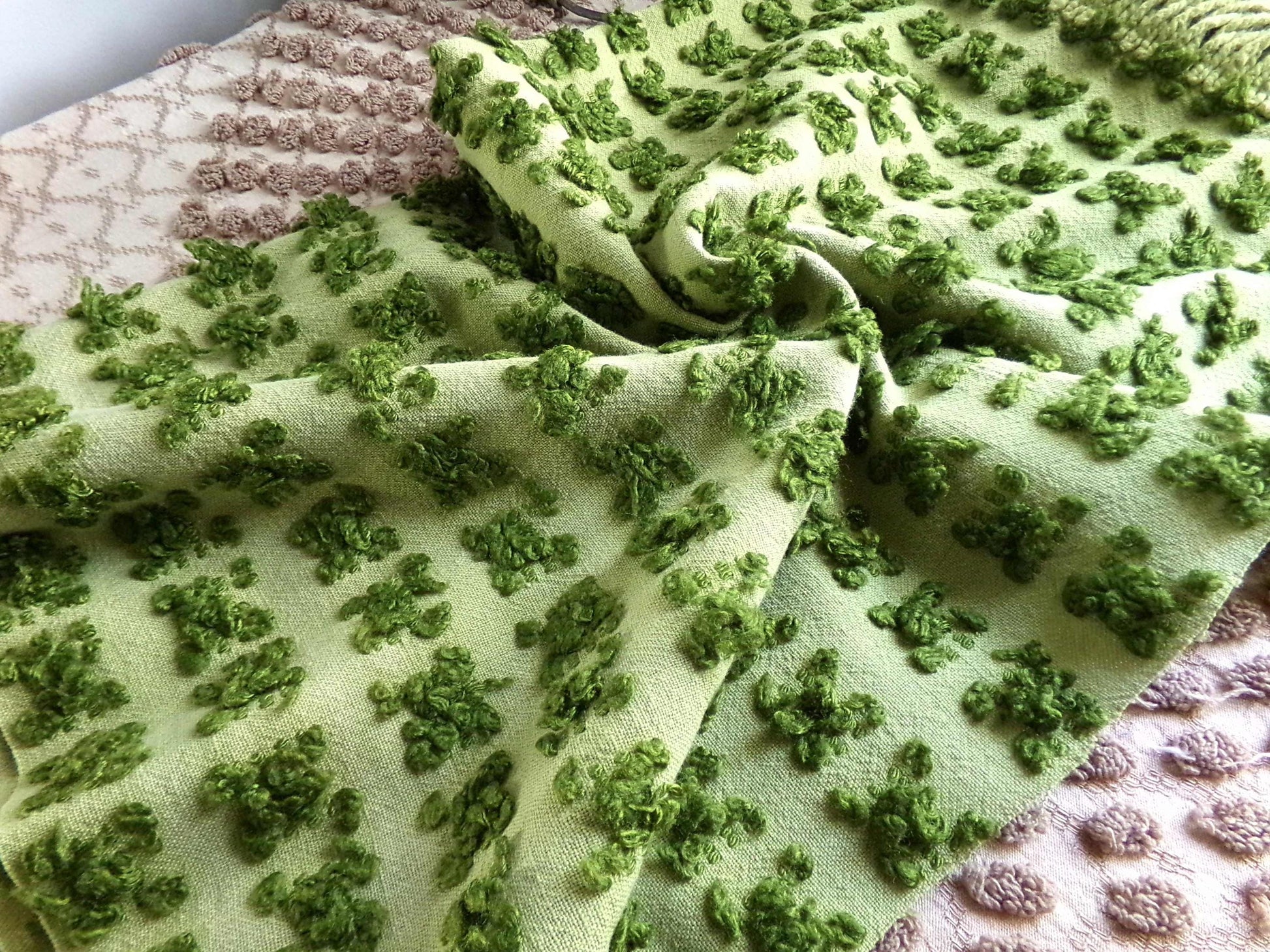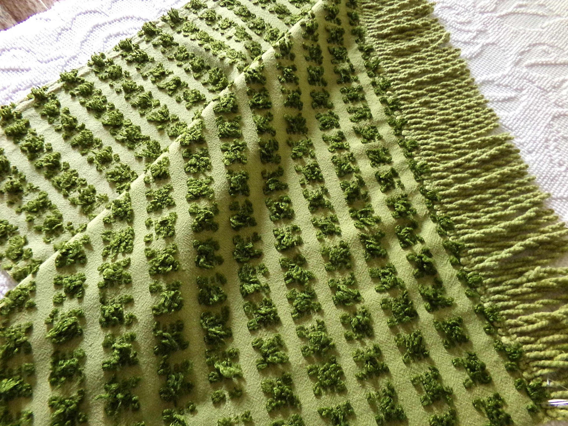 The epitome of hippie chic...very rare vintage chenille fabric in a tonal Grecian Green rosebud print. This fabric is just amazing...natural color variations to give natural patina, 3D raised rosebuds that pop against a lighter green bkgd...and that fringe accenting an edge...Lightweight cotton blend. Measures 24" x 18" inches. You'll spot a missing rosebud or two, which happened when the rosebud wasn't tufted at the factory (final img).What can you do with vintage fabric? Your inner artist is calling with so many creative possibilities: incorporate into handmade quilts, dress up a junk journal, design fun functional fabric patches & appliques, make your own DIY pillow covers, fashion makeup, essential oil bags & small totes, bring nostalgia to your scrapbooking proj, create a cute stuffed toy, craft 3D flowers, integrate into fiber art, textile arts & more..w h a t - t o - k n o w