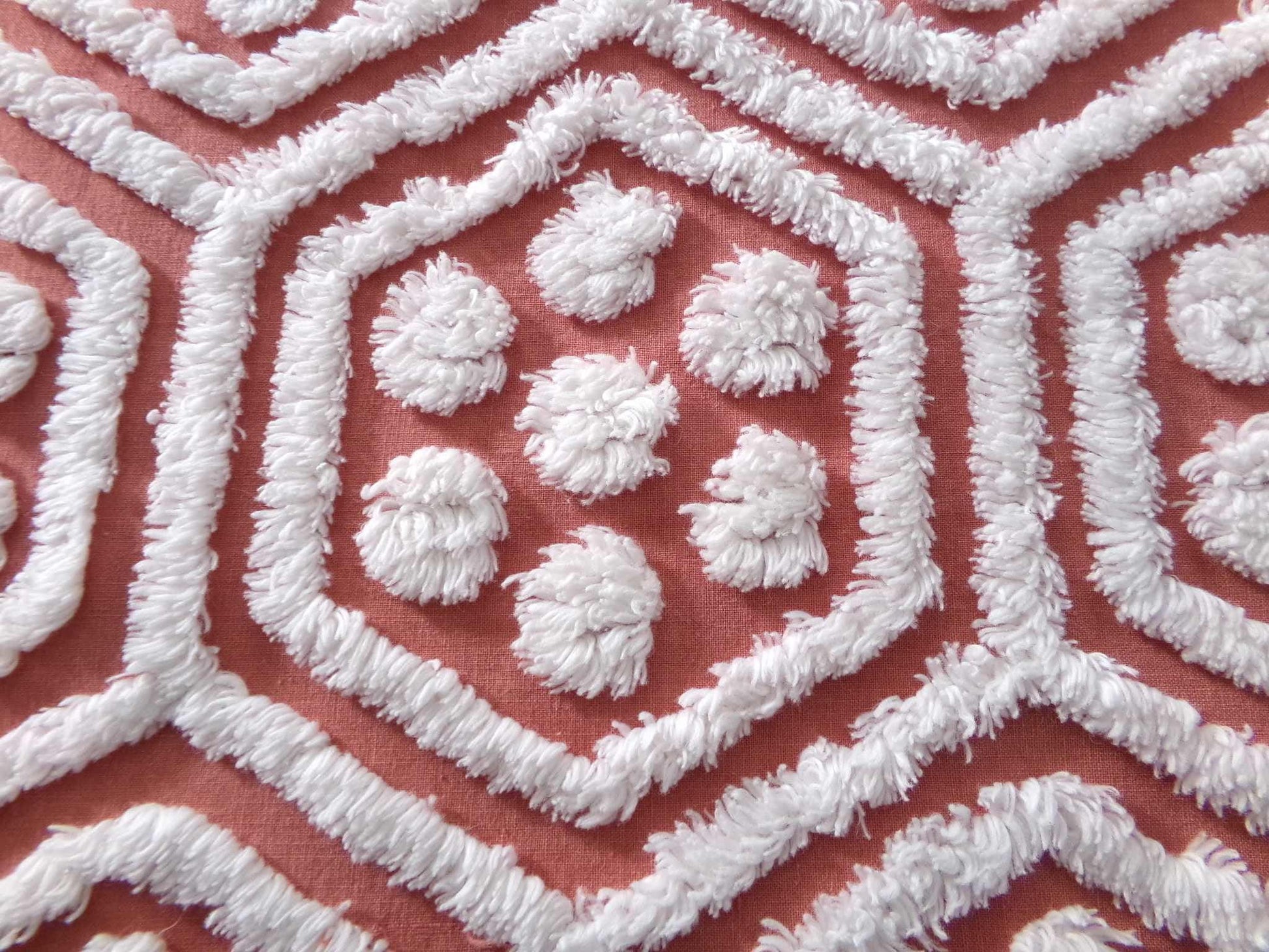 Add boho style to your creative design with this very unique piece of vintage chenille fabric. In an earthy shade of warm terracotta, the white tufted hexagons surrounding large dots really stand out.