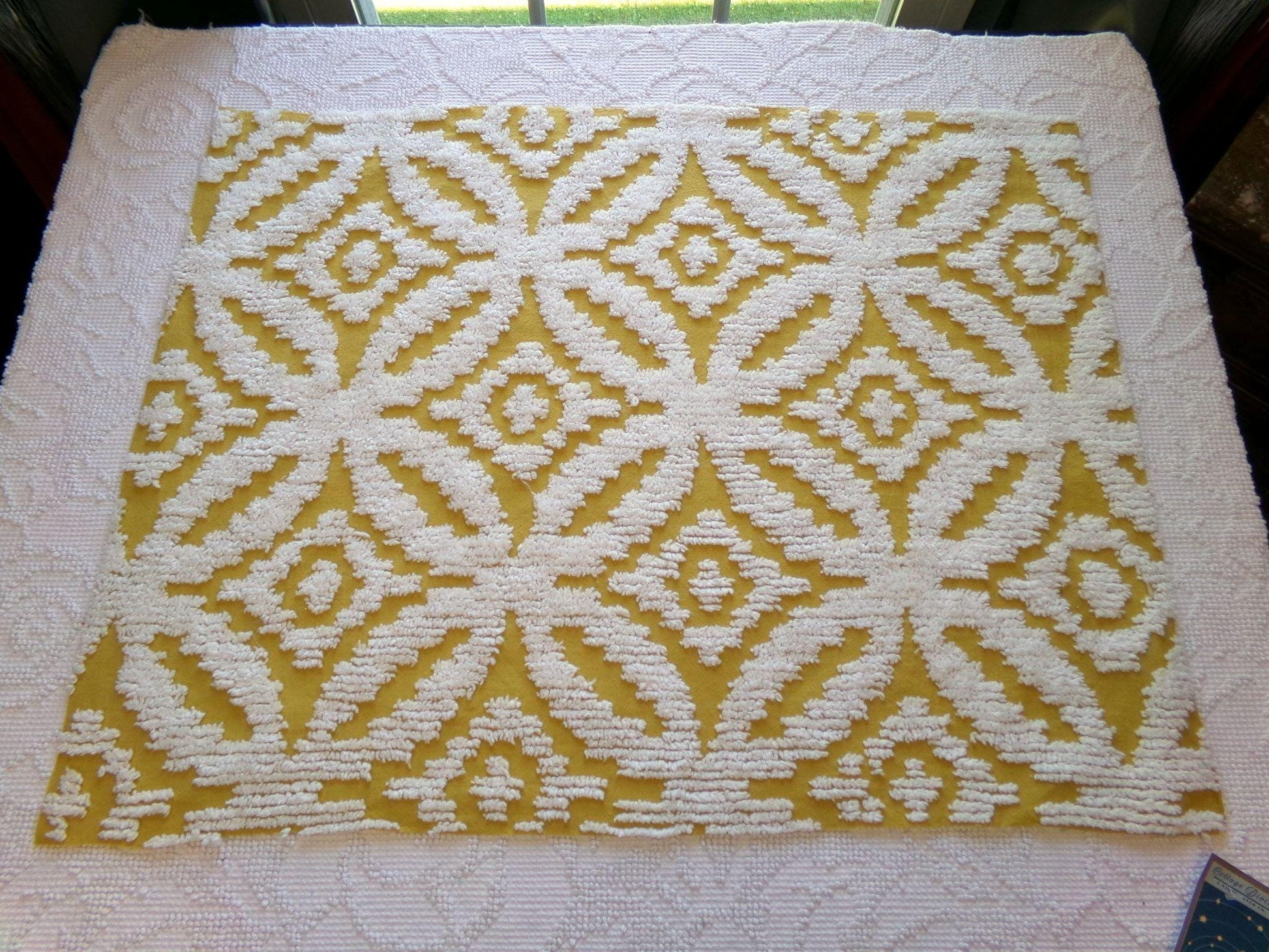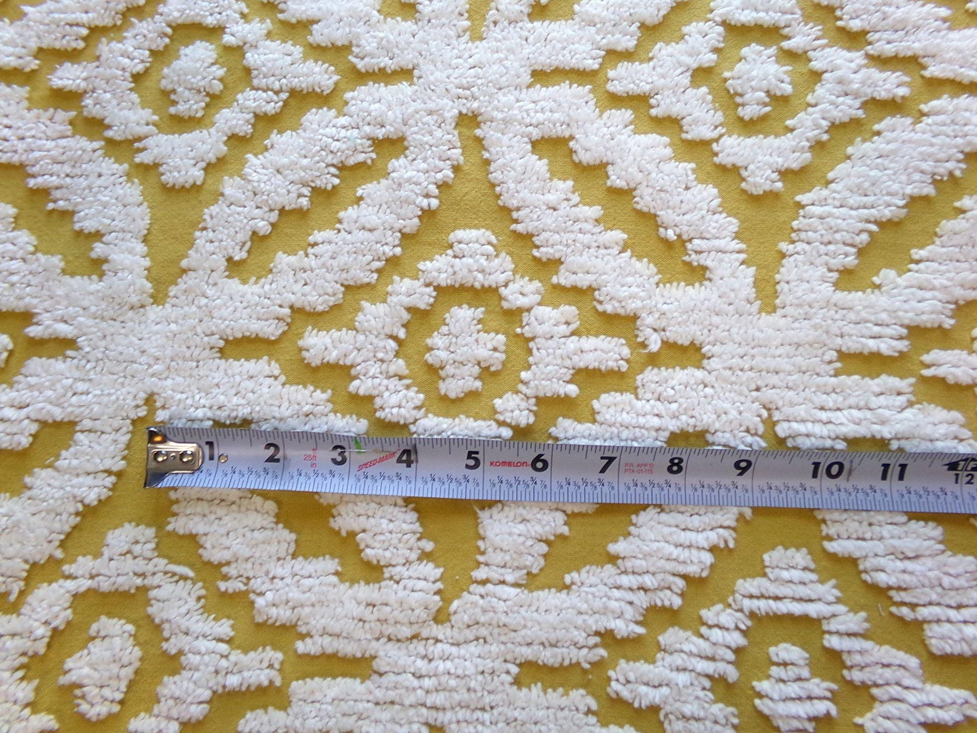 Dial back the hands of time when you add this retro chenille fabric to your creative design. This lightweight cotton material features white low-tufted wedding rings set on a honey harvest gold background.Approx 18" x 25" inch piece. This is all cotton, not an acrylic reproduction, and it is easy to sew with. Adapts to light, with closest in-person color represented in the third img. Cut from an original, NOS vintage 1960s era chenille bedspread.