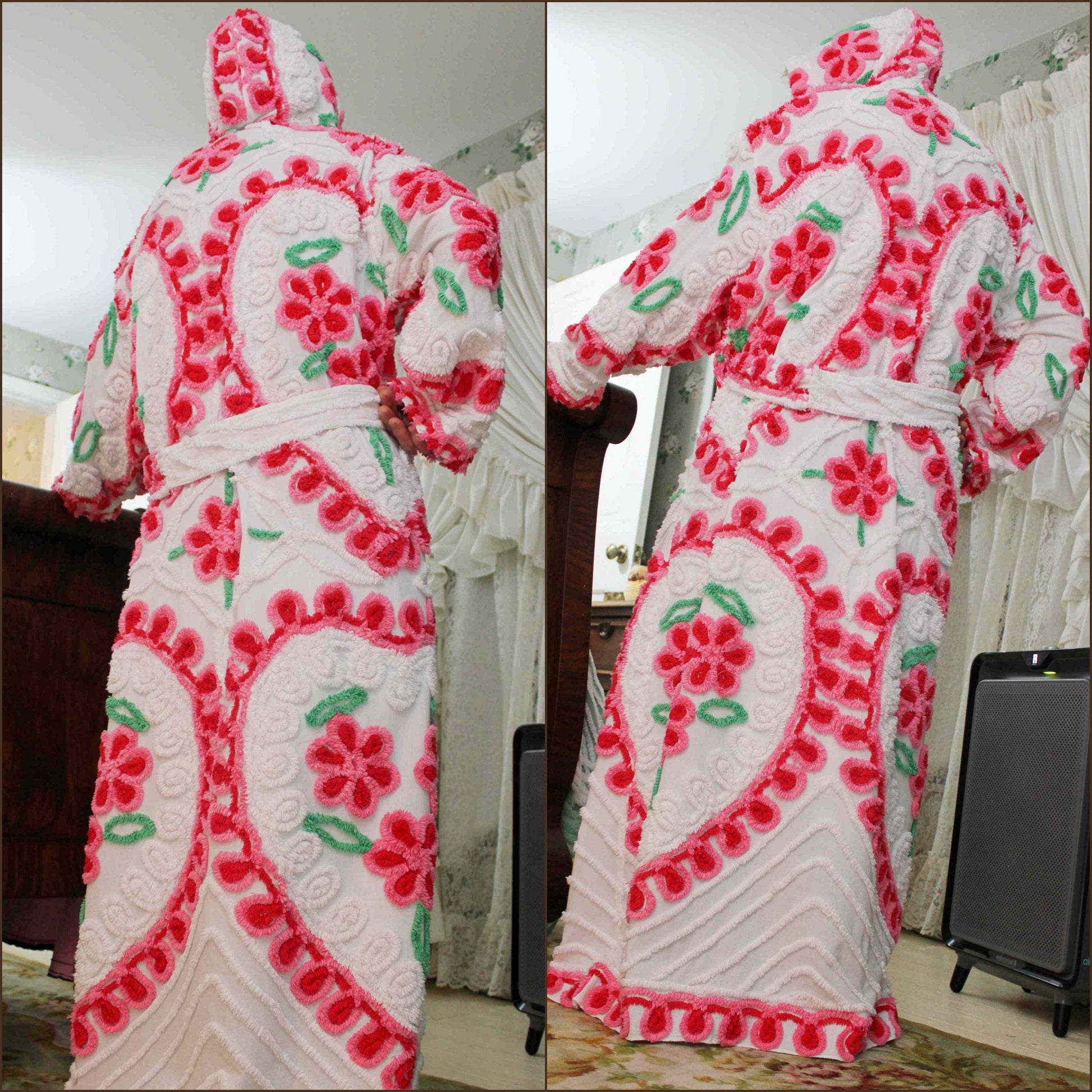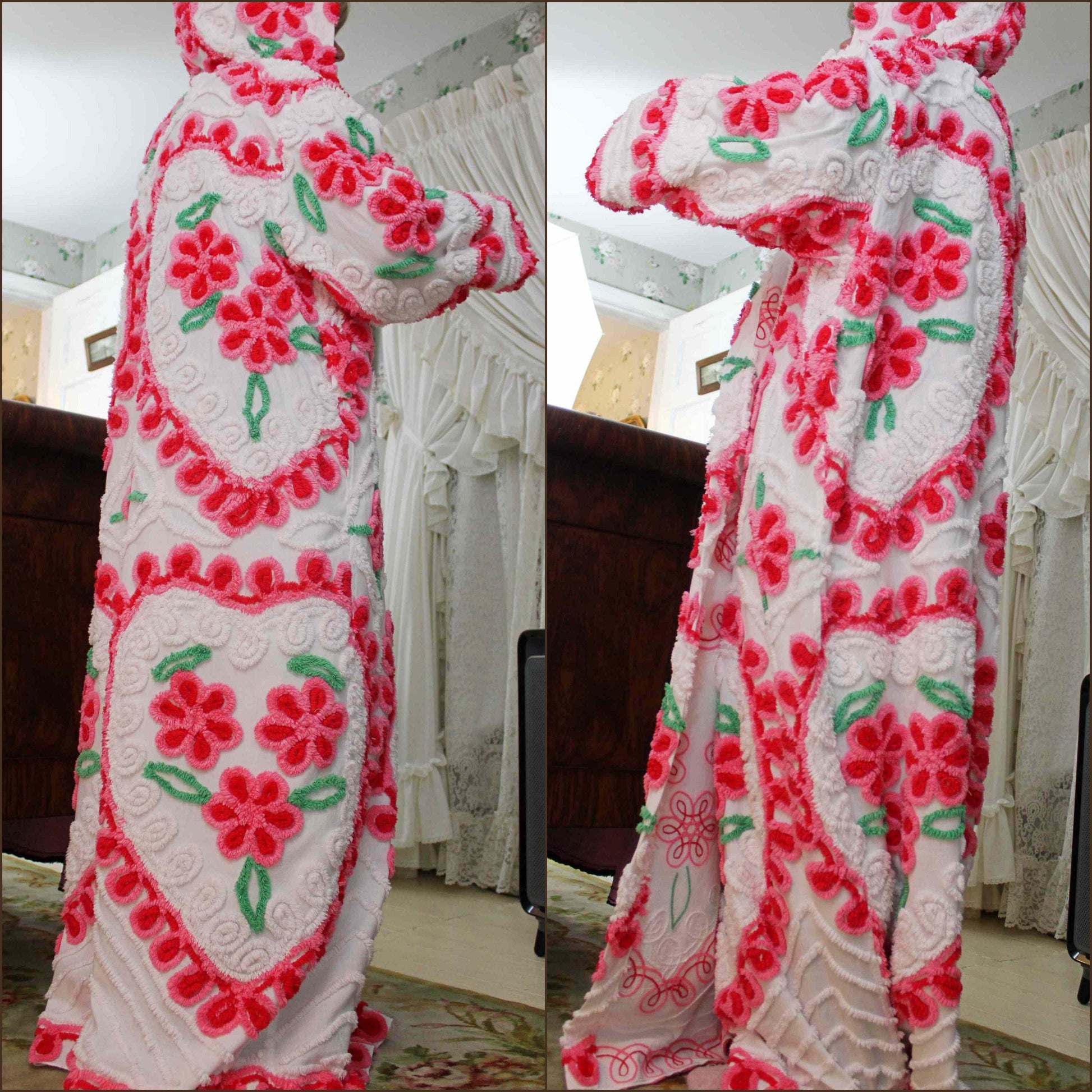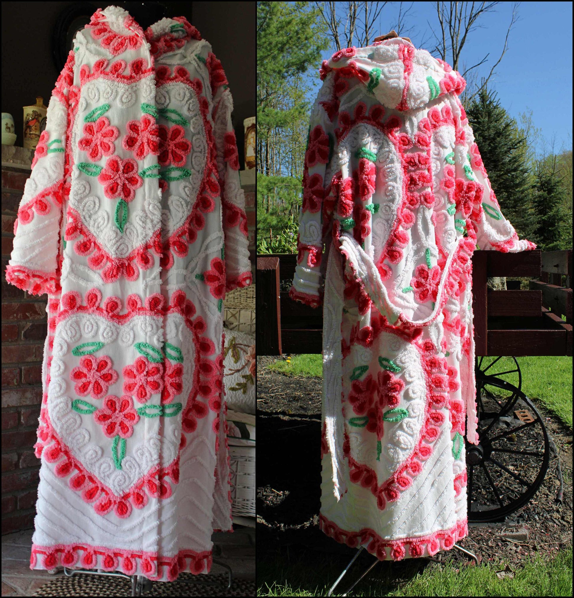 Giant cute pink hearts surround trios of adorable flowers on this vintage hooded chenille bathrobe. Fluffy tufting is set on a snowy white background. A fun, feel-good robe for lounging around - or be daring and wear as a long oversized duster ;)Longer length (incorporating original hemline); best suited for a taller person. 100% quality vintage cotton. No pockets. Standard, removable tie belt. Handcrafted with love in our cozy country studio by upcycling a lovely vintage chenille bedspread from the 1950s era when this pattern was ultra popular.