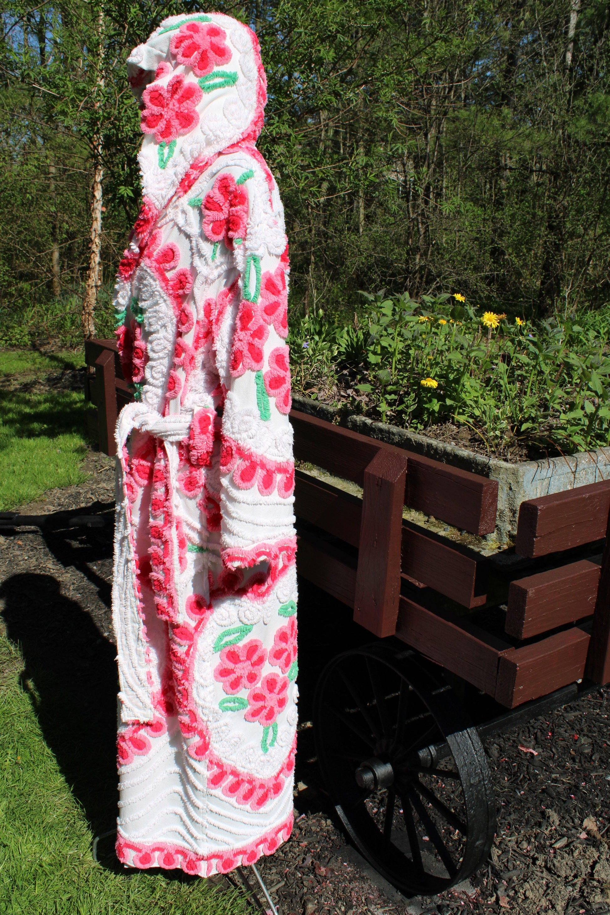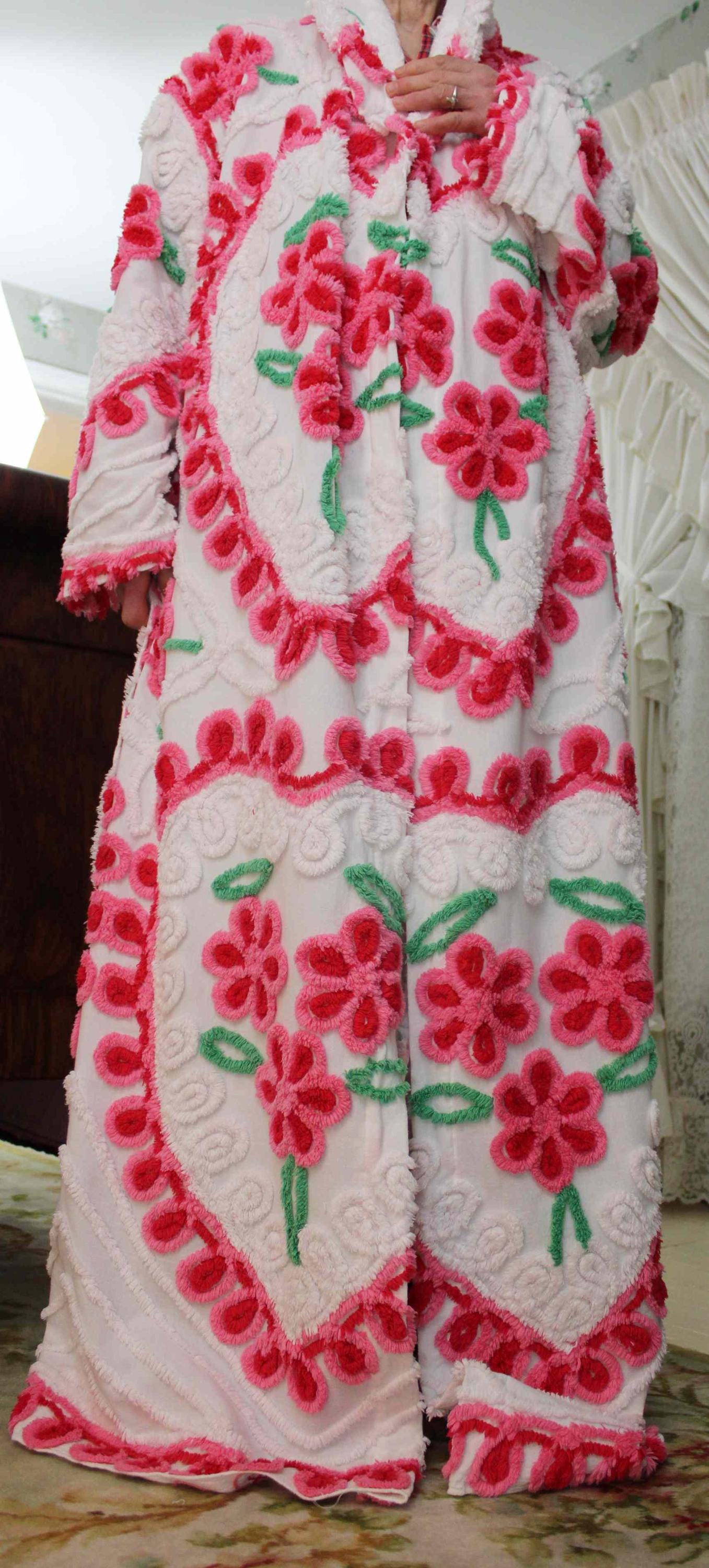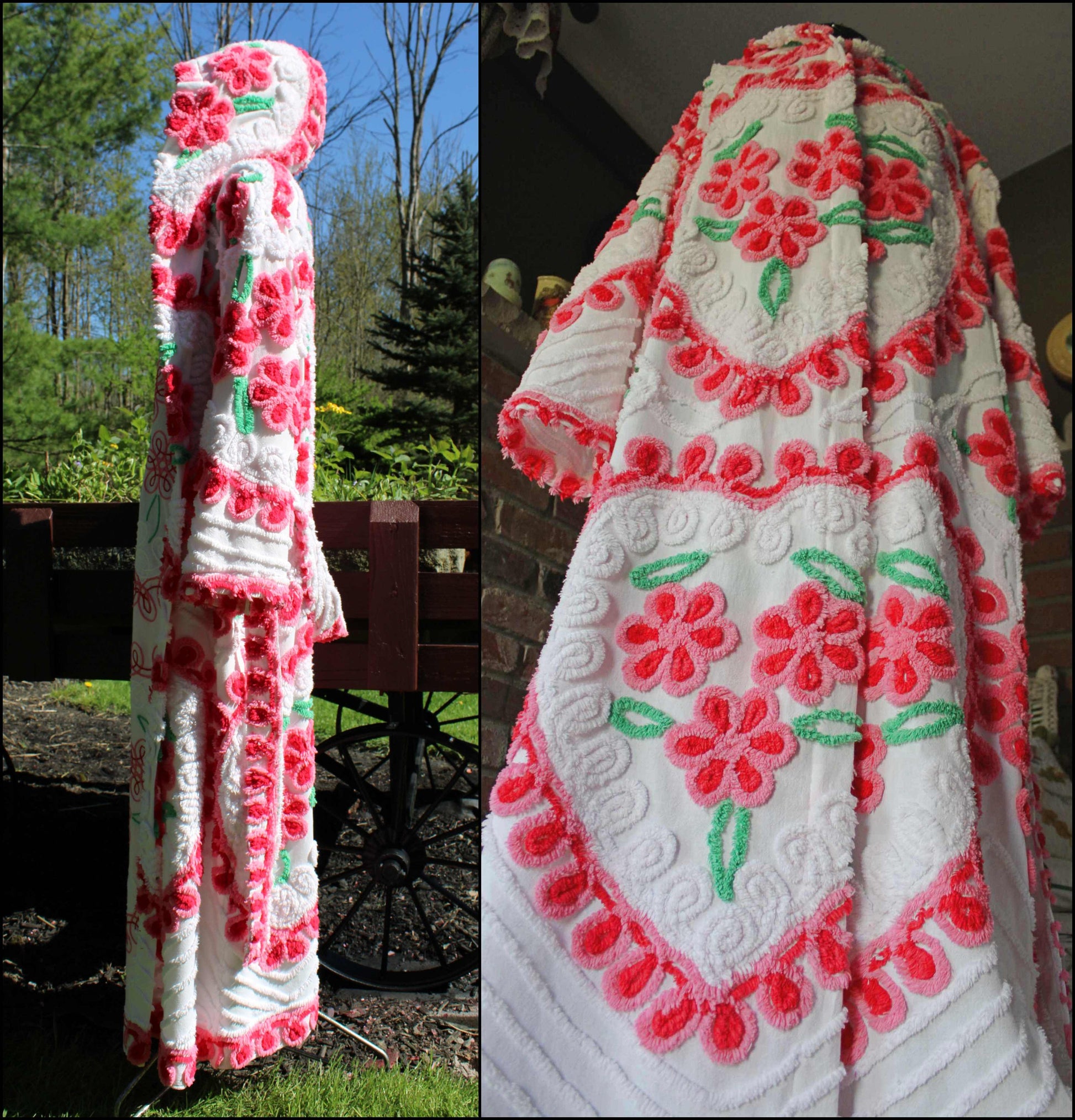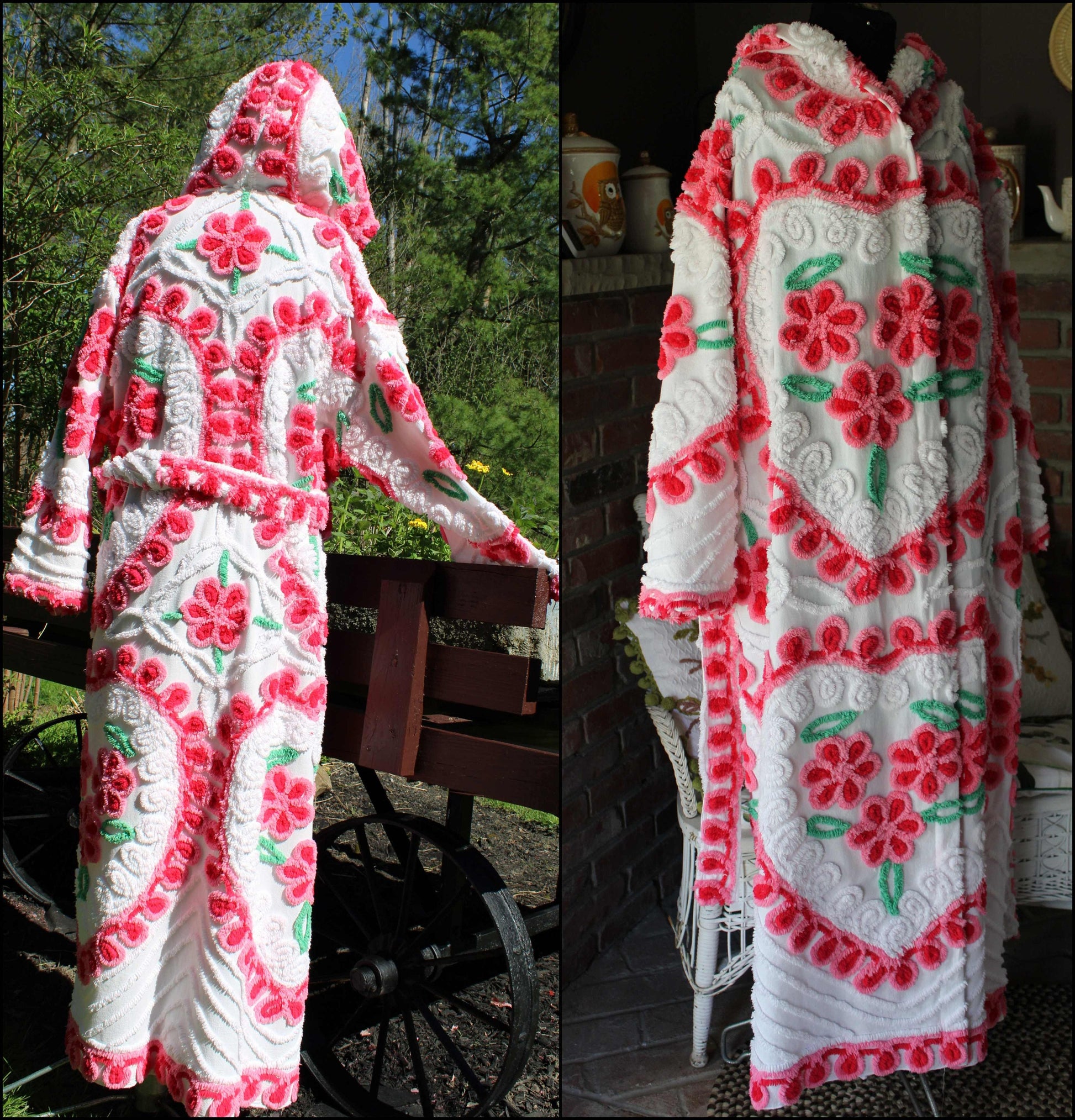 Giant cute pink hearts surround trios of adorable flowers on this vintage hooded chenille bathrobe. Fluffy tufting is set on a snowy white background. A fun, feel-good robe for lounging around - or be daring and wear as a long oversized duster ;)Longer length (incorporating original hemline); best suited for a taller person. 100% quality vintage cotton. No pockets. Standard, removable tie belt. Handcrafted with love in our cozy country studio by upcycling a lovely vintage chenille bedspread from the 1950s era when this pattern was ultra popular.