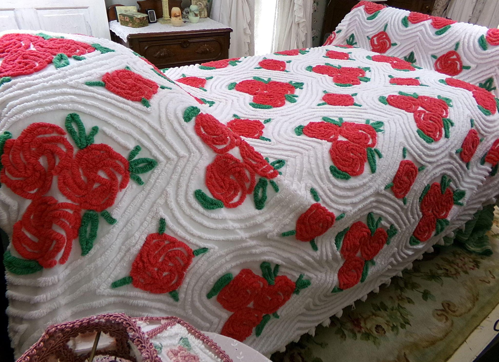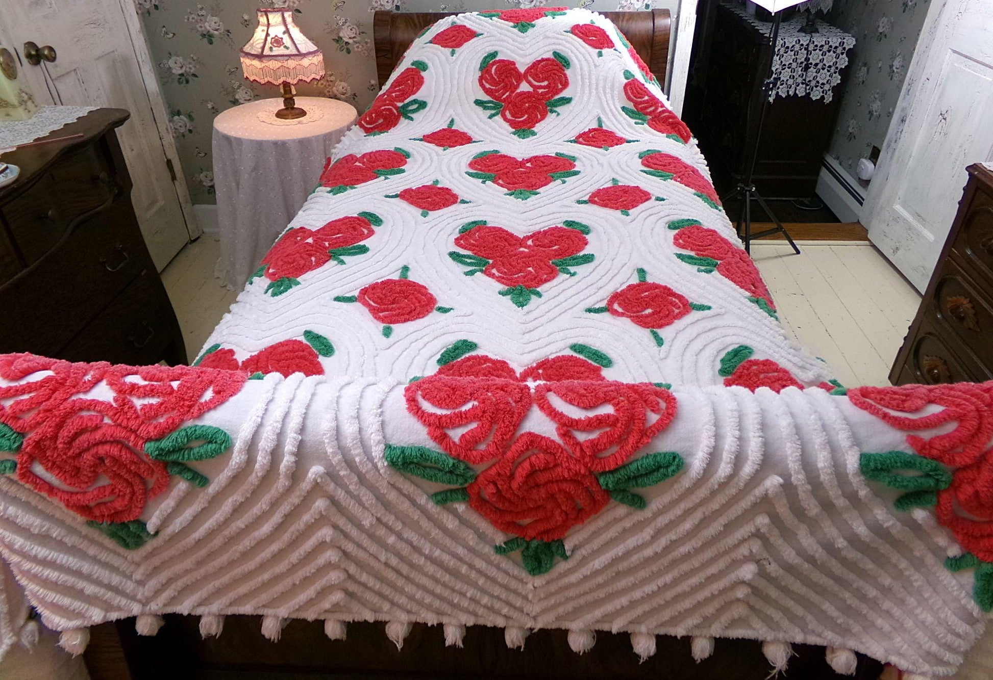 If you love the romanticism of true shabby chic, you might enjoy this beautiful vintage chenille bedspread. It's covered in trios of red roses situated in swirl hearts. The background is white, and it's trimmed with pom poms along the drop sides.This beauty has spent part of her life near a sunny window which has given some of the cabbage roses a wonderful sunkissed, heathered look, something only time & love from Mother Nature can achieve (see collage imgs). If you're looking for perfect, you'll want to pass, but if you appreciate a true vintage gem, you'll love this special bedspread.