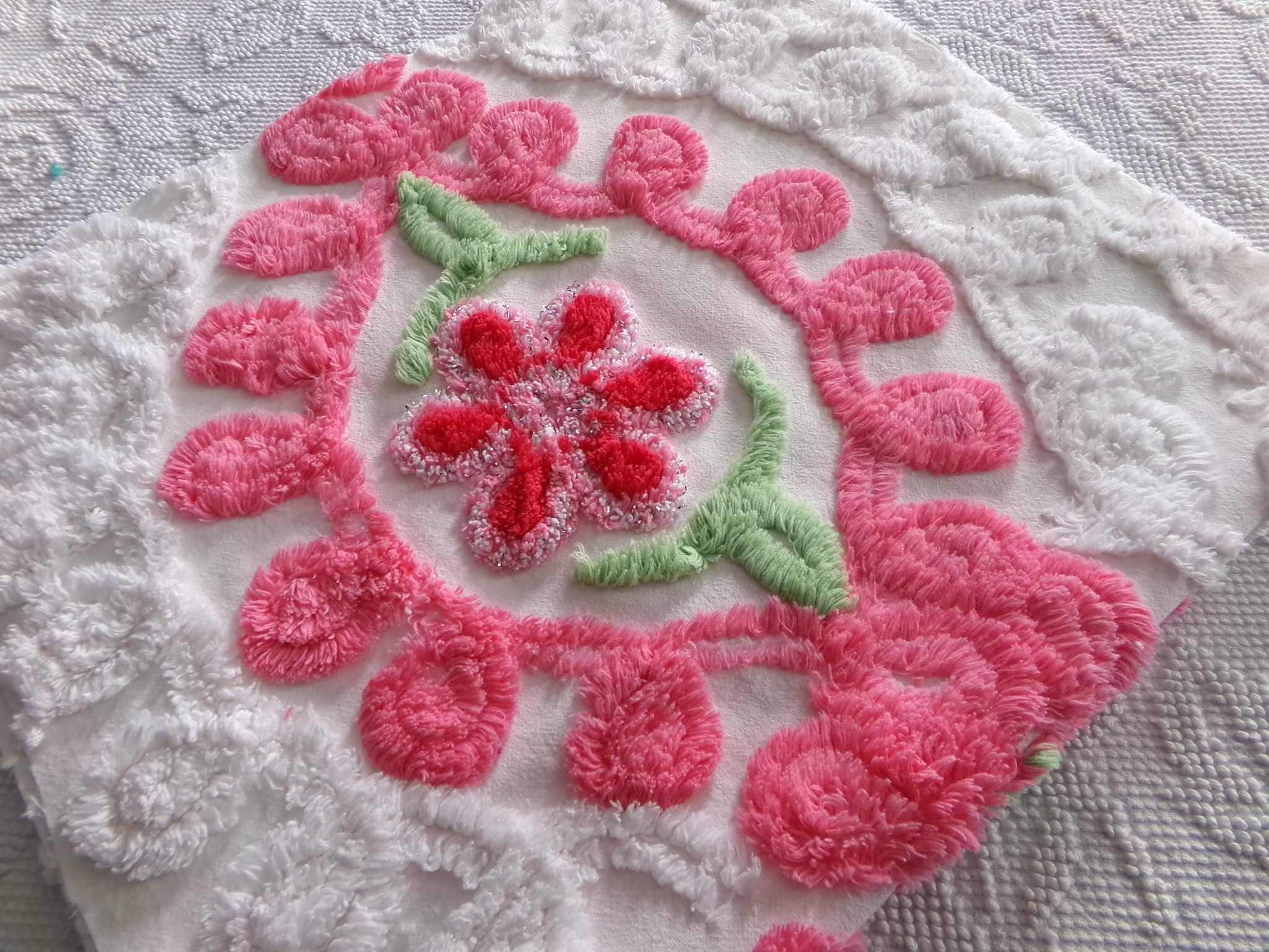 Love the design on this piece of vintage chenille fabric - an hourglass curlicue pattern in white and lipstick pink. Two sparkly flowers are nested in the pink hourglass shape for a memorable presentation. If you look closely, you'll see sparkle silver lurex woven into the pair of flowers.Fabric measures approx 16" x 28" inches. 100% medium weight cotton background, circa mid 1950s. A great piece to inspire your creativity.