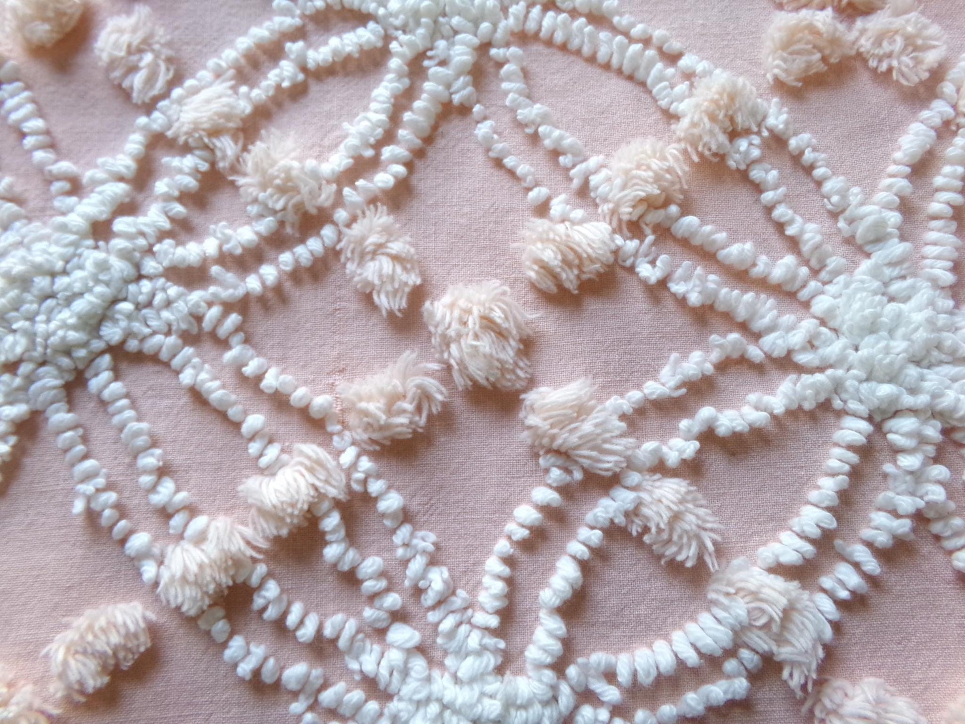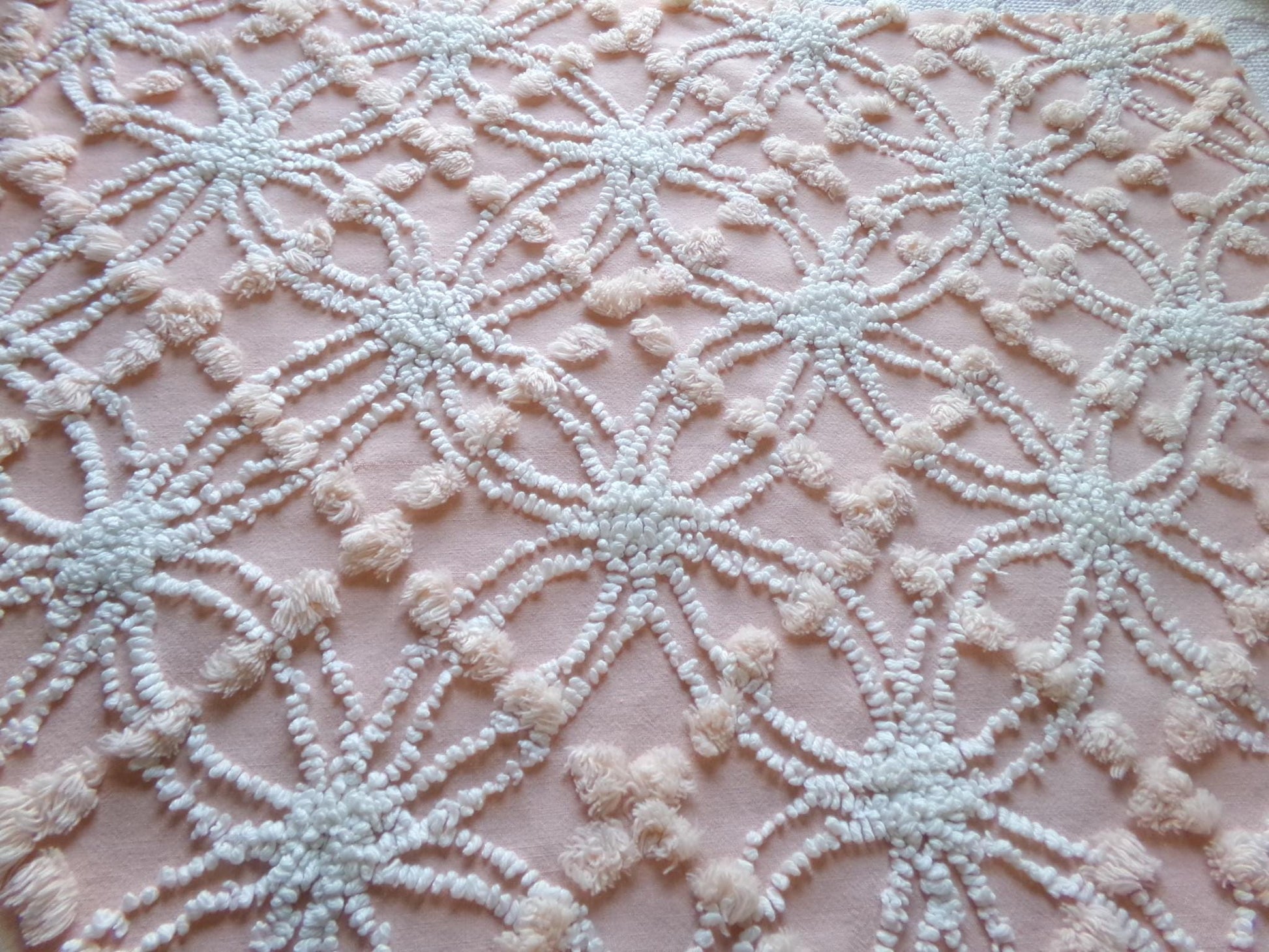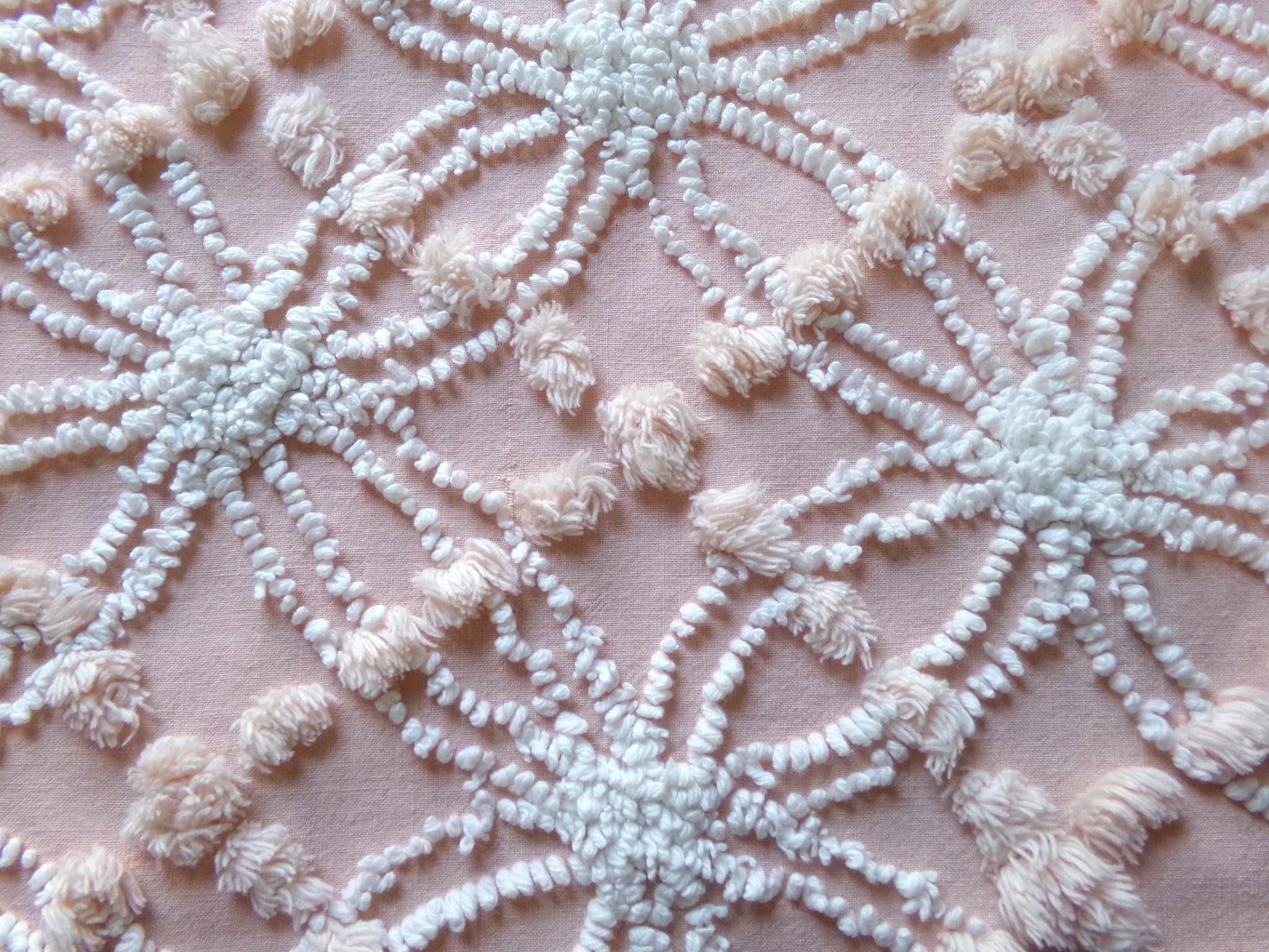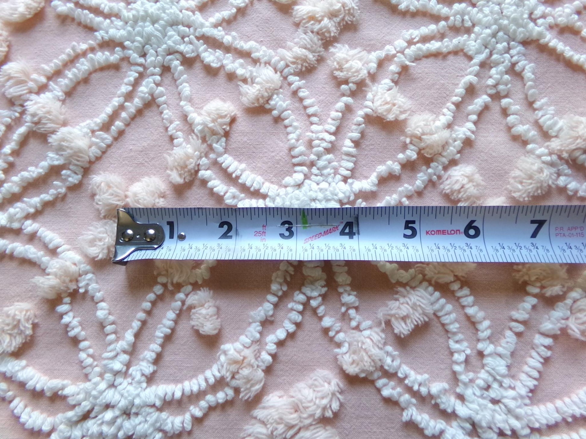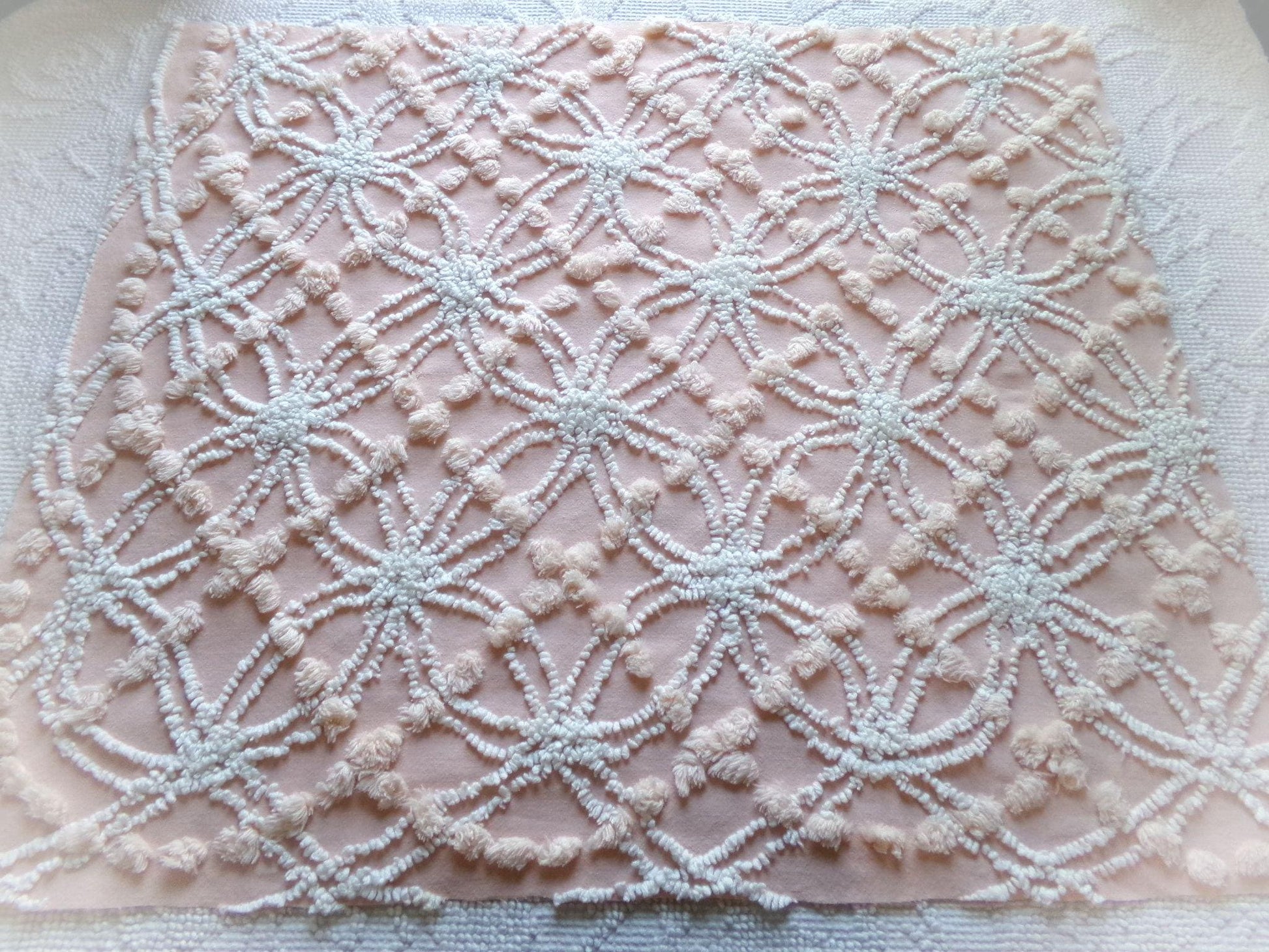 Isn't this such a pretty piece of chenille fabric? It features a popular pattern in a lovely shade of iced peach with contrast white needletuft wedding rings & overtufted pops. This sewing material is cut from an original Cabin Crafts vintage chenille bedspread from the 1940s.20" x 24" approx msmts. 100% cotton. Shabby attributes include small pinholes; see final img.