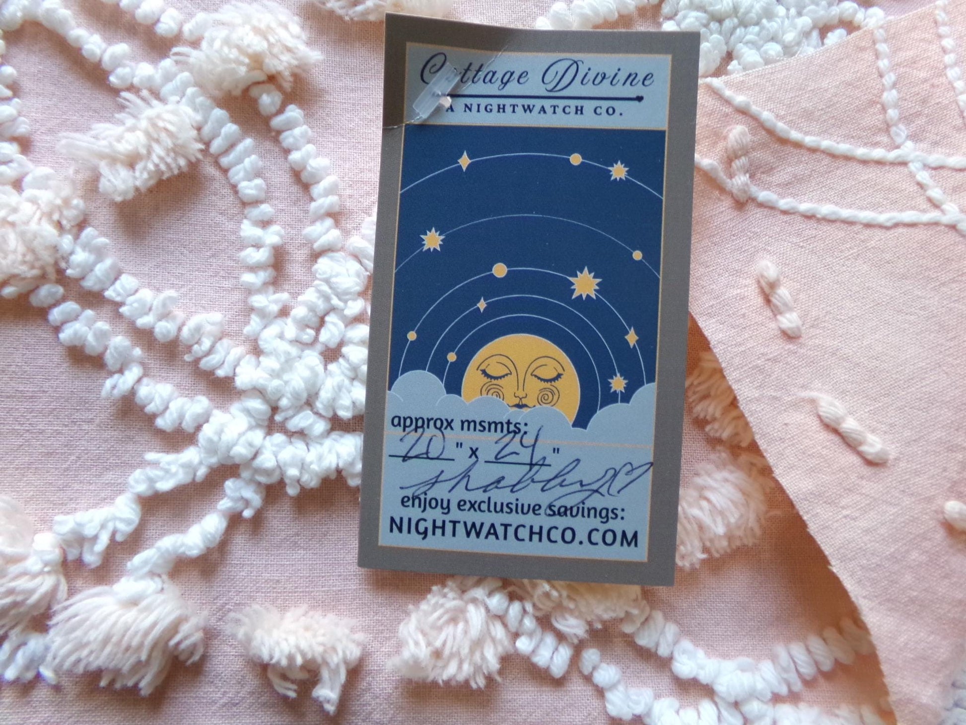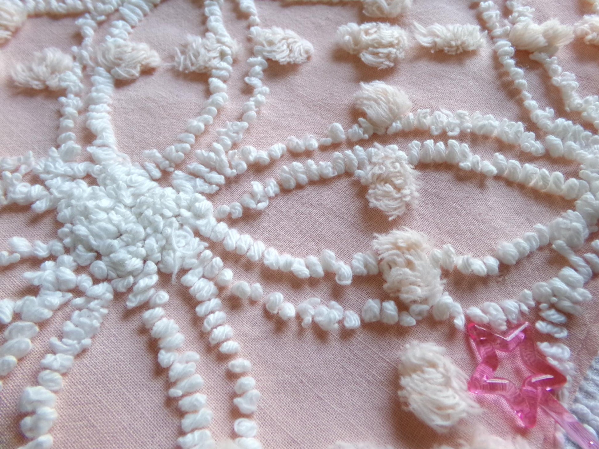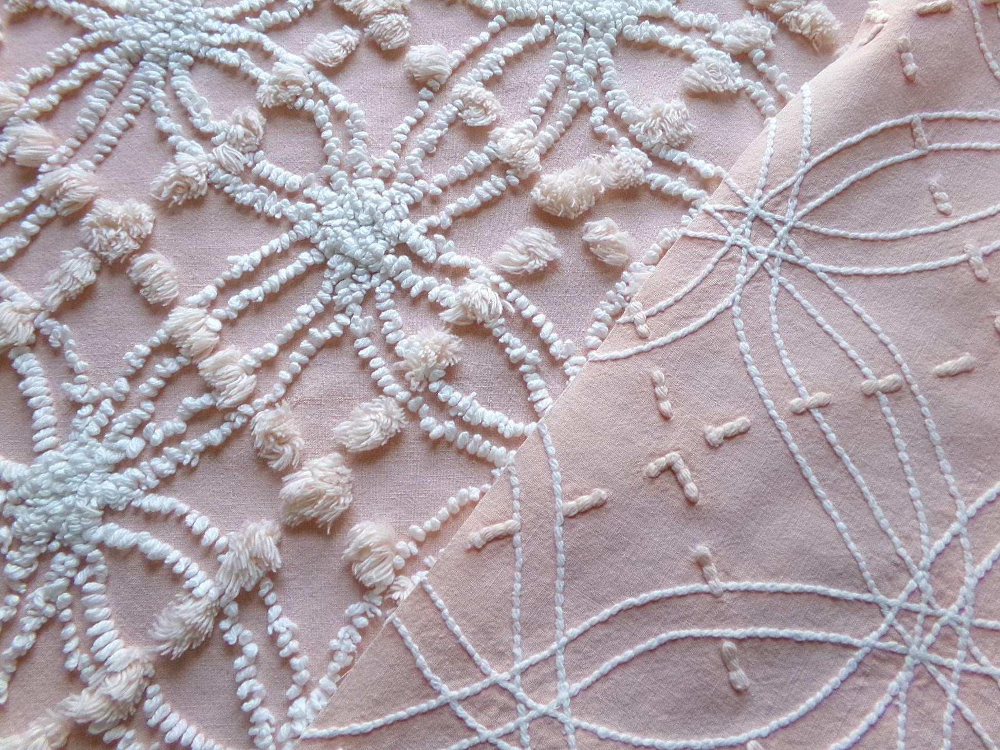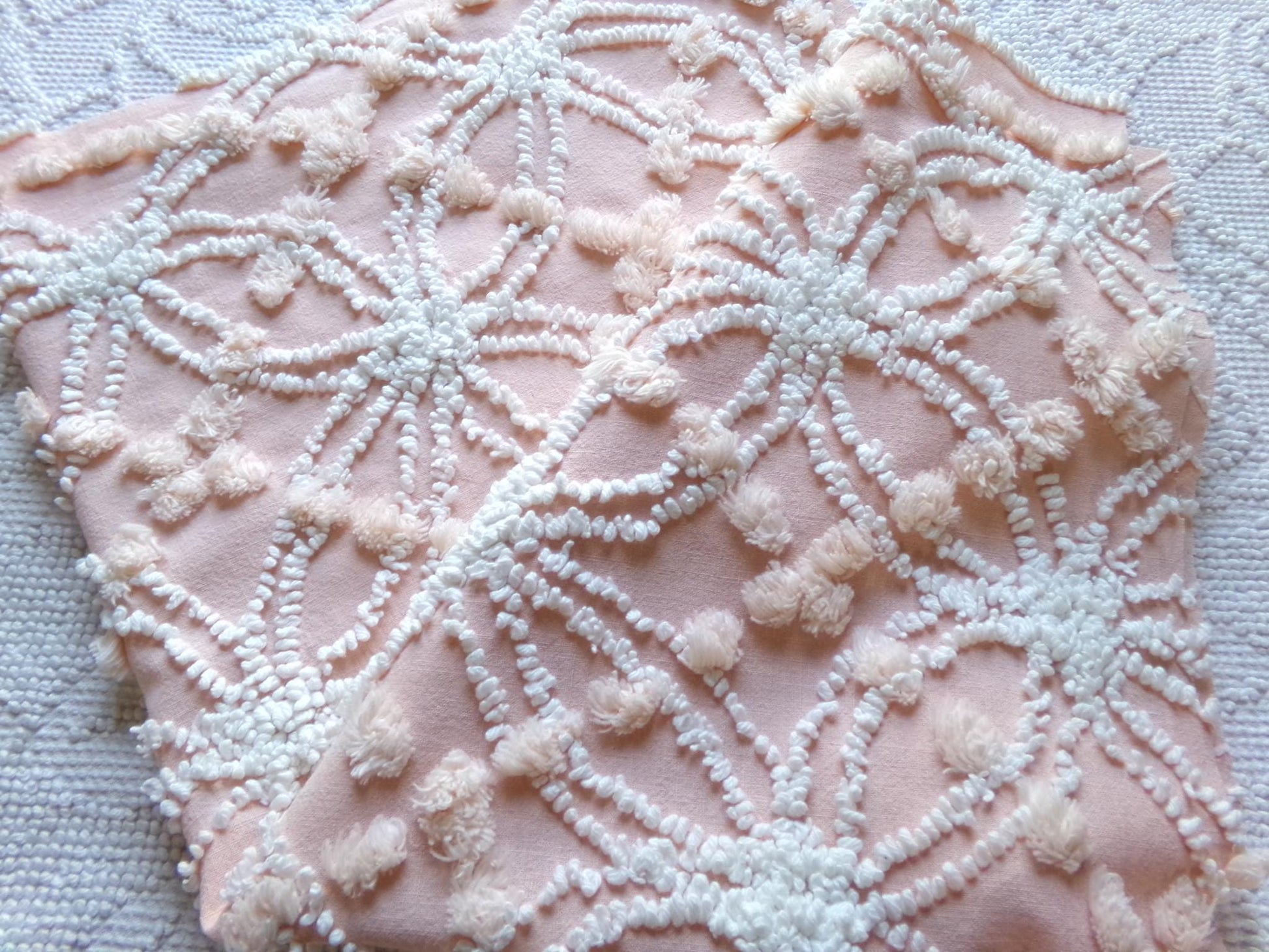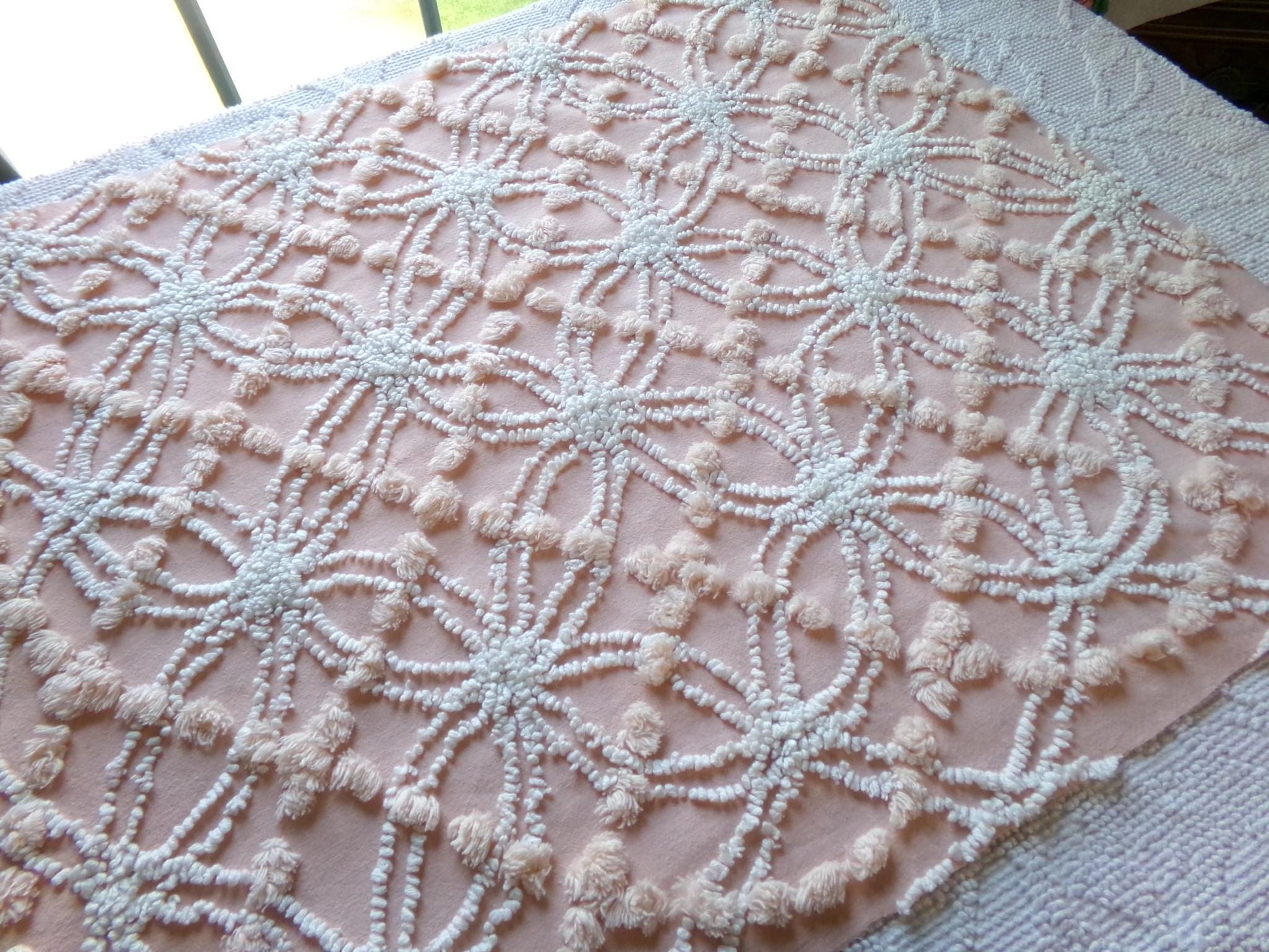 Isn't this such a pretty piece of chenille fabric? It features a popular pattern in a lovely shade of iced peach with contrast white needletuft wedding rings & overtufted pops. This sewing material is cut from an original Cabin Crafts vintage chenille bedspread from the 1940s.20" x 24" approx msmts. 100% cotton. Shabby attributes include small pinholes; see final img.