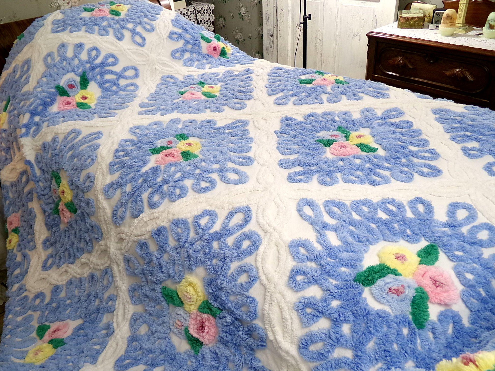 This impossibly beautiful chenille bedspread features the most luxurious, thick sculpted tufting you'll ever see. It's classic cottage chic that exudes a dreamy coastal essence because of the predominant blue coloring on the warm white bkgd.Trios of shabby roses in pink, yellow & blue are wrapped tightly within squiggling geometric diamond shapes in thick sky blue tufting...the weight on the bedspread is so substantial between the incredibly dense chenille tufting, strong cotton groundcloth & accent fringe.