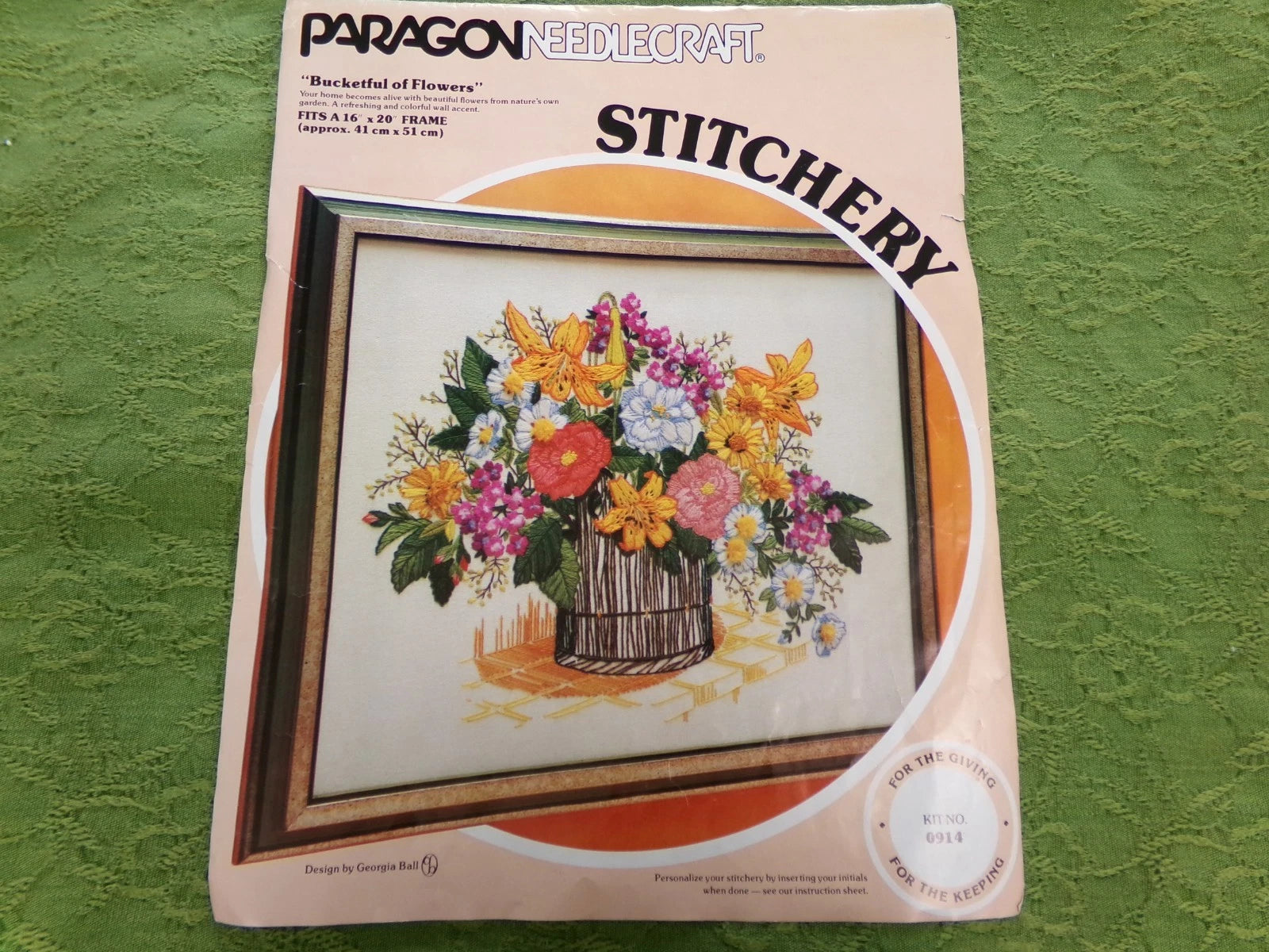 *This listing is for the original paper package insert & accompanying stamped stitch pattern for an old Paragon Needlecraft kit called Bucketful of Flowers. NO EMBROIDERY CANVAS, THREAD, YARN OR OTHER COMPONENTS ARE INCLUDED.*-This was kit # 0914, "Bucketful of Flowers"