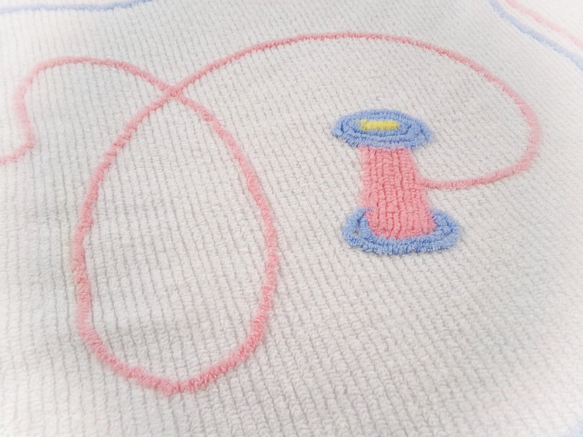 see more, cottagedivine.comWhat an adorable vintage chenille coverlet this is. It is *NOT* a regular size bedspread; rather it is a decorative throw or child's coverlet. A blue cat sporting a pink bow is chasing a spool of thread - it doesn't get more quintessentially cute.