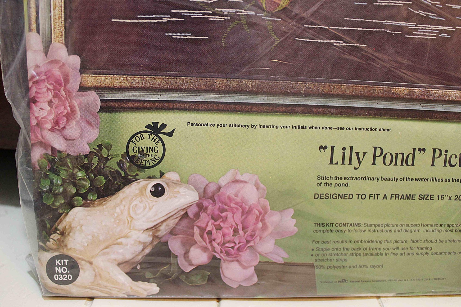 Hard to find vintage Paragon Needlecraft crewel kit "Lily Pond Picture" - Stitch the extraordinary beauty of the water lilies as they gracefully rest upon the calm waters of the pond. Design by Georgia Ball.Intended to fit a frame size of 16" x 20" (not included). Paragon Creative Crewel Stitchery Kit # 0320.
