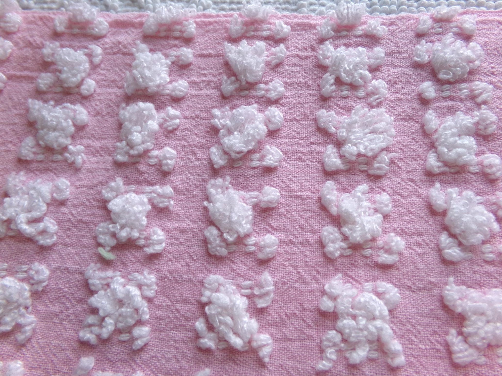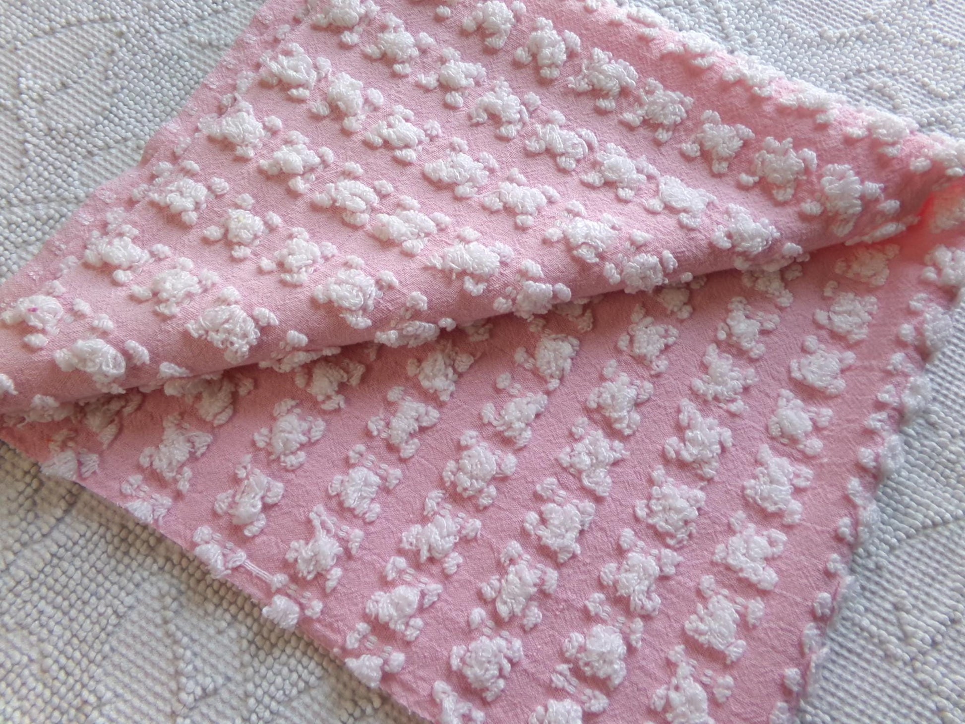 Infuse instant cottage charm with this 19" x 25" piece of beautiful chenille fabric. Snowy white loose weave rosebuds grace a carnation pink background with natural, gentle ombre color variations (see img #2). A challenging color to capture because it adapts very well to light.This popular lightweight, feminine vintage fabric incorporates beautifully in handmade quilts and DIY pillows. Cotton blend material.