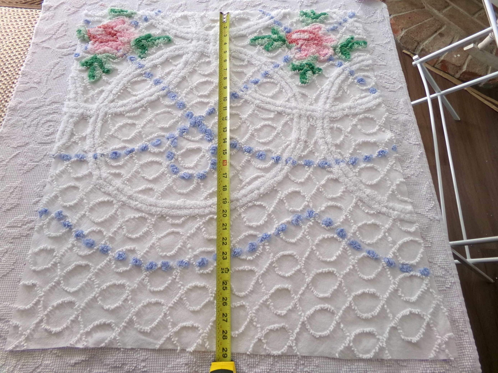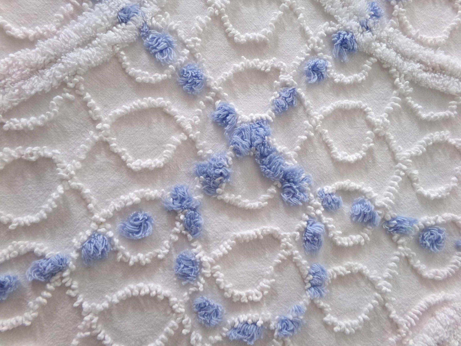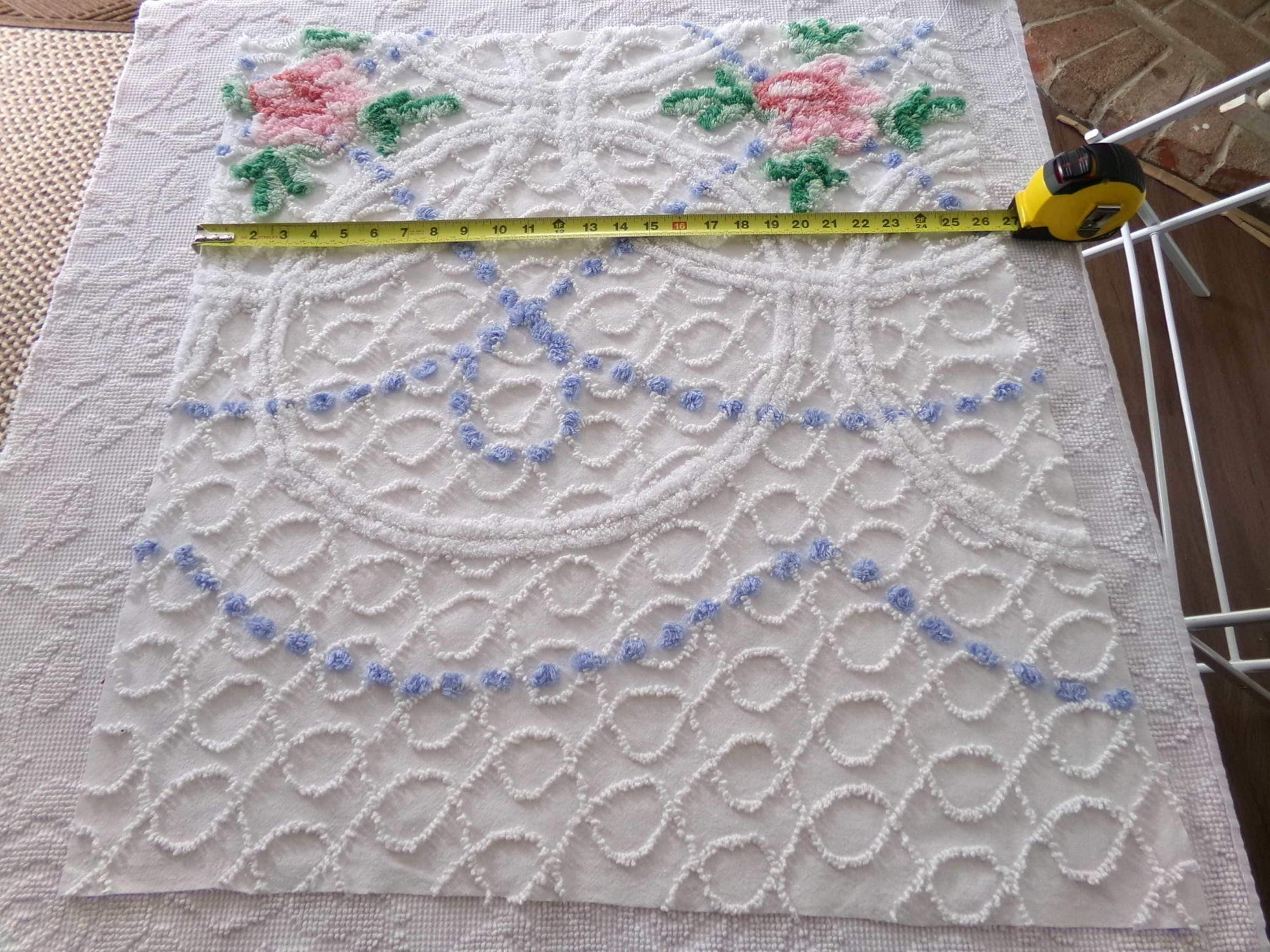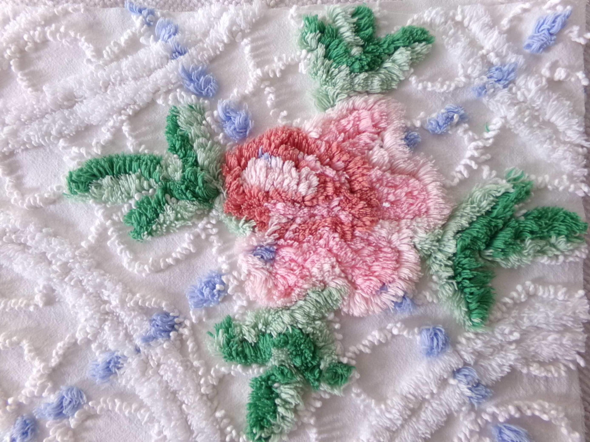 This vintage style chenille fabric is one of our most popular, featuring a pair of pink roses at the top of the piece, accented by an elaborate display of needletufted loops, circular designs and blue pops. So pretty in a variety of sewing and craft projects, where it will add instant cottage style charm. Piece measures approx 25" x 28" inches, irregular shape. 100% quality vintage style cotton. Common to the fabric, there are a few skipped/pulled tufts. w h y - v i n t a g e? Incorporating vintage fabric into your project brings unique benefits: an unparalleled charm, a whisper of nostalgia...a deep-rooted history embedded in every fiber. Not only is the quality often superior to modern, vintage fabric is a sustainable choice - an eco-friendly option that stands out in a world consumed by mass-produced goods. For your next cherished design, think vintage 3 w h a t - t o - k n o w - this is a vintage fabric piece, not an entire bedspread - expect vtg attributes such as age spots, pulled threads, color variances, etc. - items are laundered/stored near fragranced products -ALWAYS color test fabric to ensure it doesn't run. Most vintage fabrics ARE NOT colorfast; this is a particular risk in vintage reds, bright pinks, indigo blues & other vivid colors. - combined shipping available; overages over $1 refunded t h e - c o t t a g e - d i v i n e From the tiniest quilt square to elaborately tufted chenille bedspreads & lovingly handcrafted robes, we are committed to honoring the legacy of this beloved textile.