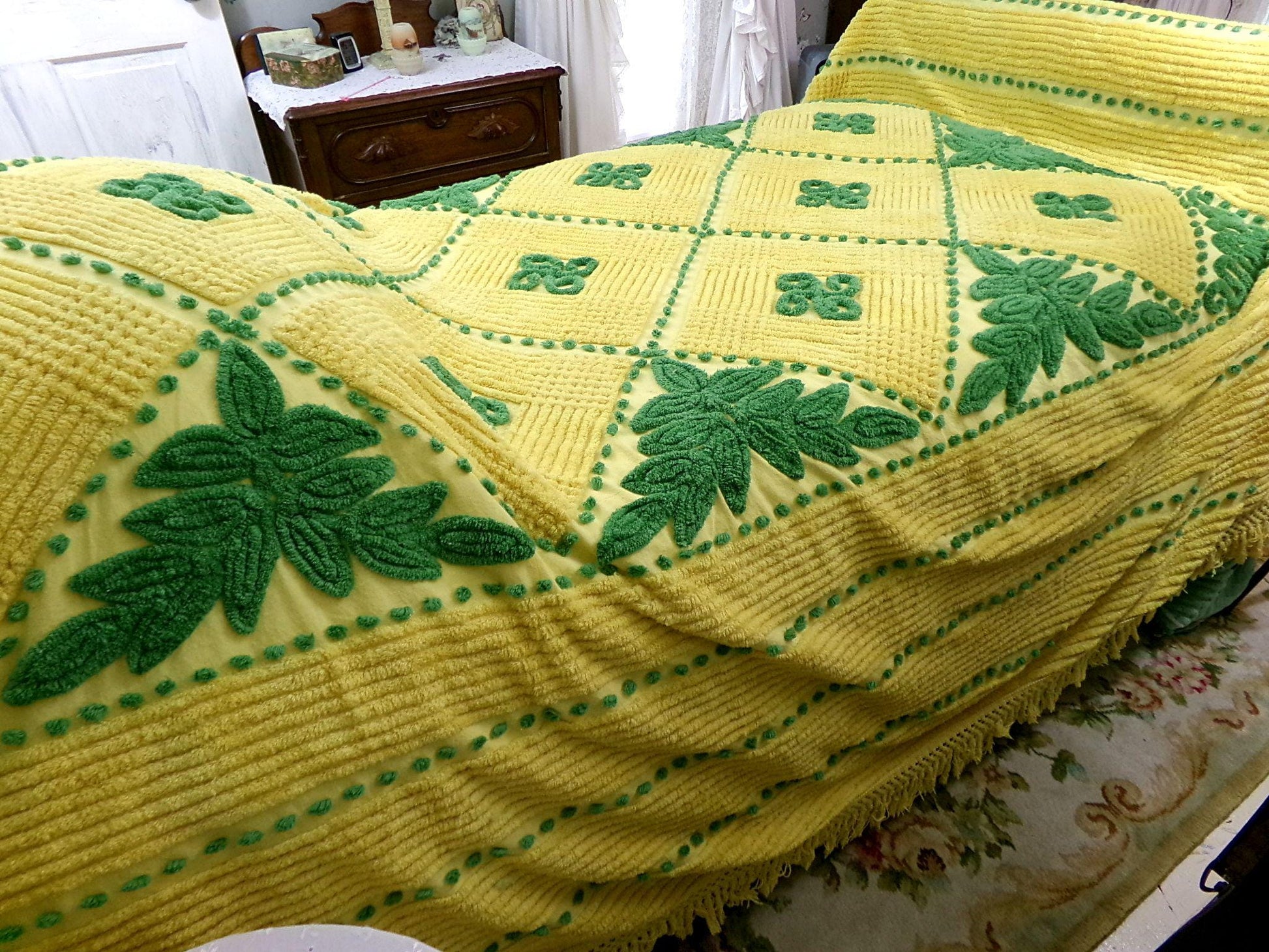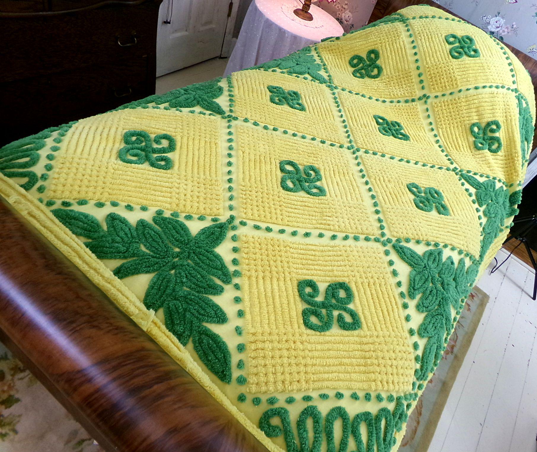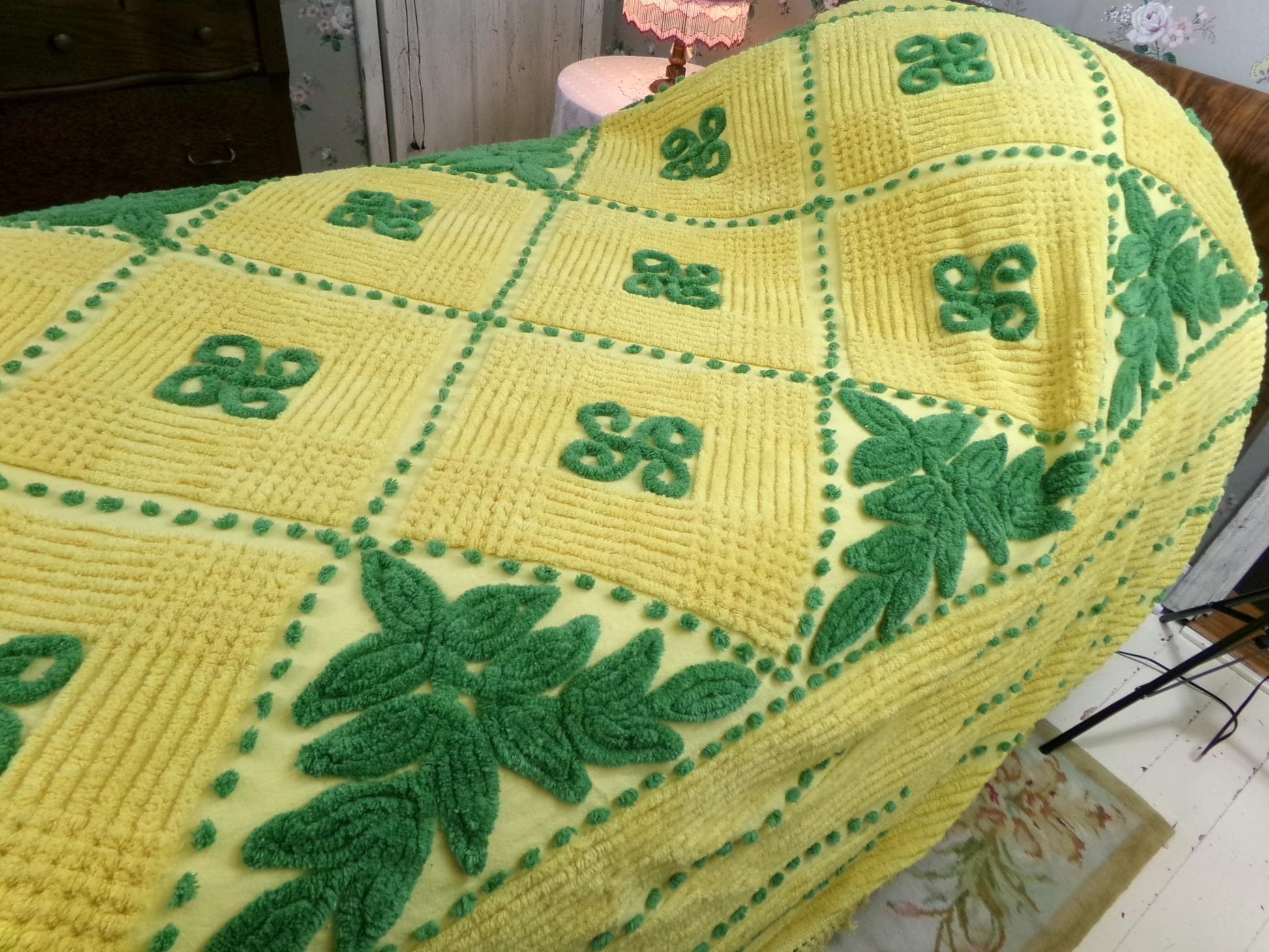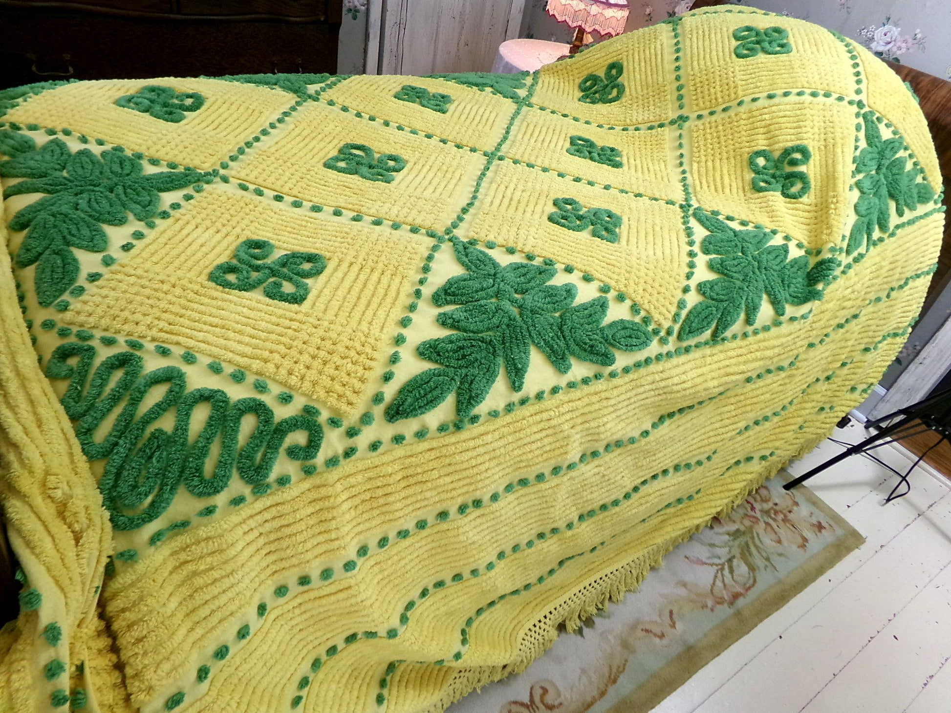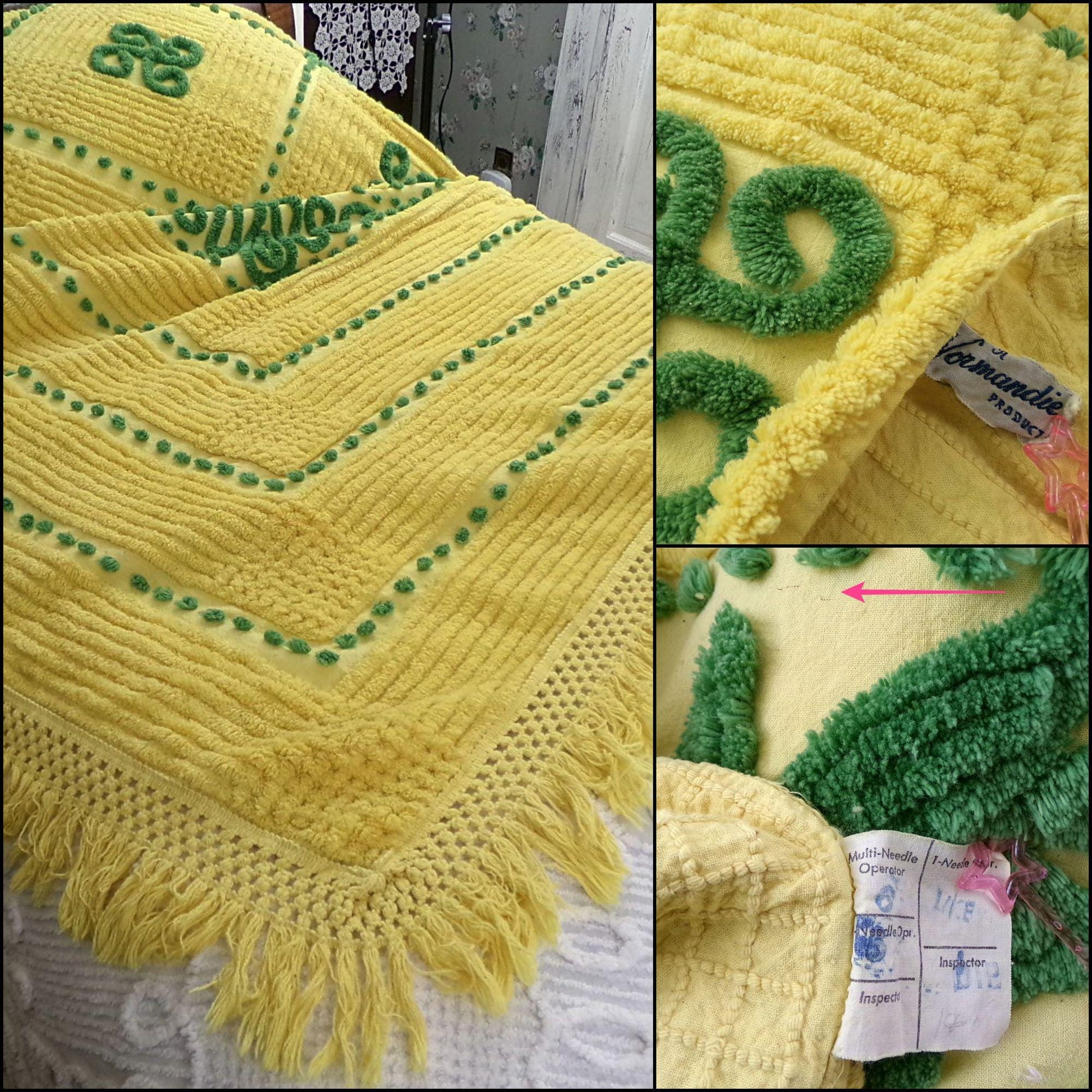 What a treasure this vintage chenille bedspread is. I'm quite sure that if a lucky little leprechaun were to pick a favorite bedspread, this one might top the list ;) It features rich emerald green tufting that contrasts with sunny yellow, accented by fringe along the drop sides.The colors are vivid, saturated and very unique. And, the bedspread even still has both its original Normandie brand cloth tags attached as seen final img. It is a beautiful vintage linen for the collector, or to make a bold statement with a vivid pop of color in your home.