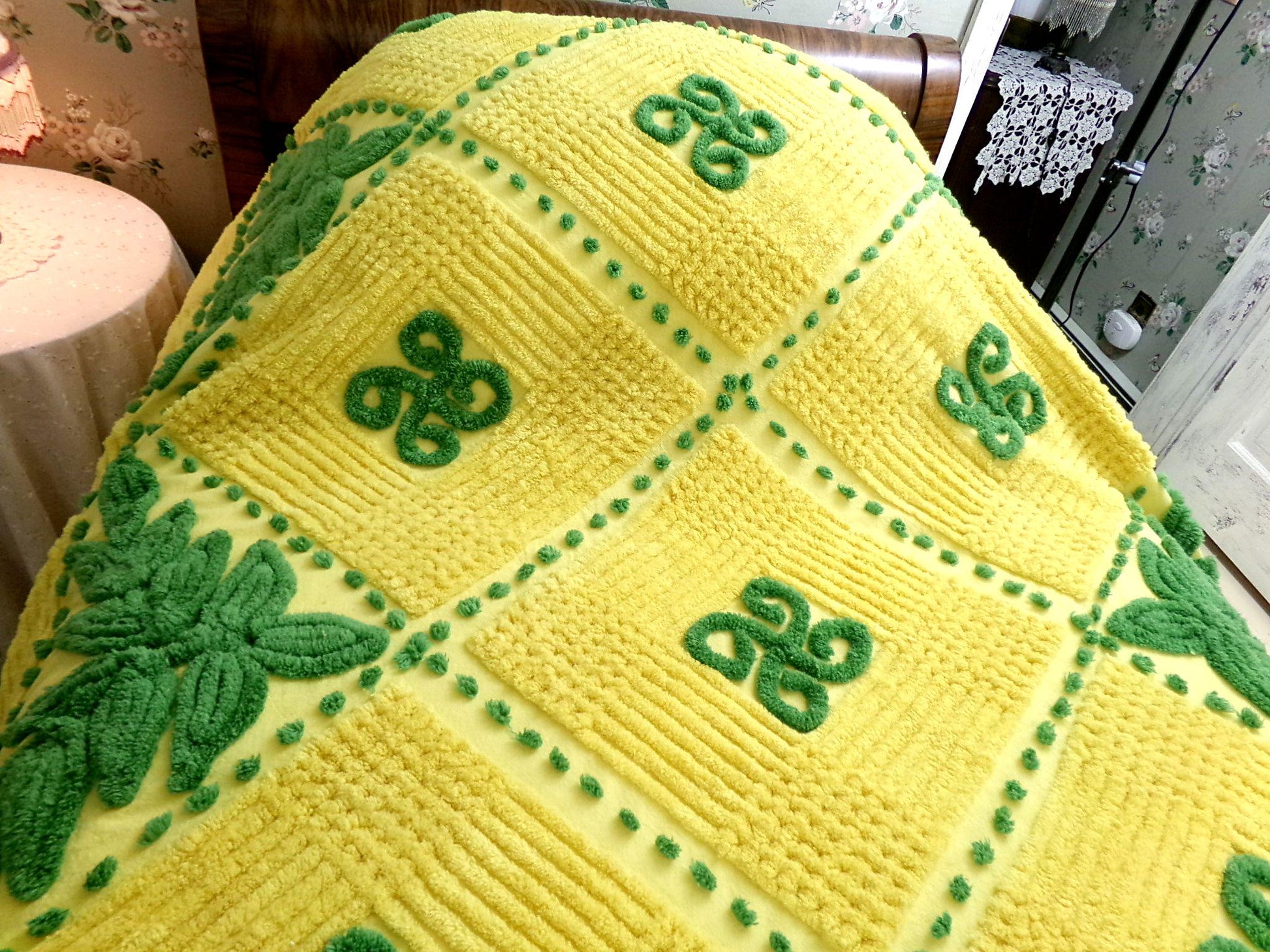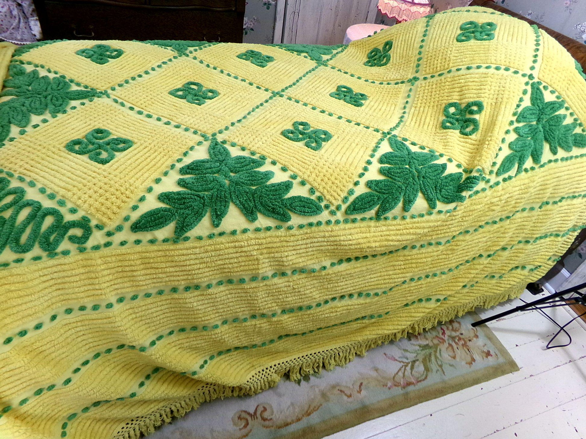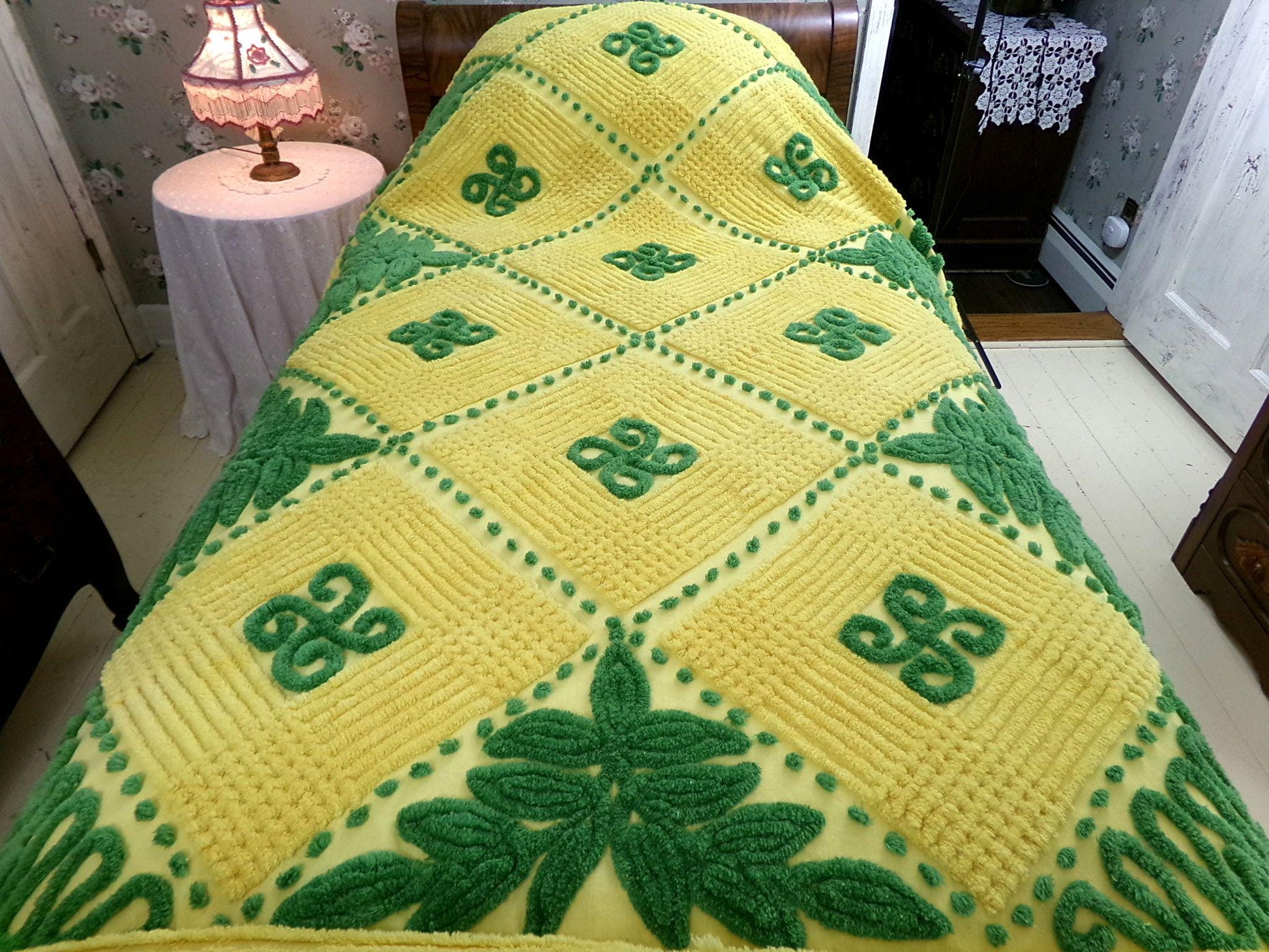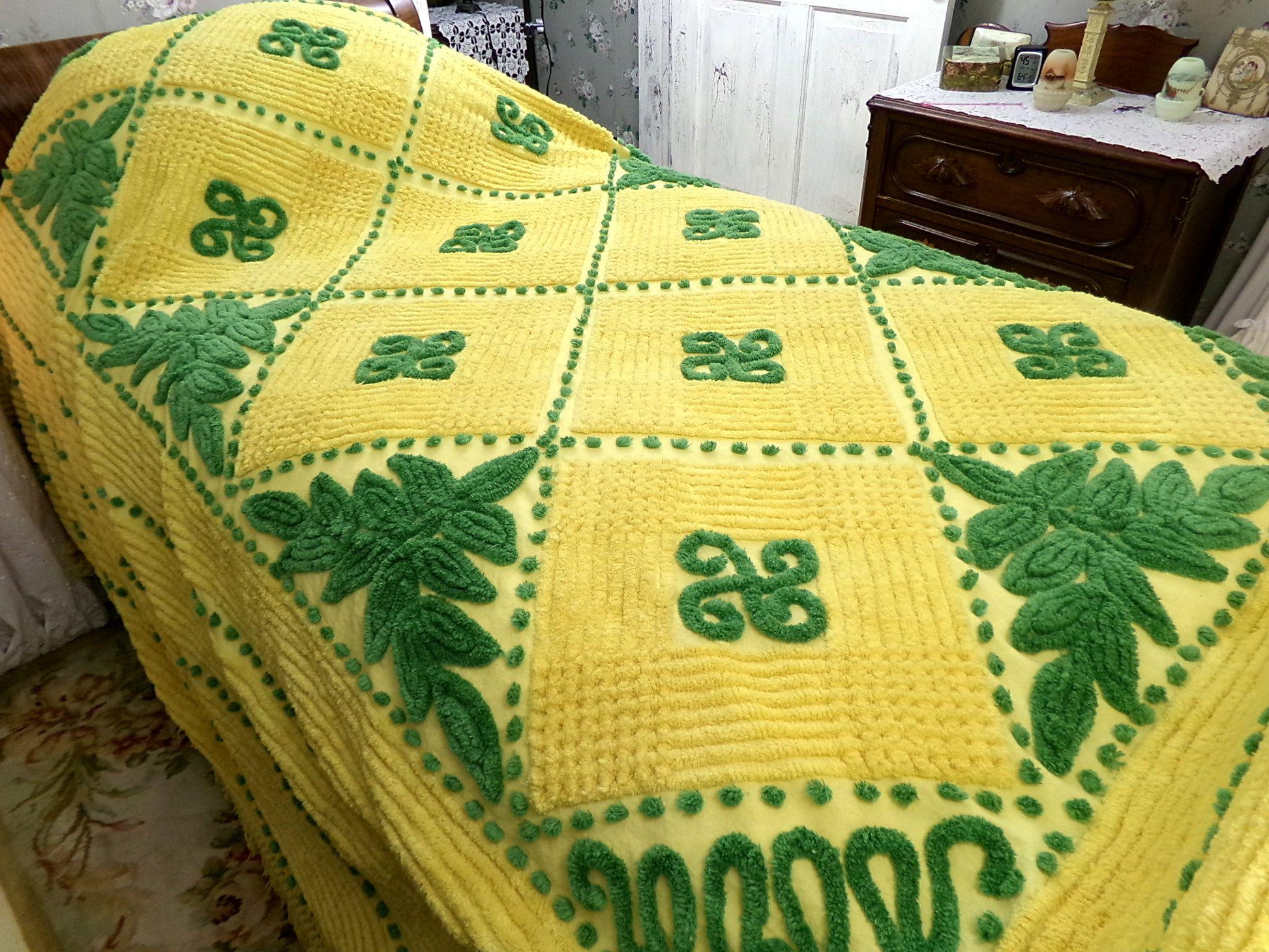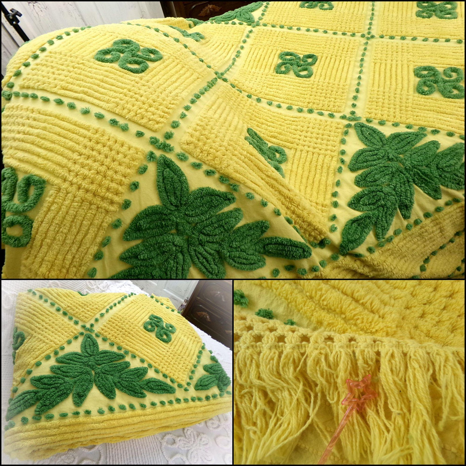 What a treasure this vintage chenille bedspread is. I'm quite sure that if a lucky little leprechaun were to pick a favorite bedspread, this one might top the list ;) It features rich emerald green tufting that contrasts with sunny yellow, accented by fringe along the drop sides.The colors are vivid, saturated and very unique. And, the bedspread even still has both its original Normandie brand cloth tags attached as seen final img. It is a beautiful vintage linen for the collector, or to make a bold statement with a vivid pop of color in your home.