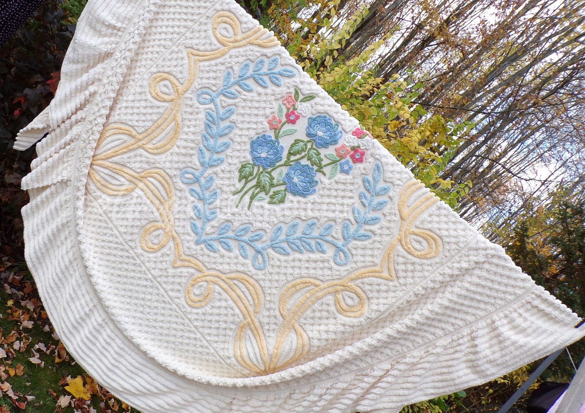 Experience the heirloom luxury of vintage chenille in all its glory with this amazingly beautiful FULL size bedspread. This beauty is *extremely* heavy - one of the most thickly tufted spreads I've ever owned - loaded with intricately stylized garden wildflower florals in cottage colors. All set on a heavy buttercream cotton background with a unique texture.With it's boxed fit design and integrated ruffle skirt, this will only be suitable on a Full/Double bed. Approx msmts are: 55"W & 78"L across center section; skirt is 20"L. The ruffled part of the skirt specifically measures 9.25"L, while the "boxed" section above it is about 11". Factory cutouts at headboard area.