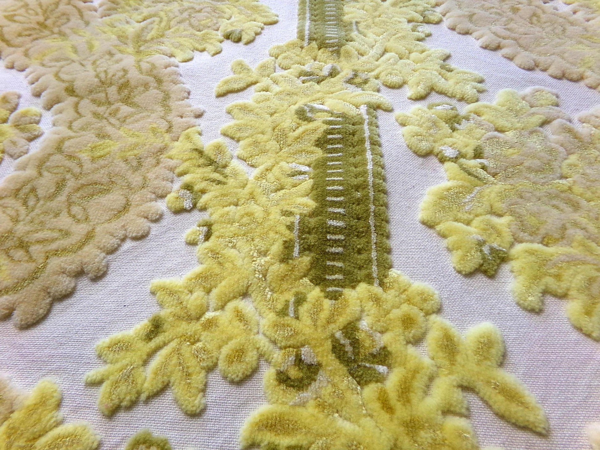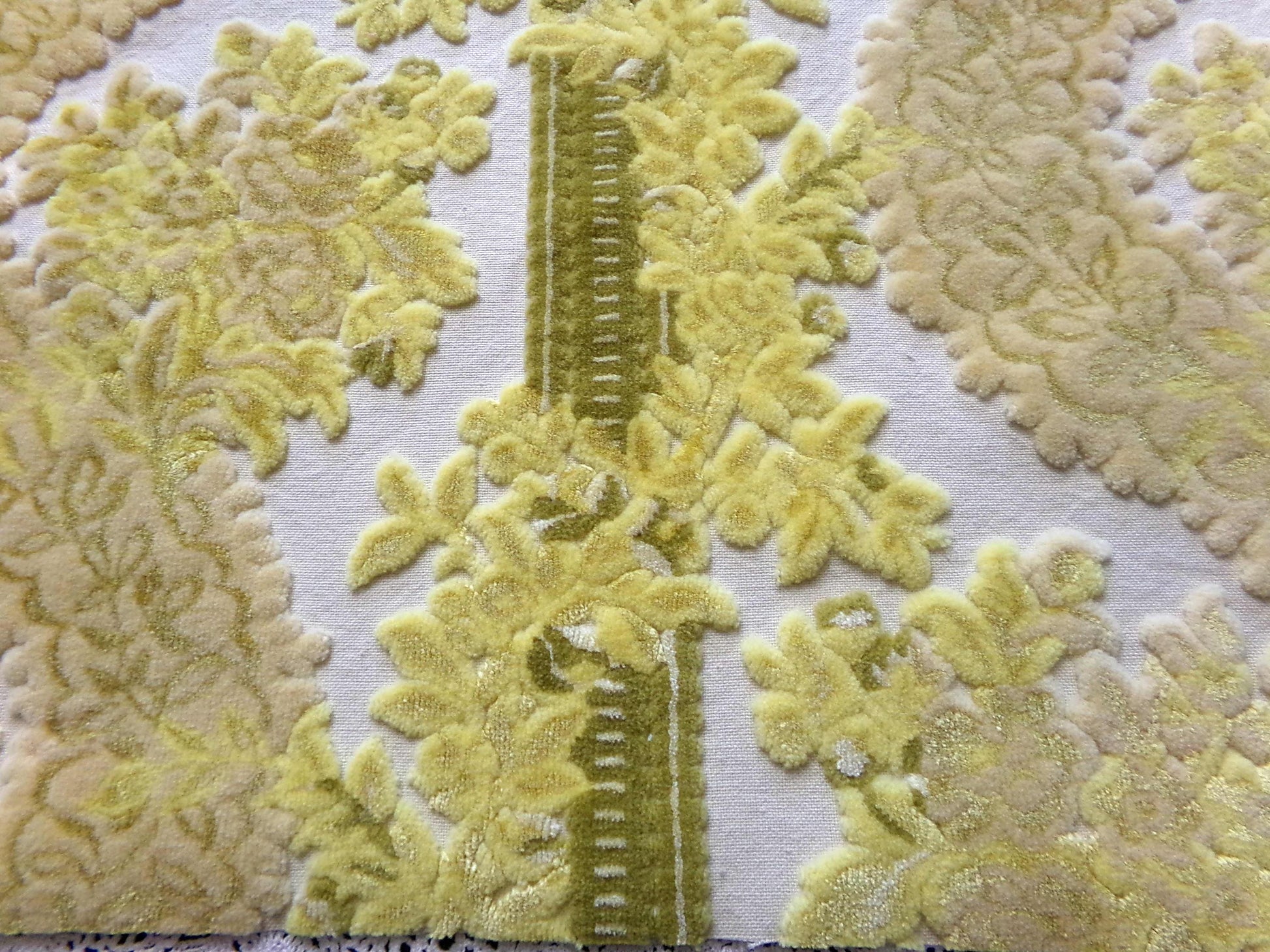 A 20" x 22"-inch piece of vintage Bates luxury cut velvet fabric in one of their most elusive patterns and colorways. This striking design emphasizes warm, rich yellow-golds with hints of olive in the right light. Look closely & you'll see hints of flecked shimmer.A deep spectrum of colors come together to capture light - the swirling scrolls that move from top to bottom adapt beautifully to light and have an ombre effect. This is not natural sun fade, but rather Bates' natural color spectrum. A few small marks to the fabric, see final img- actual piece you'll receive is pictured; all photos taken in natural light