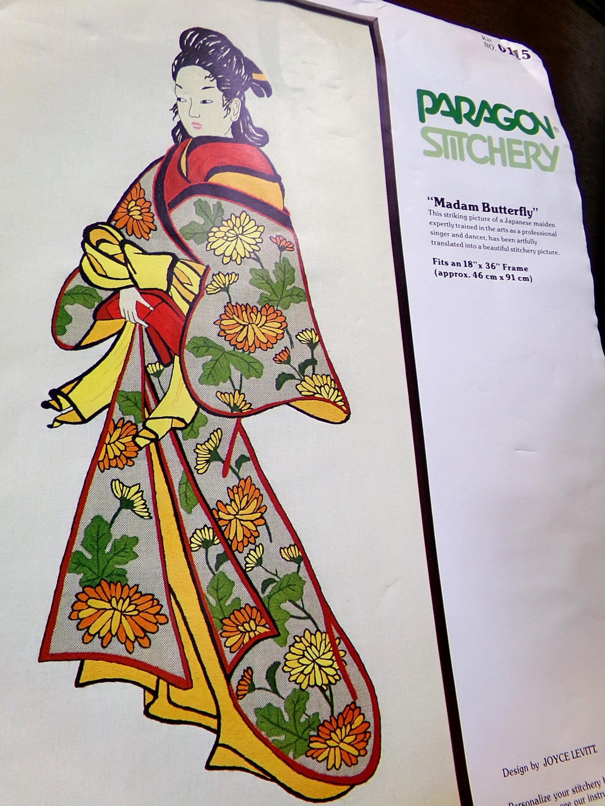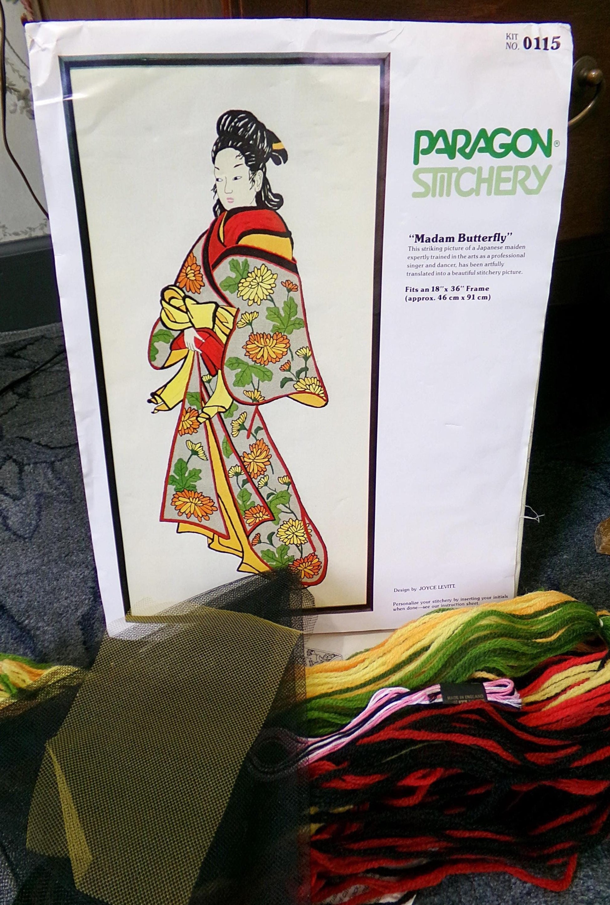 MADAM BUTTERFLY..."This striking picture of a Japanese maiden expertly trained in the arts as a professional singer and dancer, has been artfully translated into a beautiful stitchery picture."• Paragon Stitchery Crewel Kit #0115