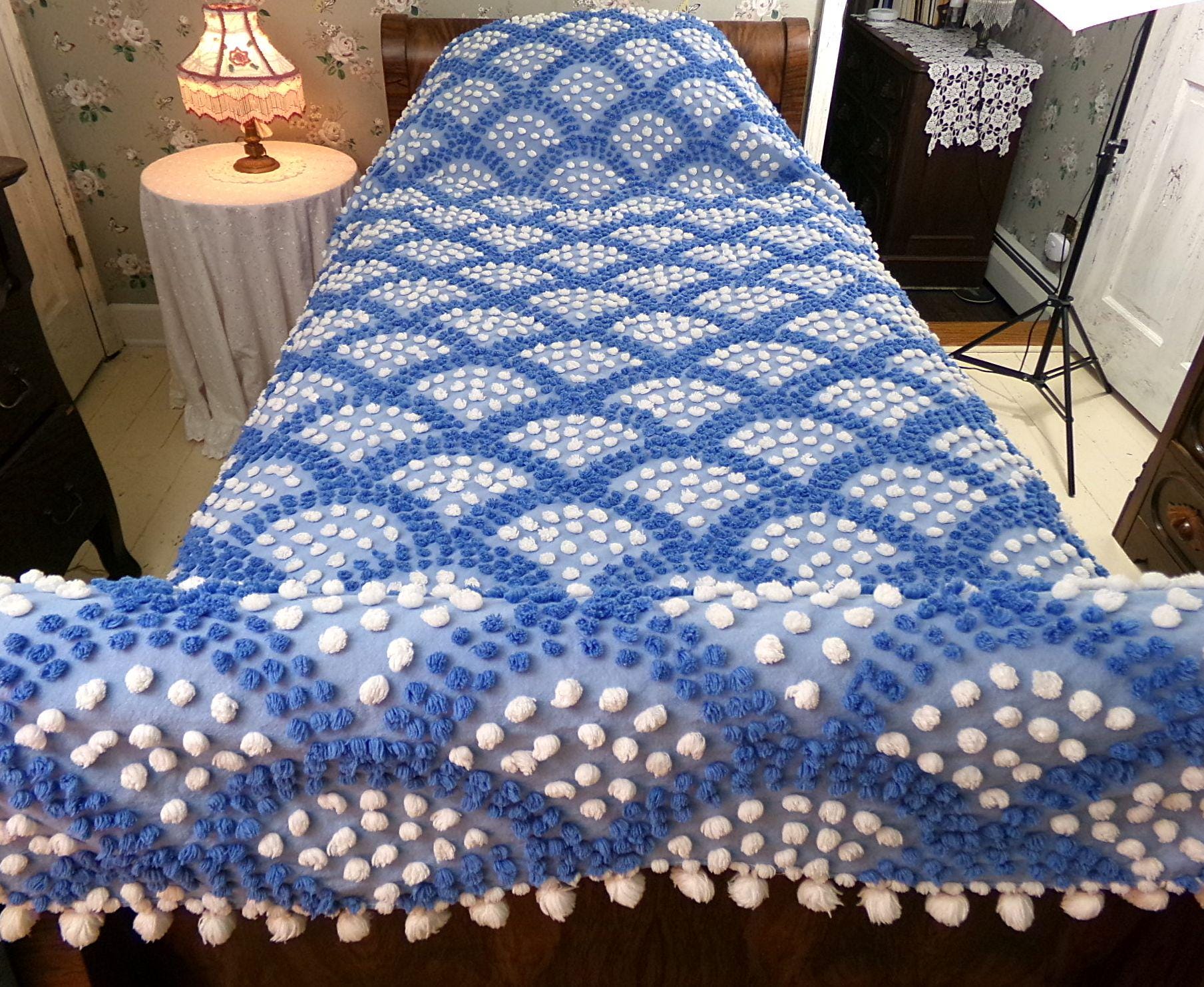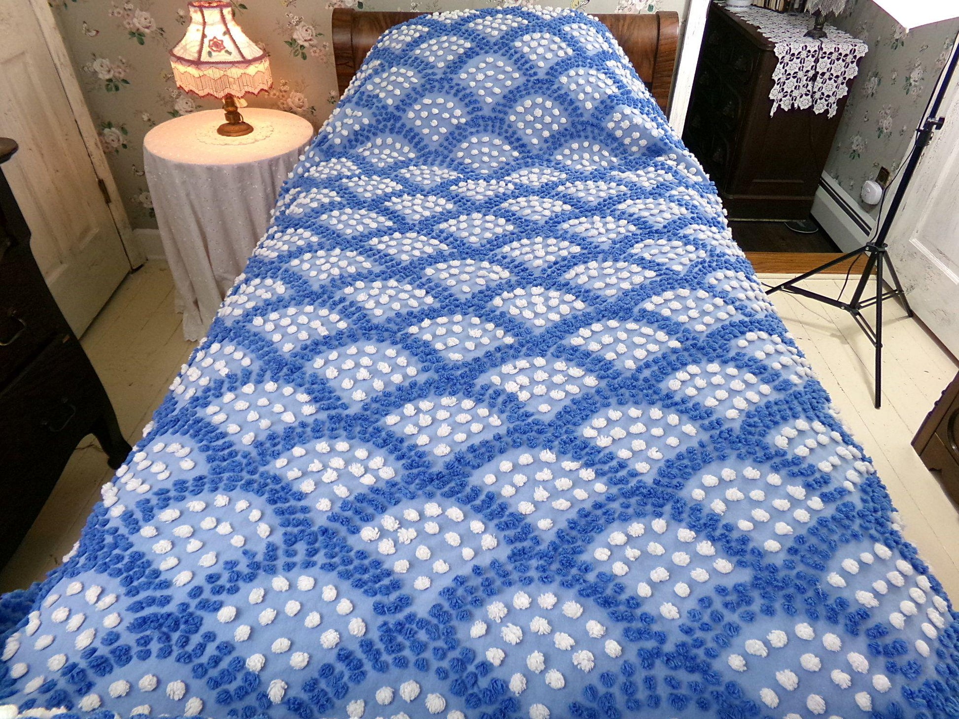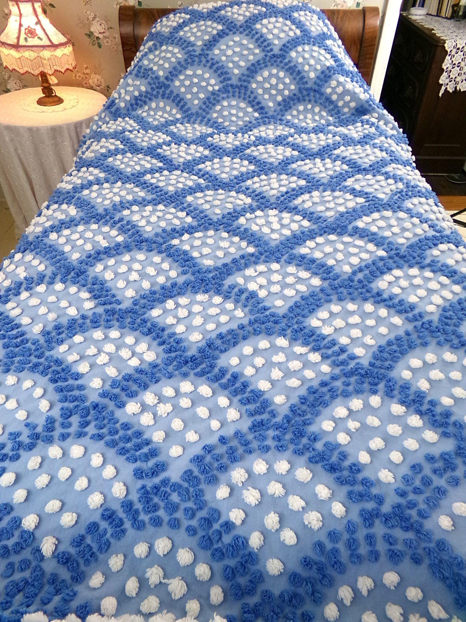 see more, cottagedivine.comThis is an exquisite, handmade antique chenille bedspread in a delightful scalloped shell pop design that resembles a whimsical depiction of ocean waves. The deeper shade of blue pops contrasts with the serene lake blue cotton groundcloth and sweet white pops for a stunning display.