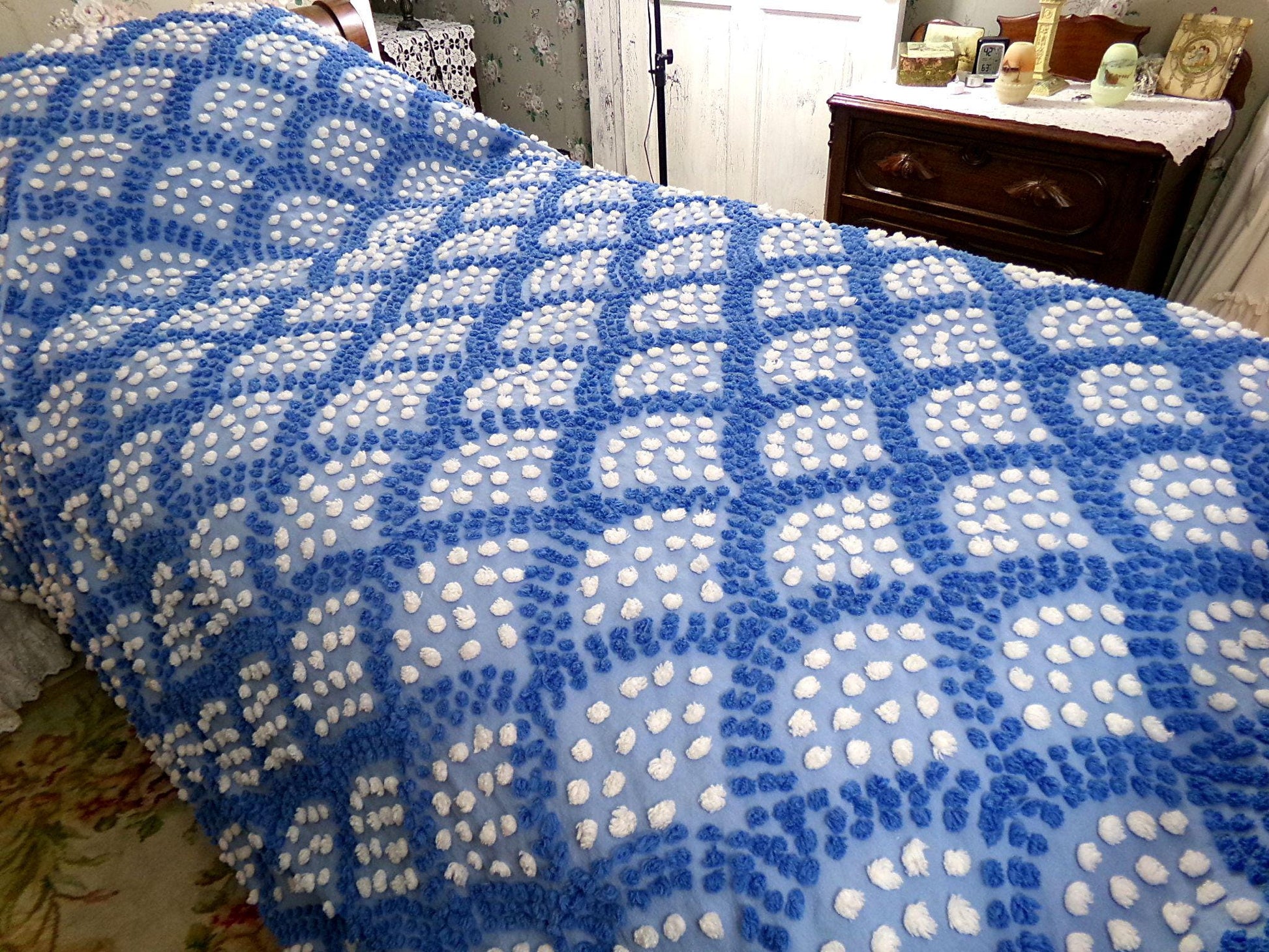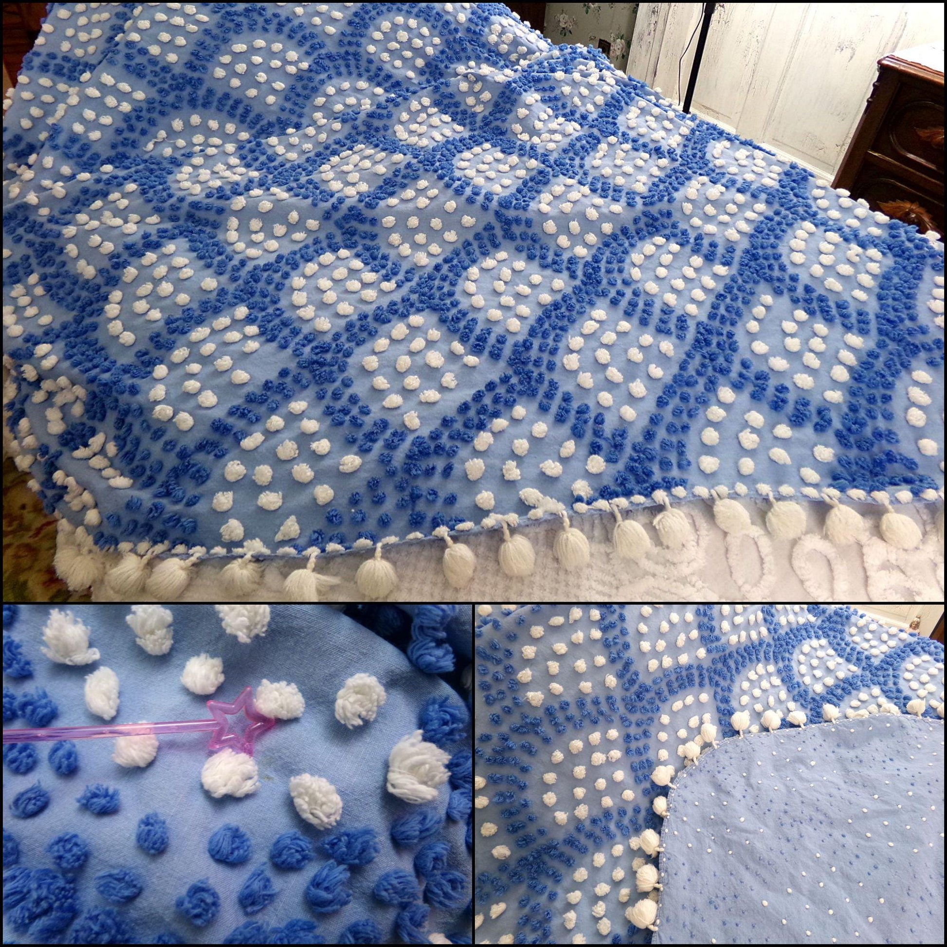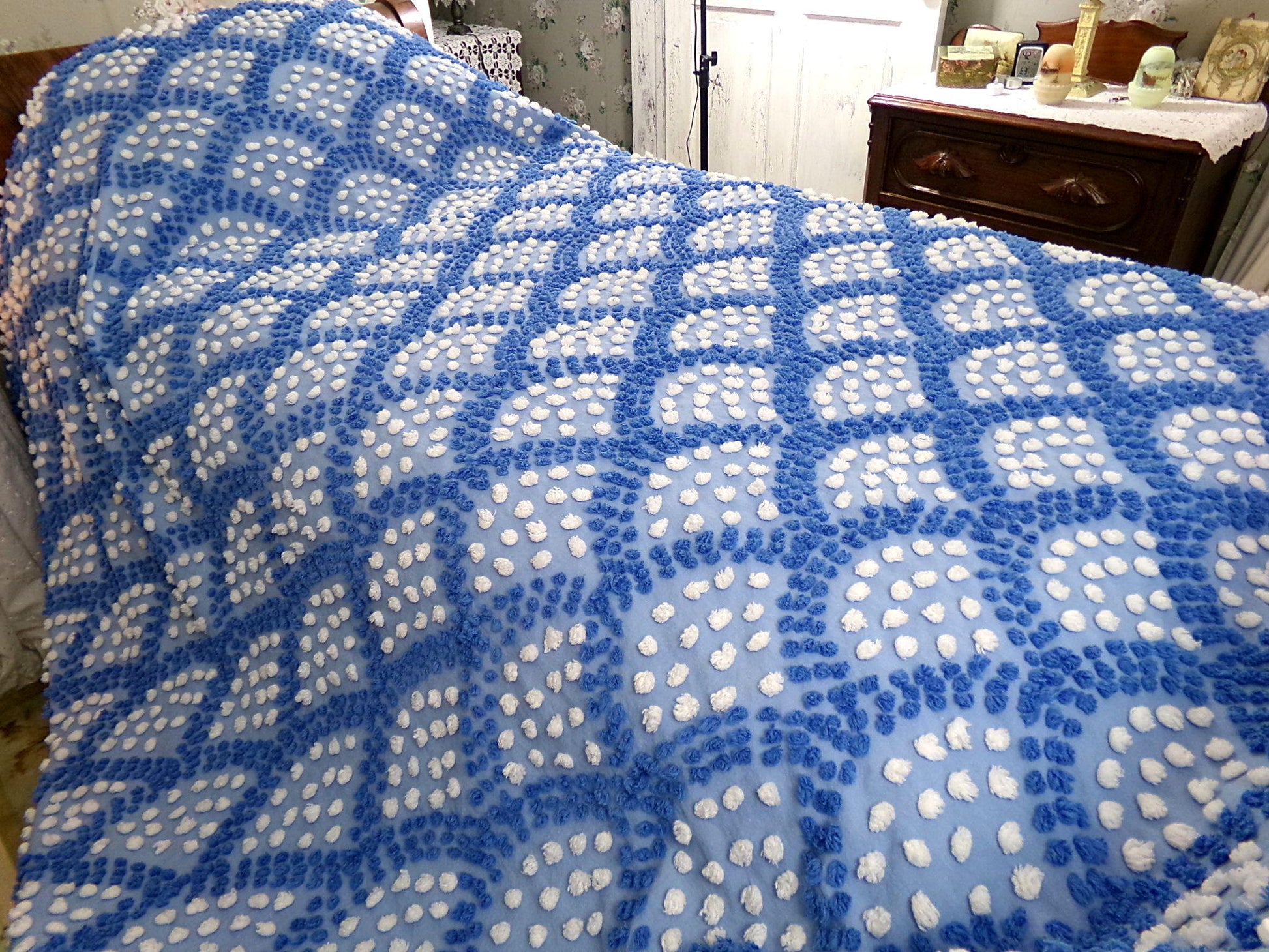 see more, cottagedivine.comThis is an exquisite, handmade antique chenille bedspread in a delightful scalloped shell pop design that resembles a whimsical depiction of ocean waves. The deeper shade of blue pops contrasts with the serene lake blue cotton groundcloth and sweet white pops for a stunning display.