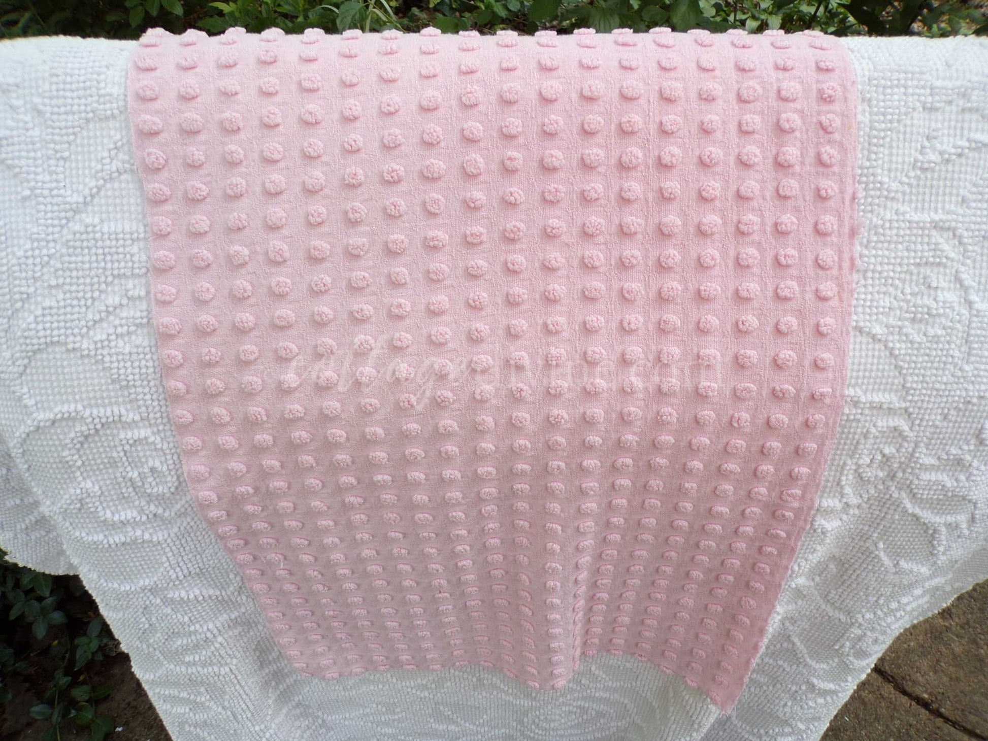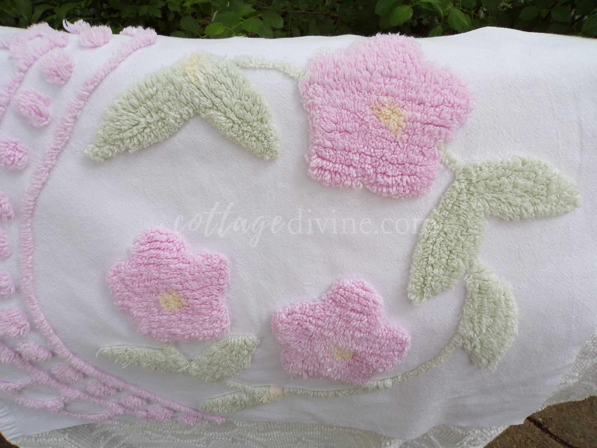 Both pieces sourced from beautiful chenille bedspreads in quintessentially cottage chic colors. So pretty to inspire your quilt or small craft project. Few light age marks; see final img.