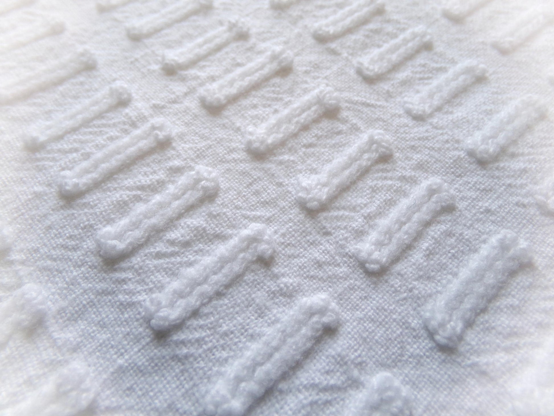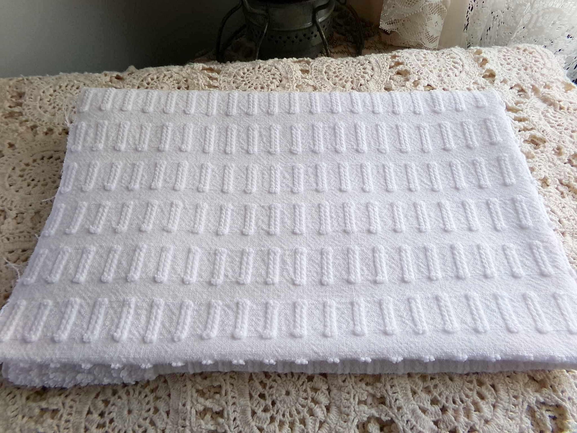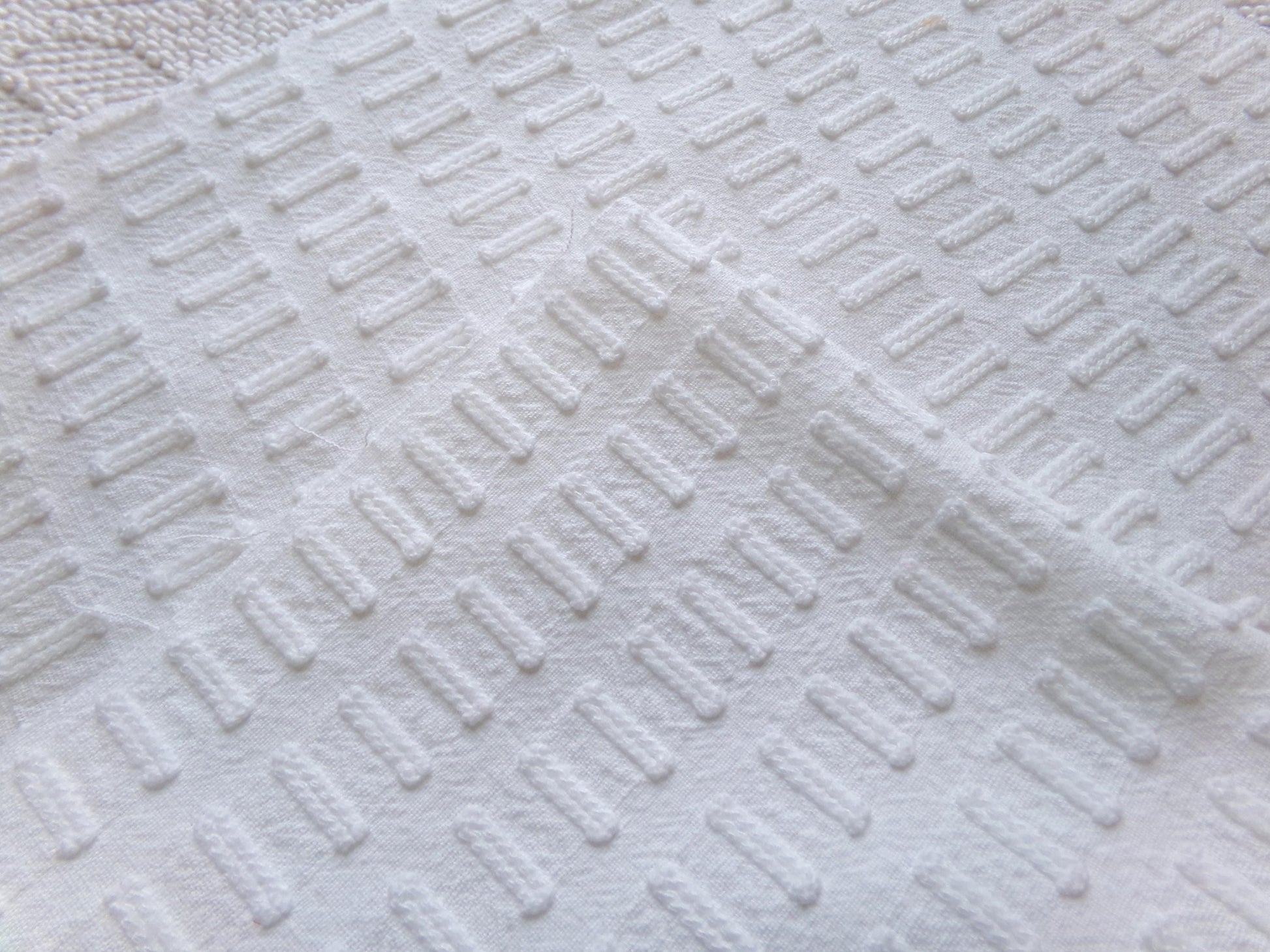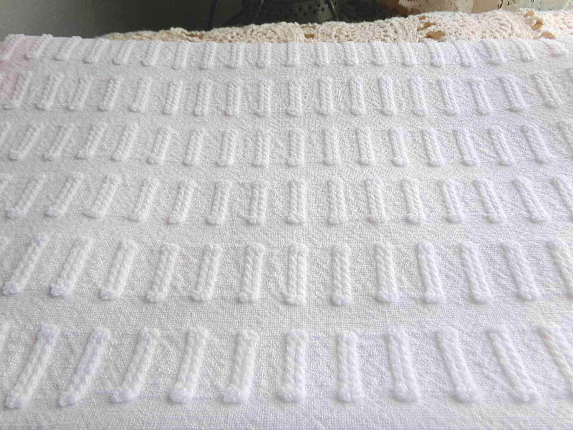 see more, cottagedivine.comGreat piece of minimalist white chenille fabric in a simple, slightly raised "buttonhole" design. A great way to add just a bit of textural interest without overpowering your project.