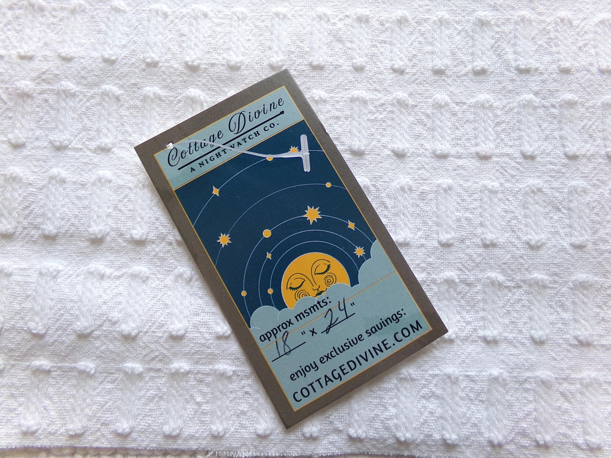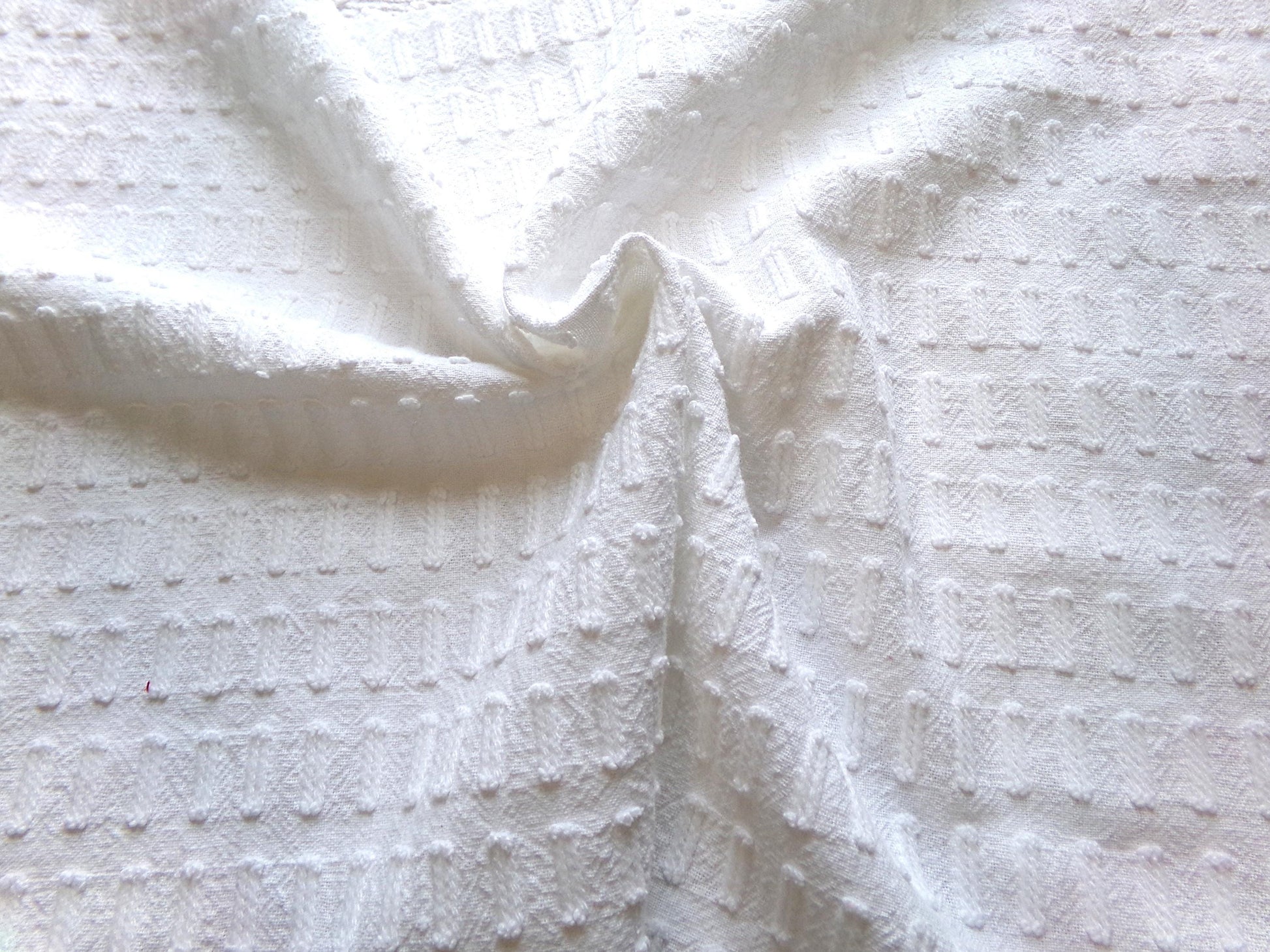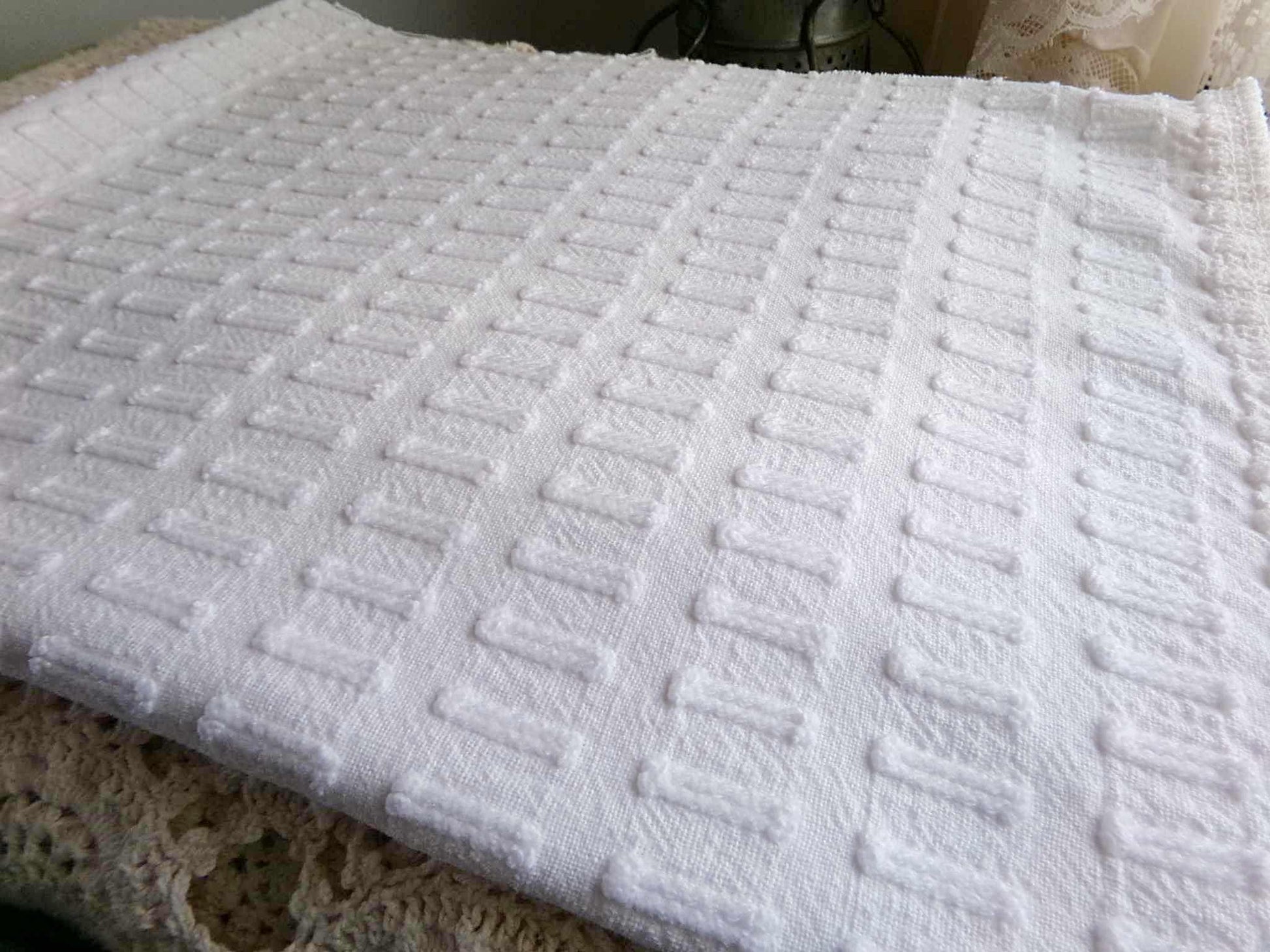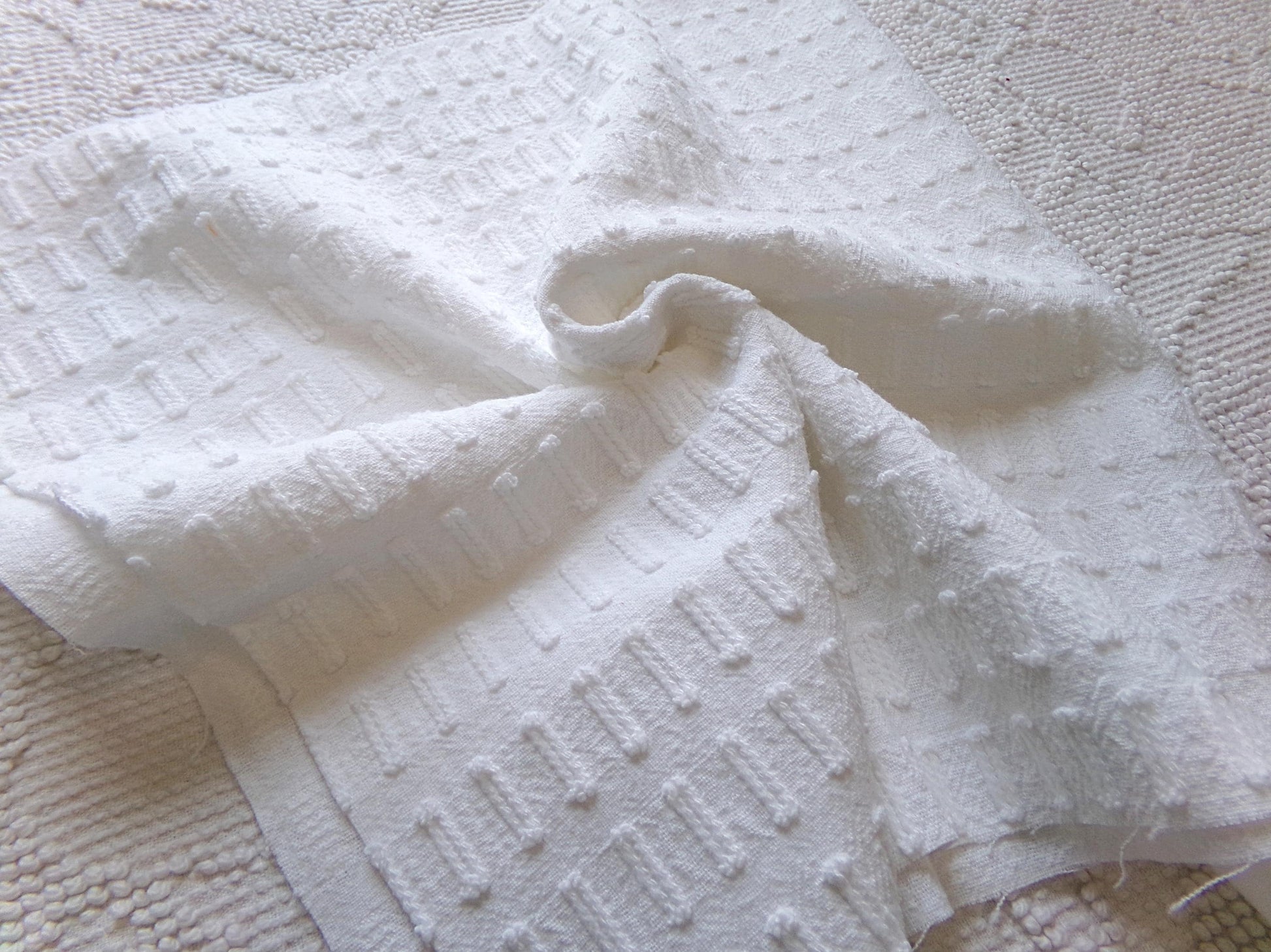 see more, cottagedivine.comGreat piece of minimalist white chenille fabric in a simple, slightly raised "buttonhole" design. A great way to add just a bit of textural interest without overpowering your project.