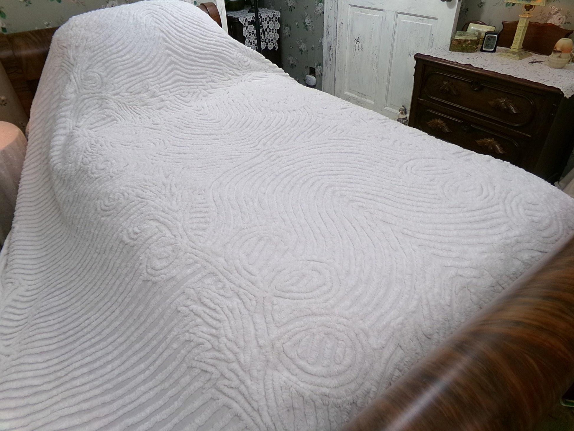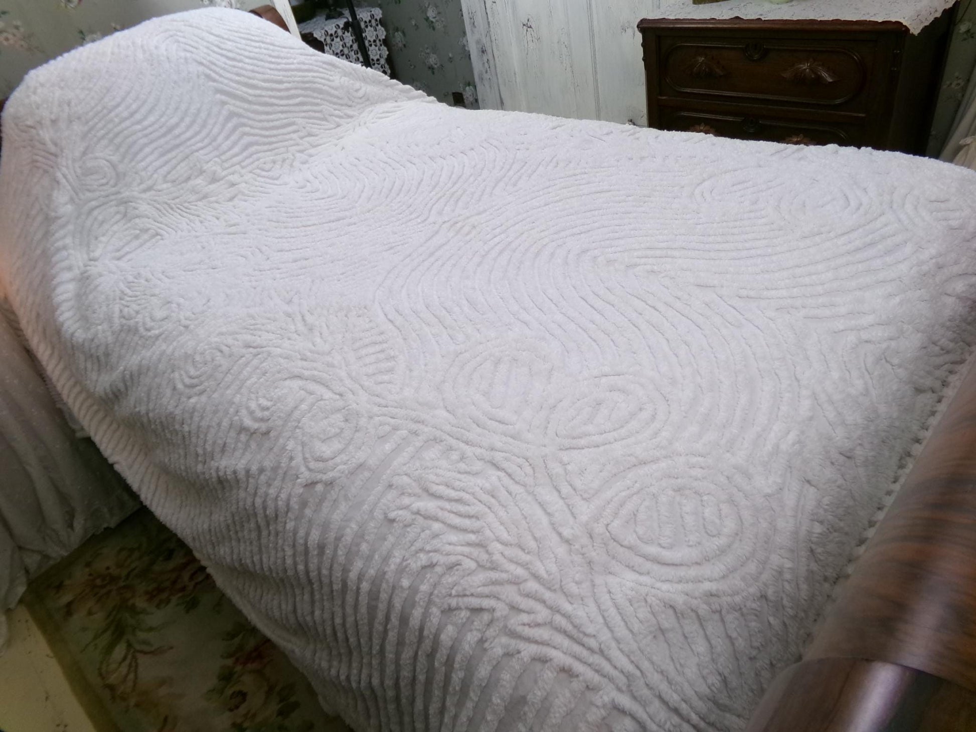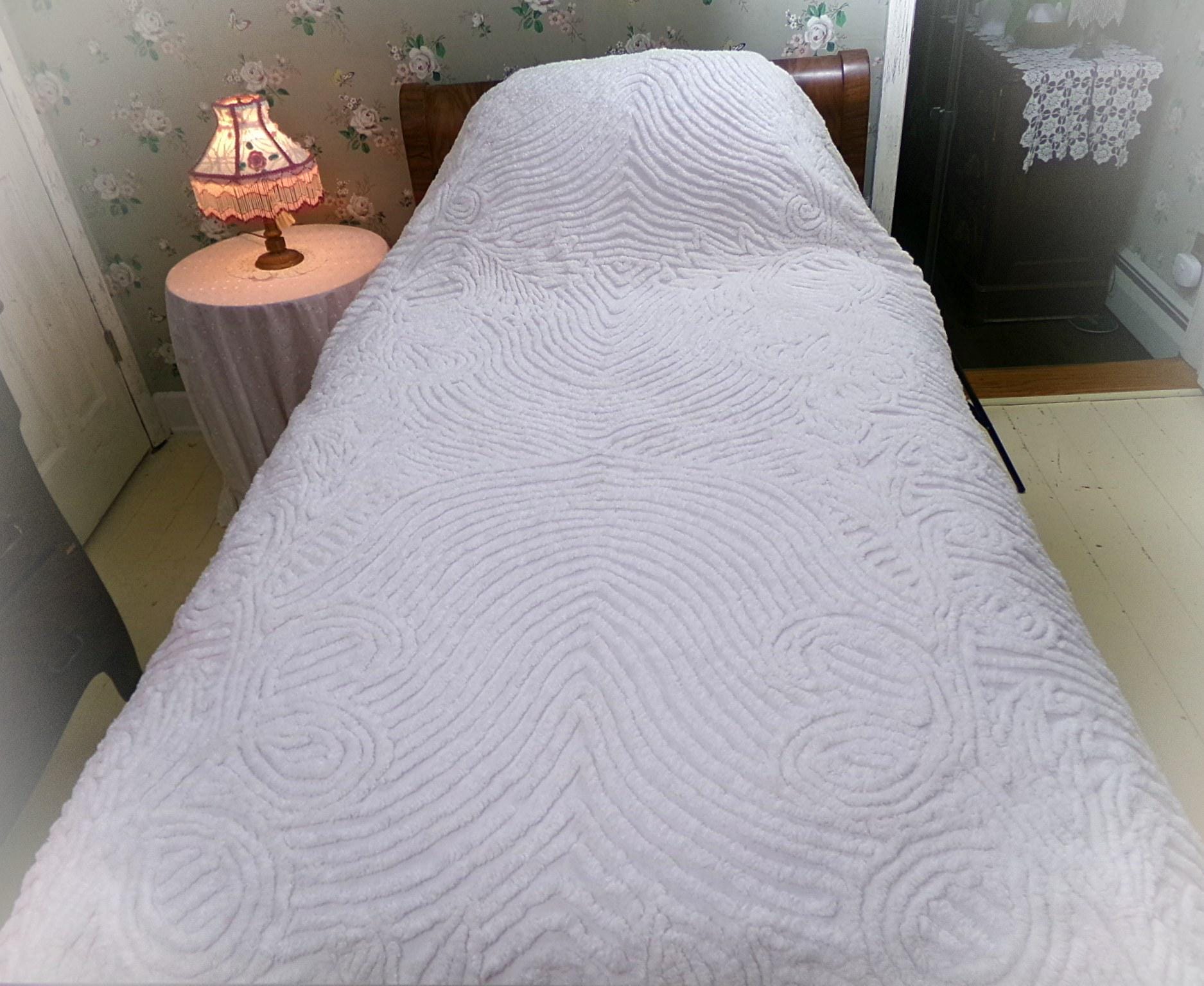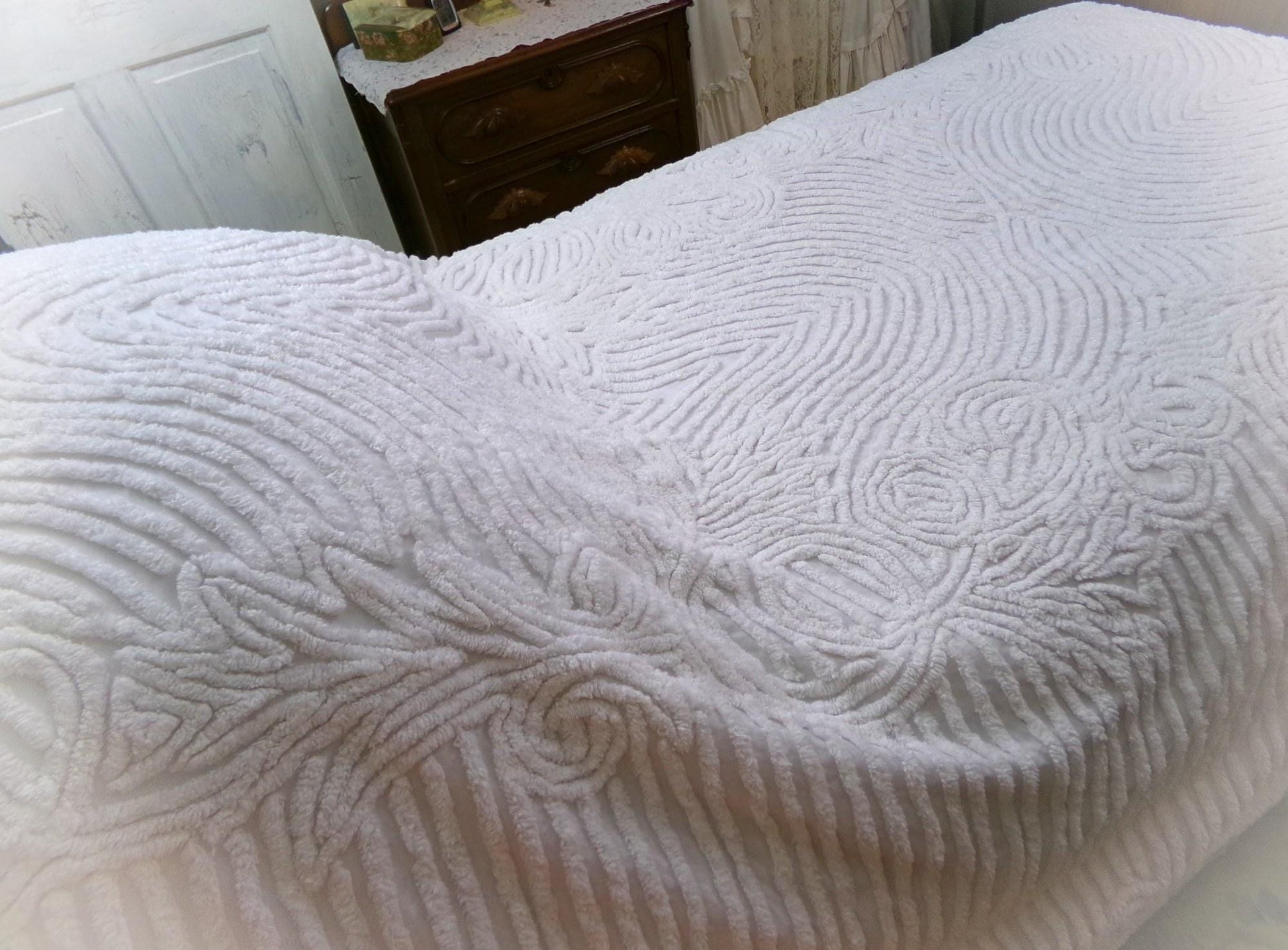 This vintage bedspread is the chameleon of chenille - whether you're going for a clean, modern farmhouse look or envisioning more of a cozy cottage vibe - it adapts effortlessly to the space it's in.A mystic shadow swirl design is luxuriously tufted onto a quality cotton groundcloth, all in a fresh white-on-white design. I have two of these beautiful spreads presently available (this listing is for one, single bedspread, not a pair).