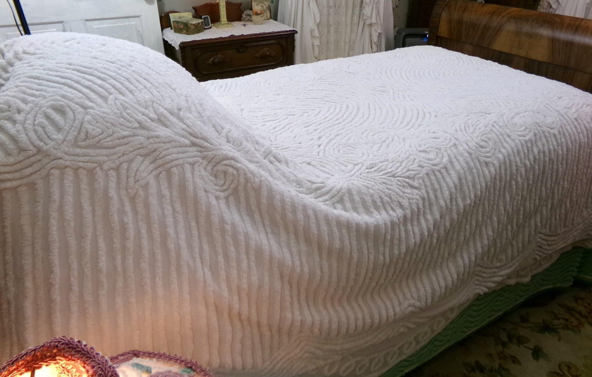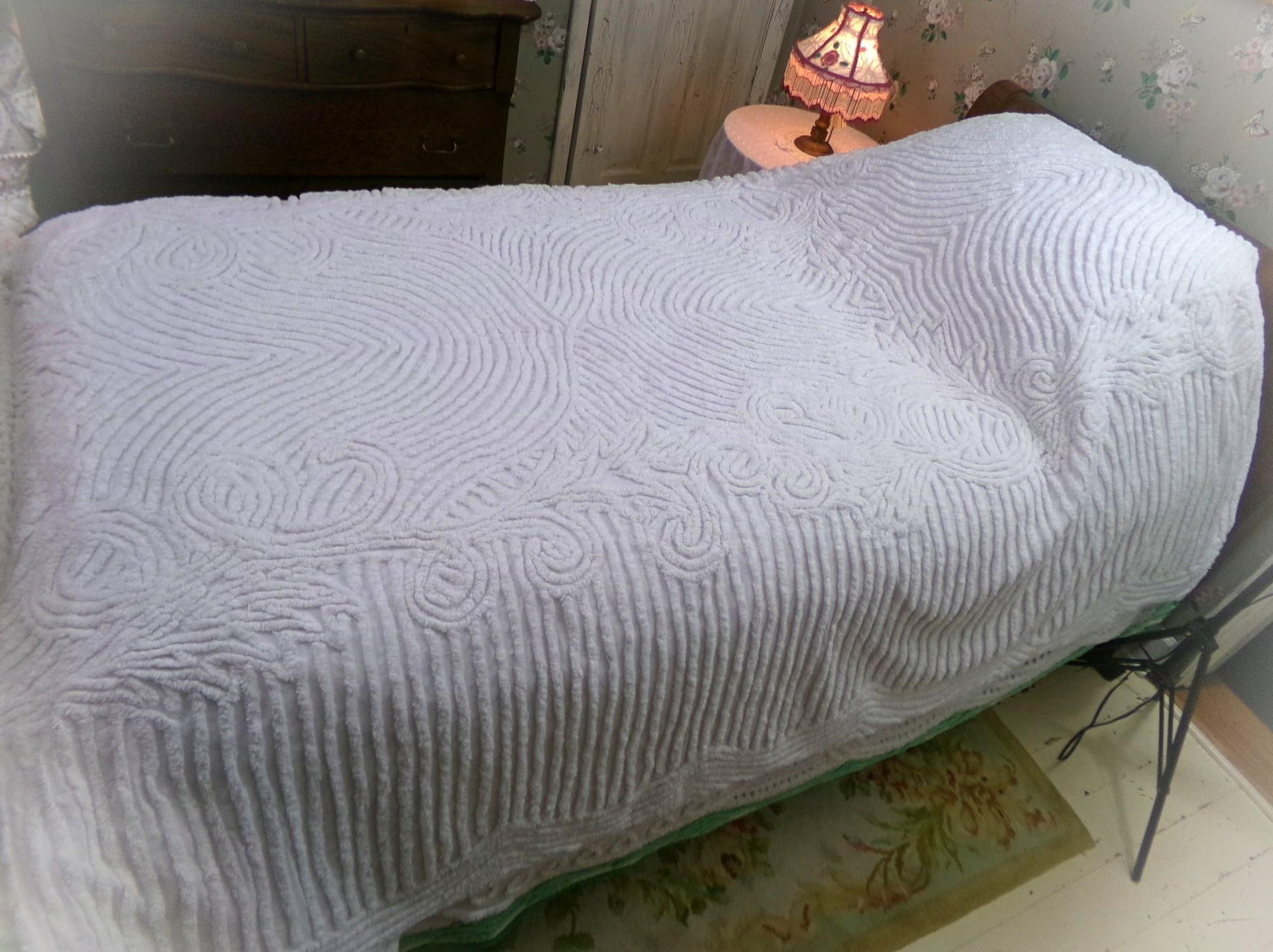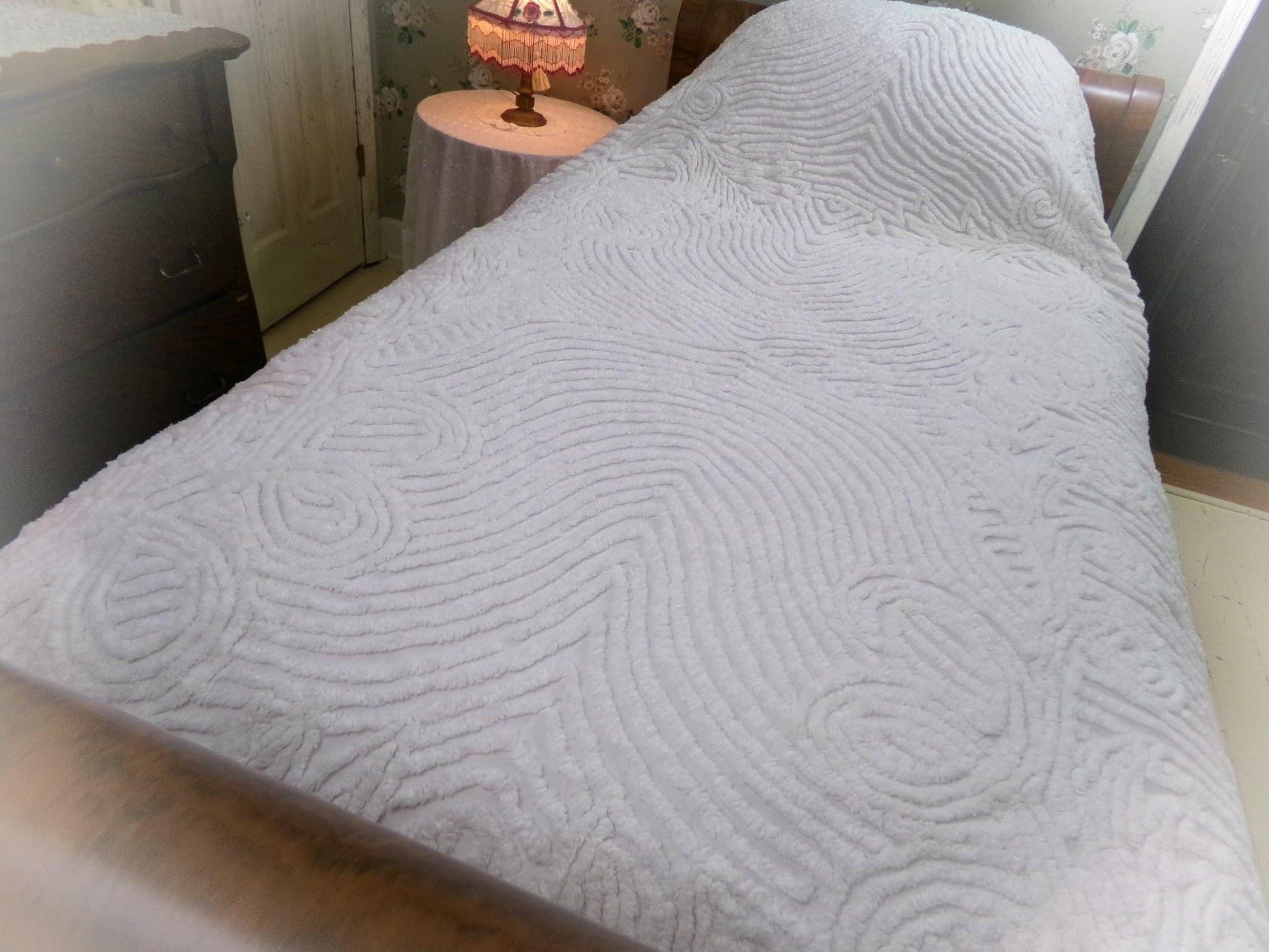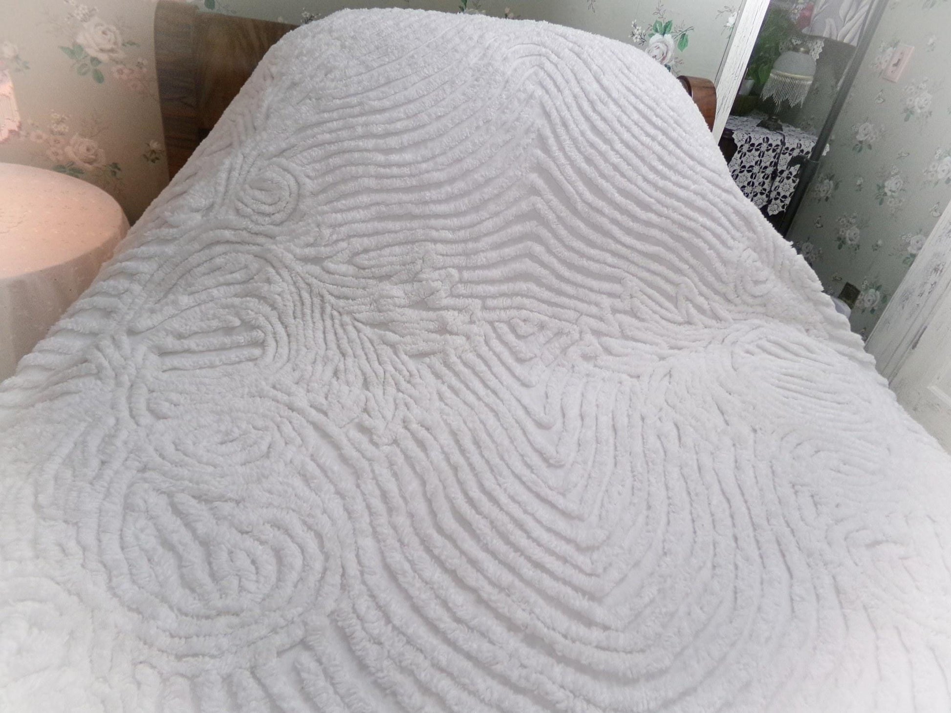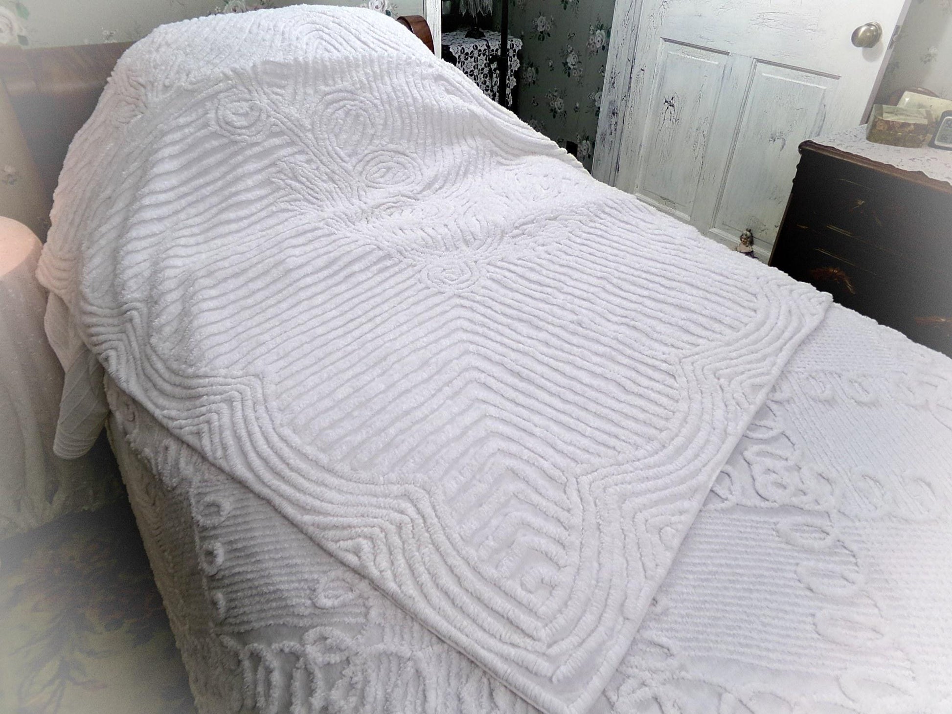 This vintage bedspread is the chameleon of chenille - whether you're going for a clean, modern farmhouse look or envisioning more of a cozy cottage vibe - it adapts effortlessly to the space it's in.A mystic shadow swirl design is luxuriously tufted onto a quality cotton groundcloth, all in a fresh white-on-white design. I have two of these beautiful spreads presently available (this listing is for one, single bedspread, not a pair).