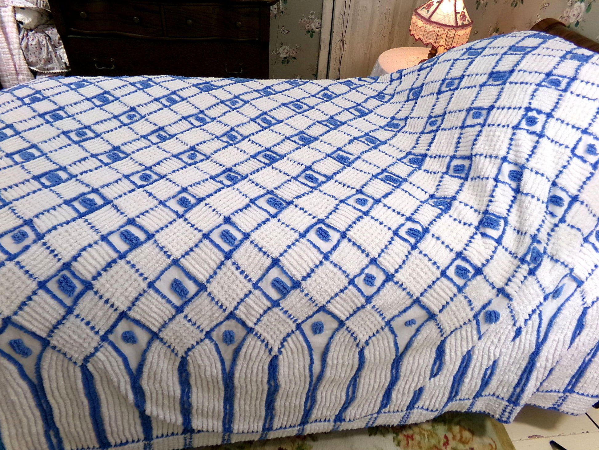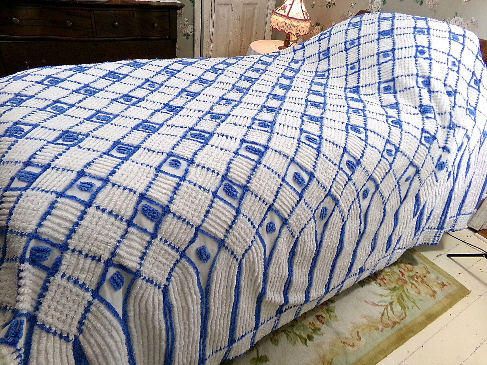 This full size vintage chenille bedspread offers a nautical vibe, perfect for your retro coastal cottage decor. Notice the drop sides, which feature gorgeous cathedral striping that provide depth and dimension to the overall design.And those dots - just so impossibly cute. They're often referred to as coffee bean pops because of their shape, or as my granddaughter calls them, "split donut dots". Each one is situated in a blue square, set on a white cotton background. Because of the style of these pops, they're not all consistent in size - I've shown this in a closeup (final collage img) and with the pink arrow in img #9.