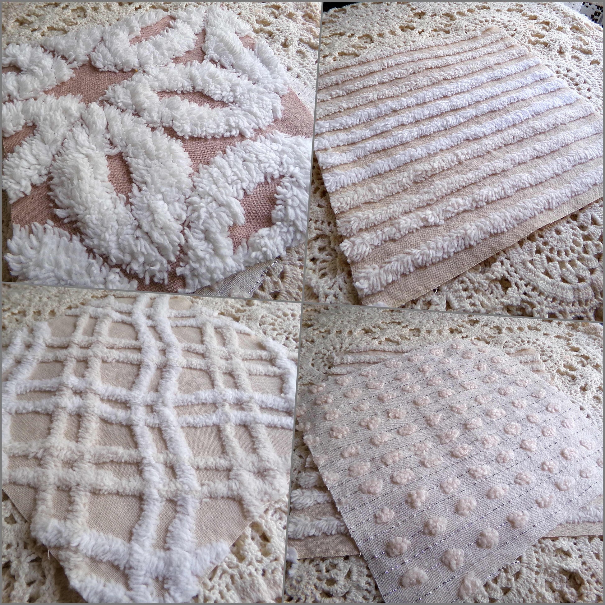 Here is a neutral modern selection of 16 chenille quilt squares in on-trend neutral colortones. Emphasis on mocha, tan, champagne & white. A range of textures from plush mocha/white daisy to ultra lightweight little pops with some shimmer lurex. Ideal for effortlessly adding a neutral look - with great textural interest - to any little project.::total qty: 16 chenille quilt squares