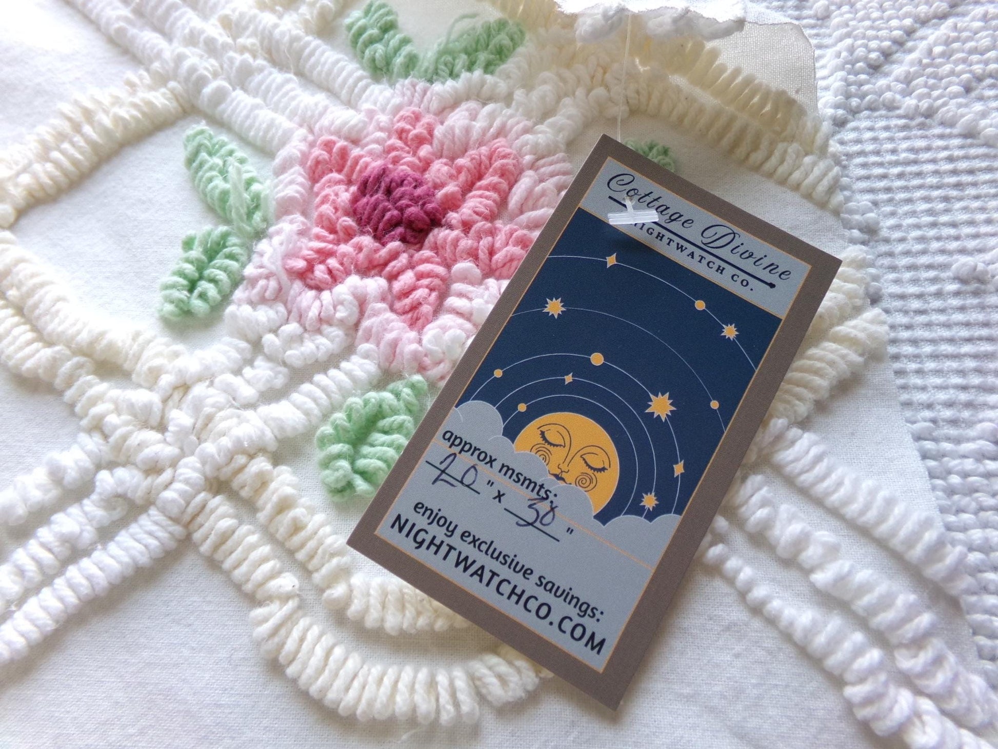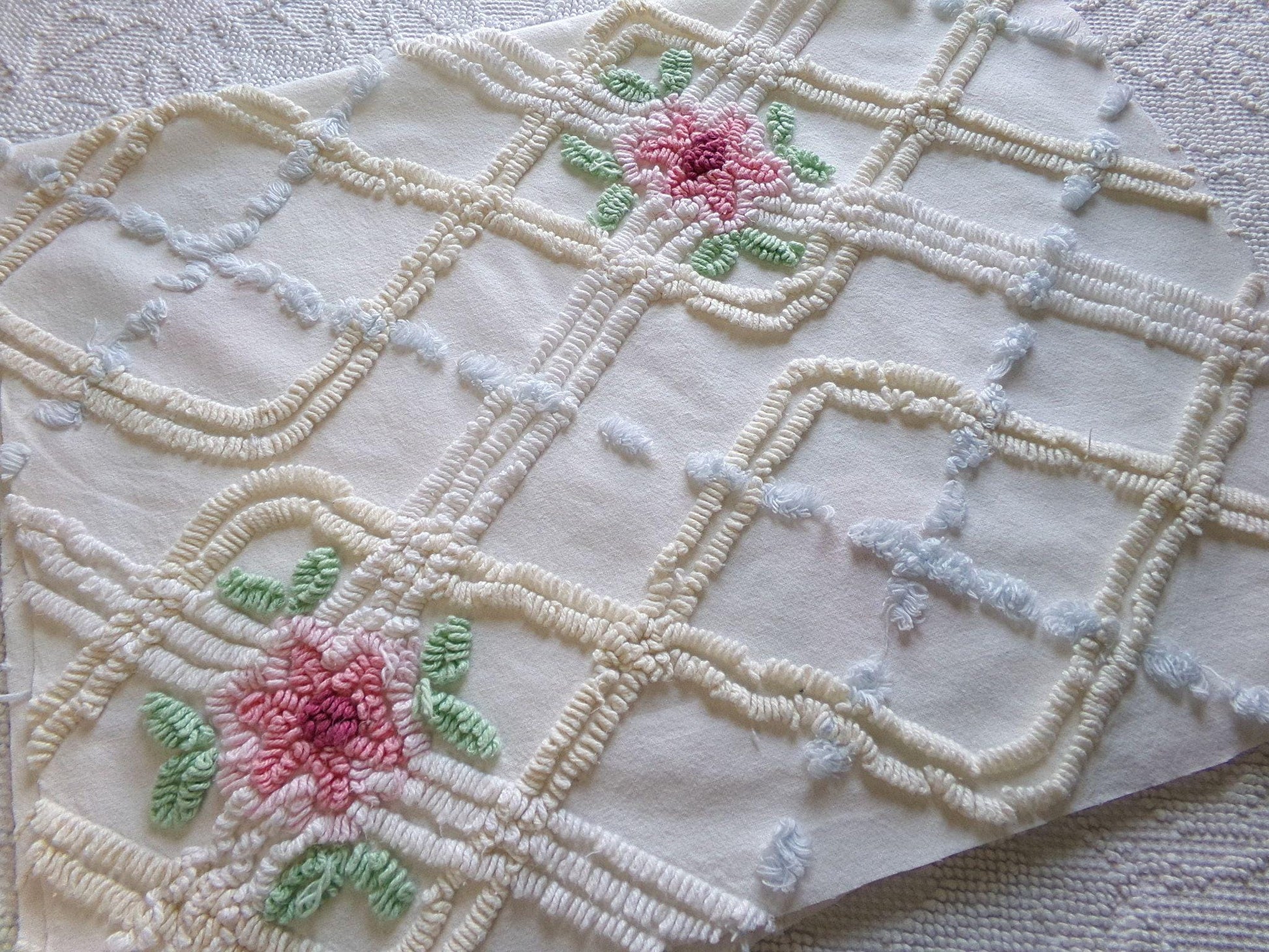 Isn't this such a pretty piece of vintage chenille fabric? It features four pink rose floral motifs tufted onto a creamy off white bkgd, with lightest sky blue puffs & tan abstract geometric links. The fabric has a gentle, old fashioned essence, sure to create a lovely presentation in your project.Approx 20" x 30" inch piece. Ideal in DIY pillows, quilts & more. 100% cotton. You may see a few areas of light tuft loss.