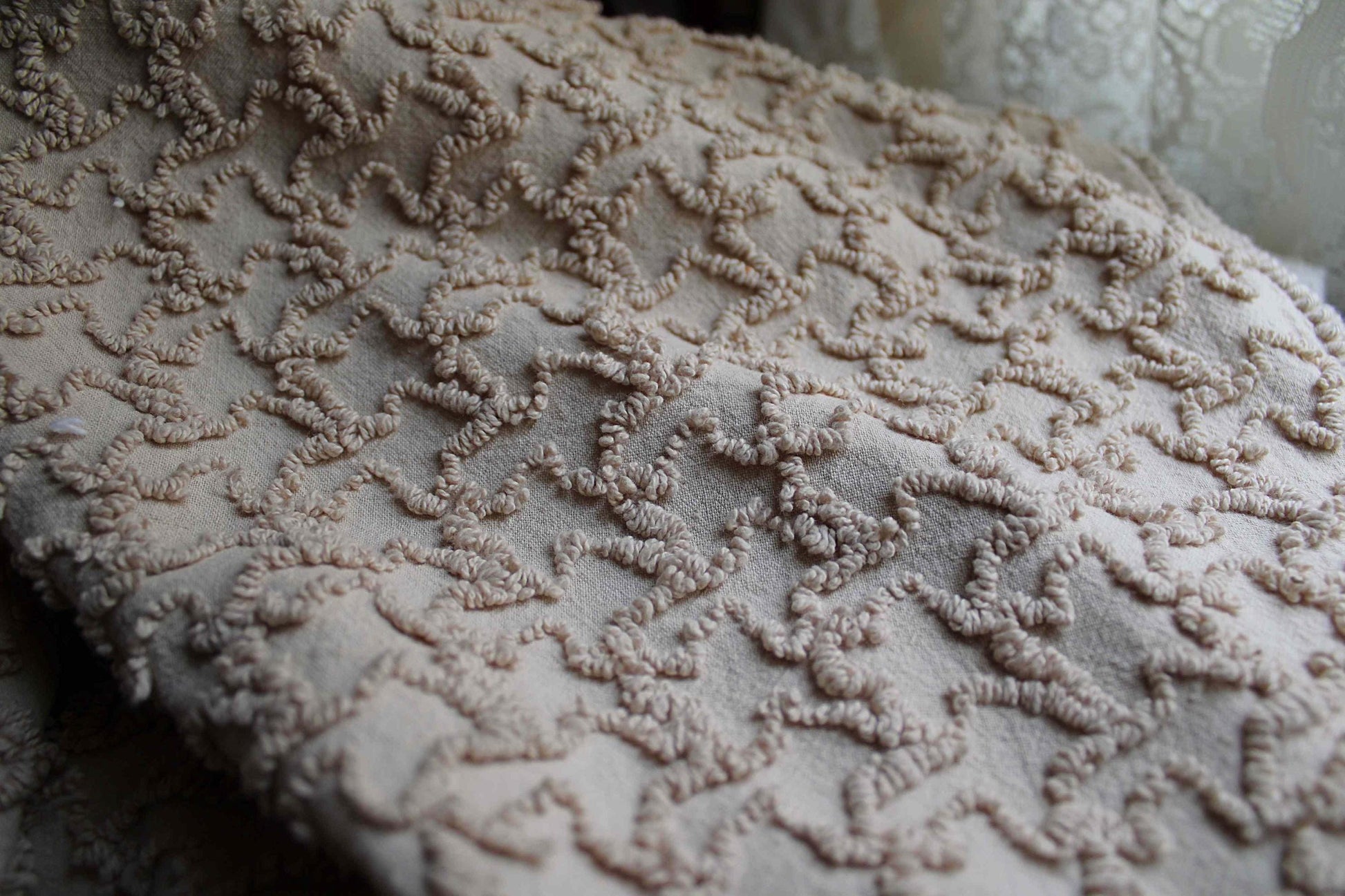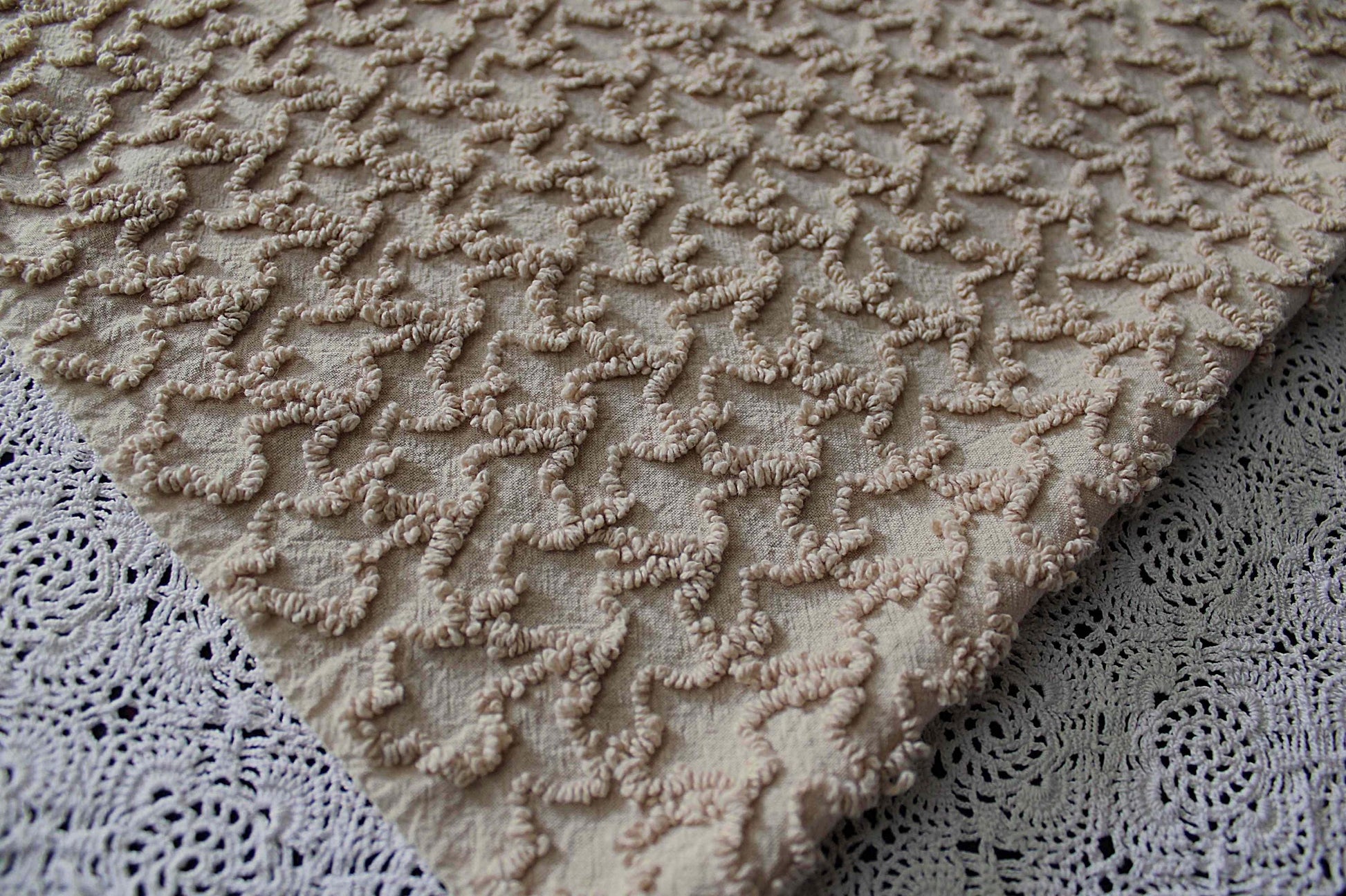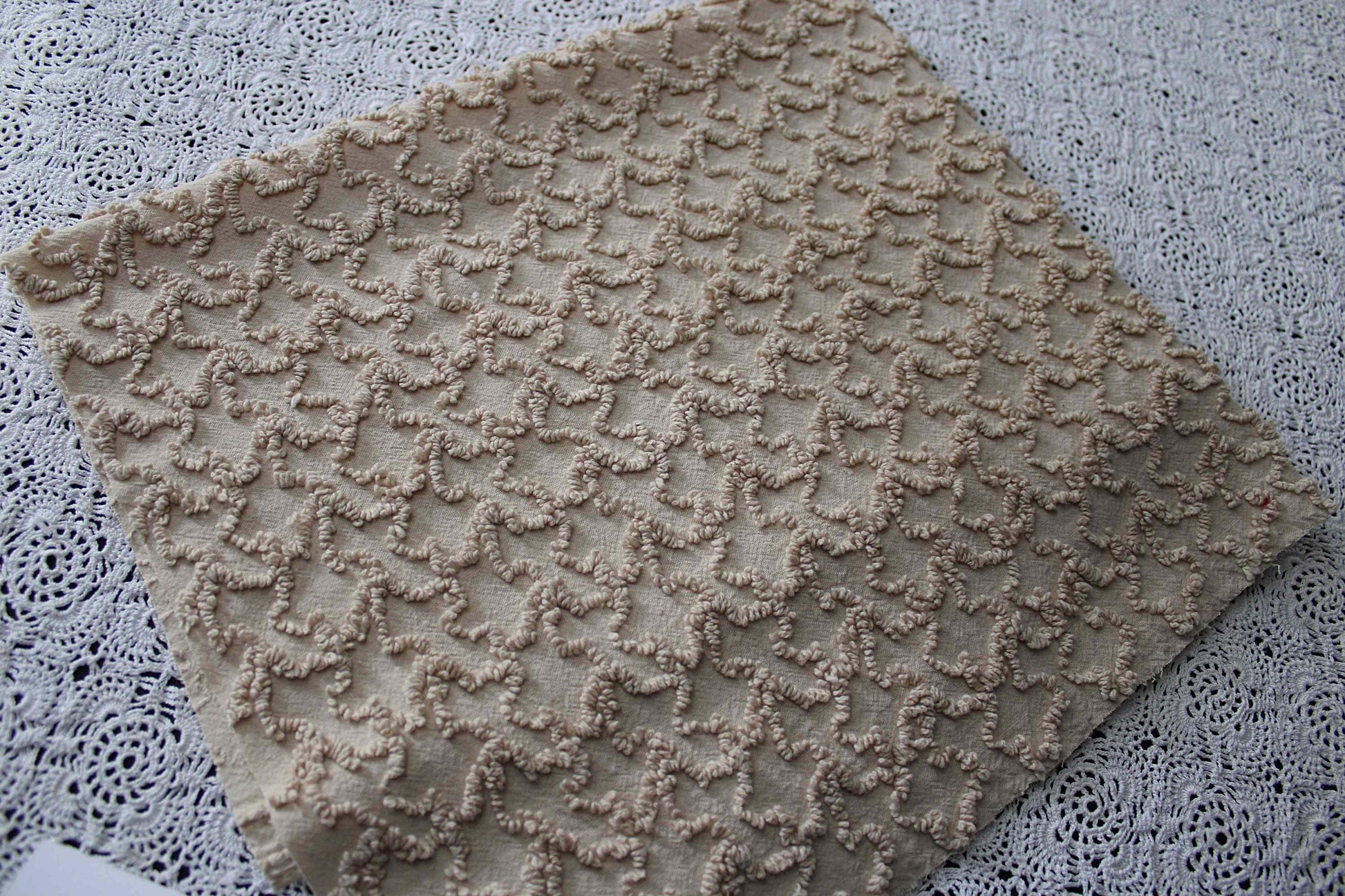 Versatile neutral vintage chenille fabric piece in a popular texturized squiggle design. Earthy colorway on this material, in what I would call a warm shade of sandy mocha that is highly adaptive to light. Photos taken in a variety of lighting to show this.Approx 24" x 20" inch piece. 100% cotton, lightweight, strong & easy to sew with.