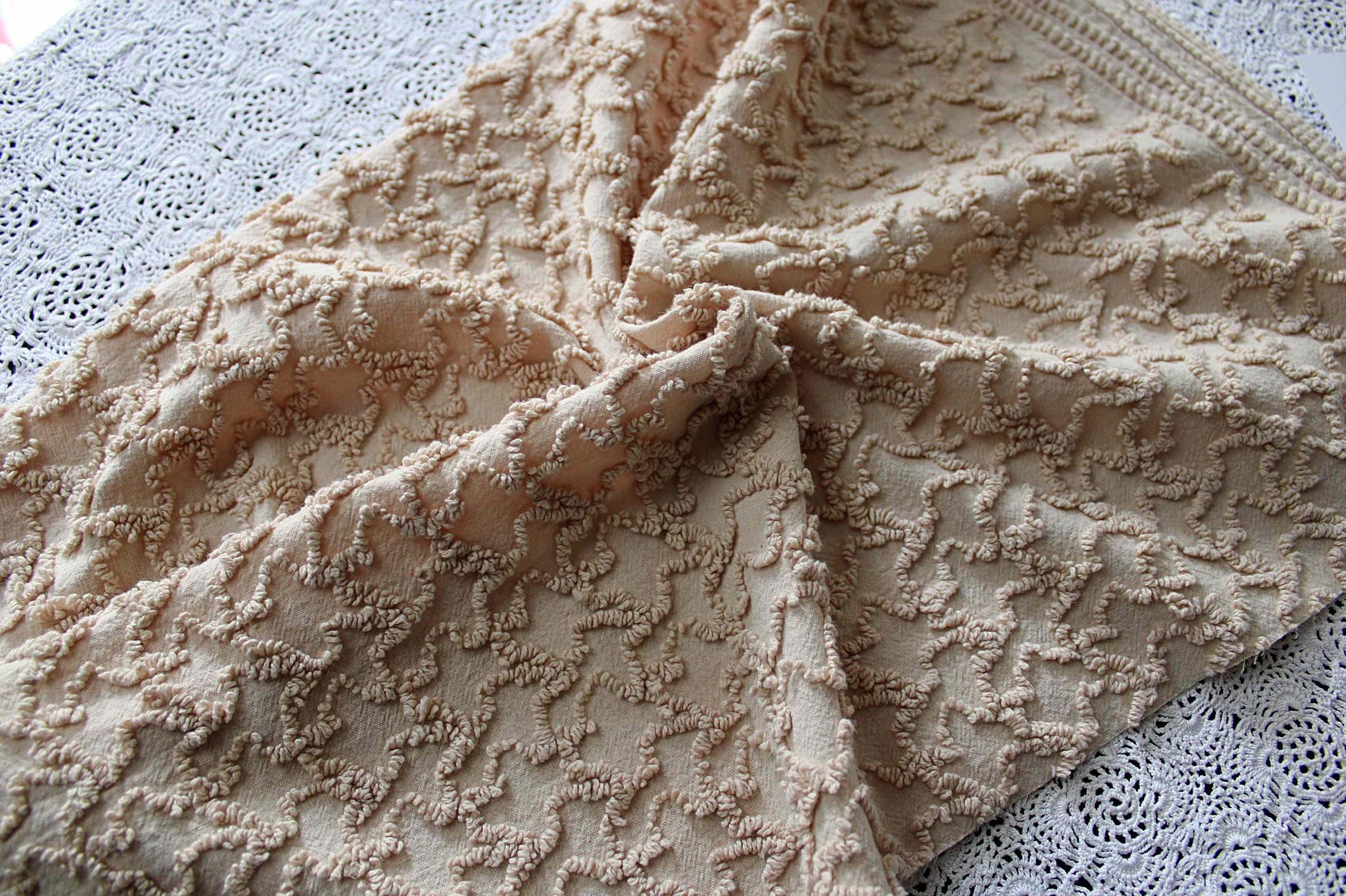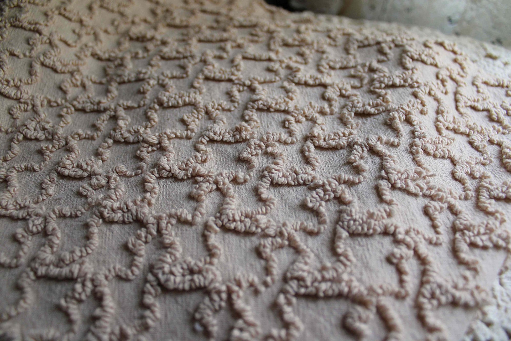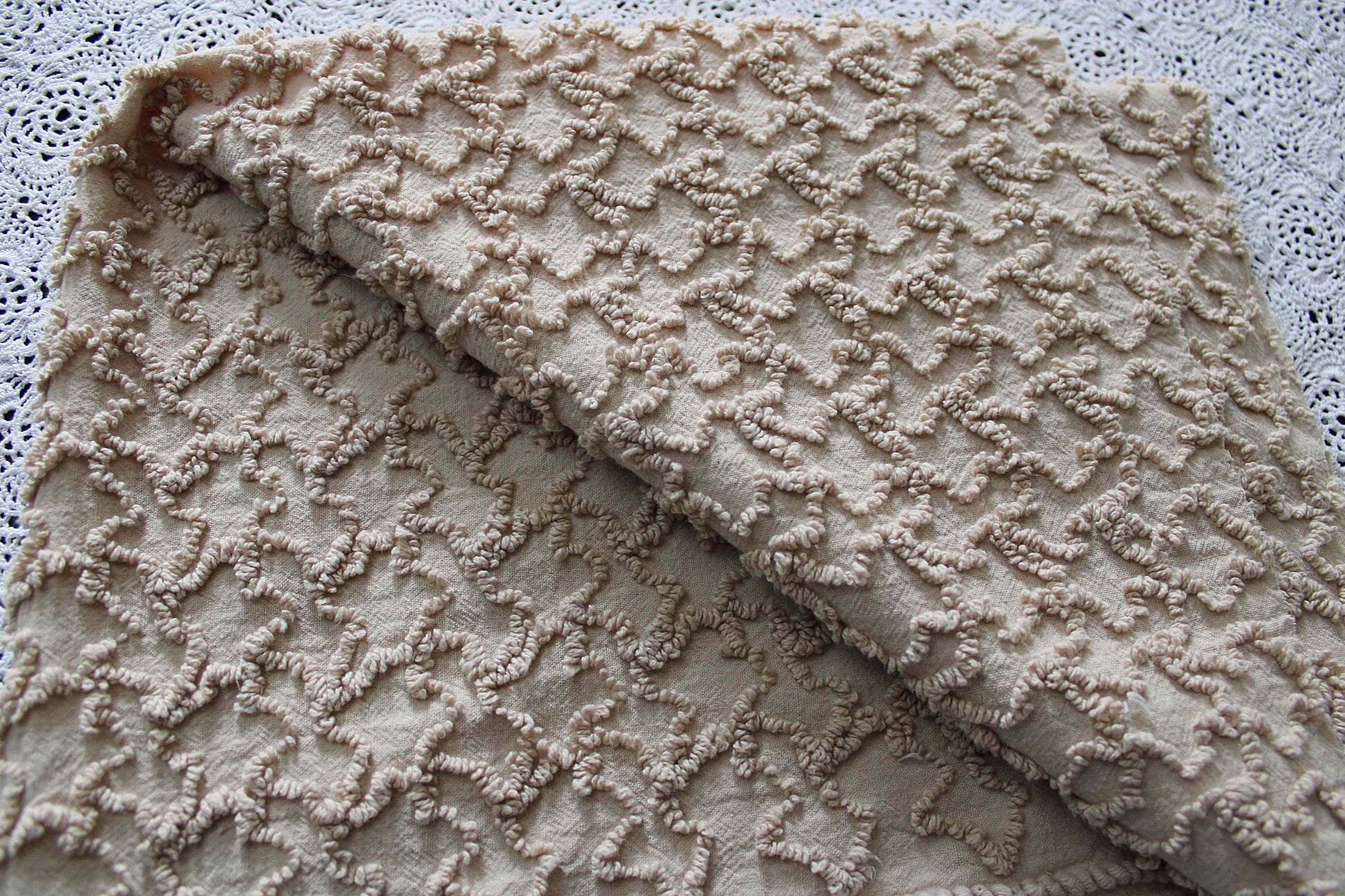 Versatile neutral vintage chenille fabric piece in a popular texturized squiggle design. Earthy colorway on this material, in what I would call a warm shade of sandy mocha that is highly adaptive to light. Photos taken in a variety of lighting to show this.Approx 24" x 20" inch piece. 100% cotton, lightweight, strong & easy to sew with.