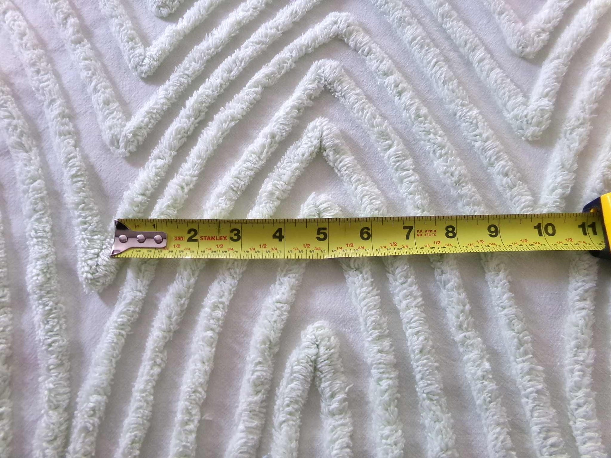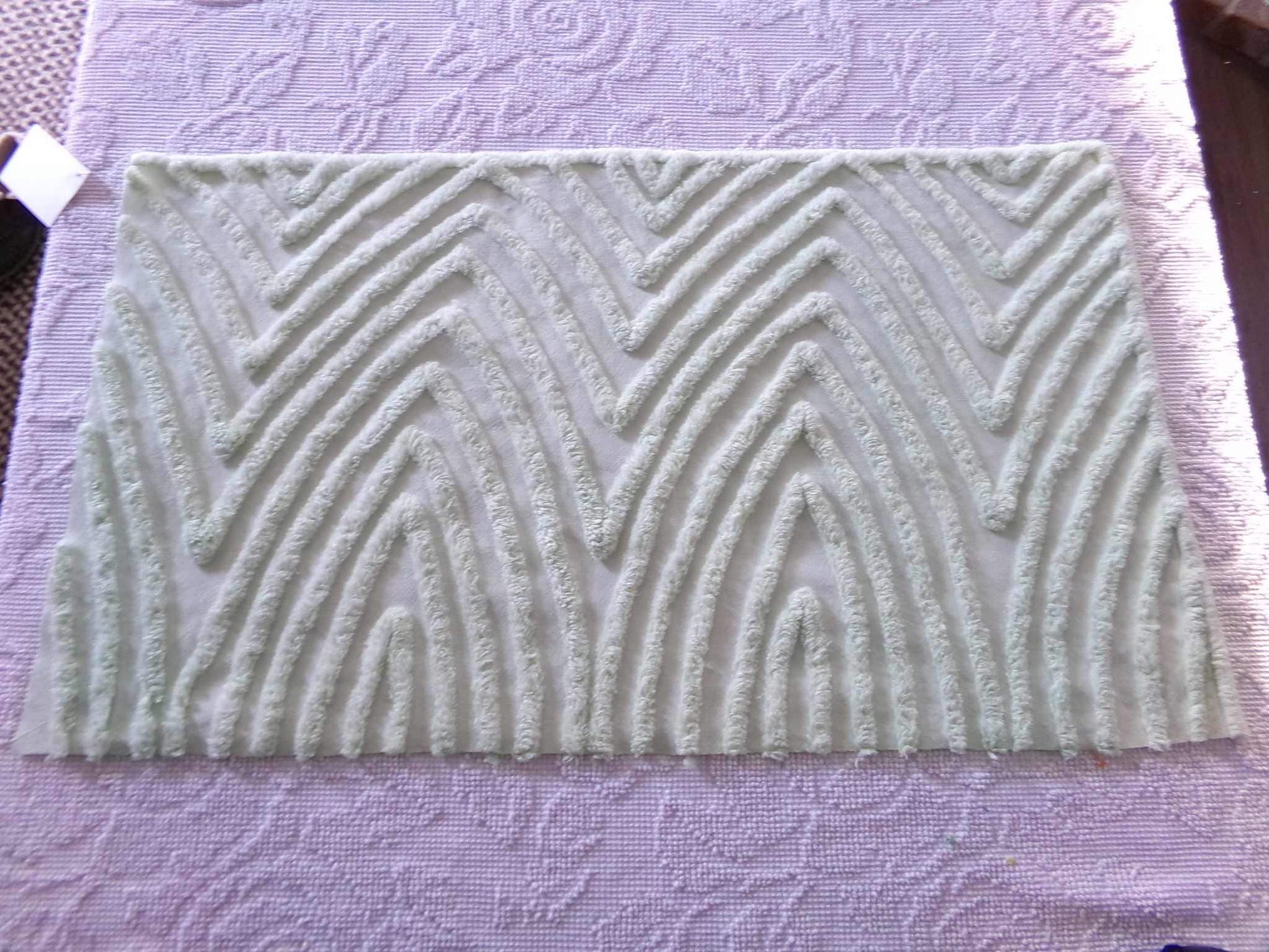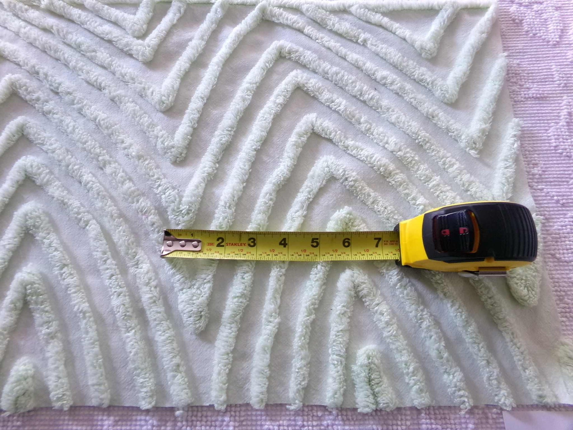 Such a great piece of vintage chenille fabric, in an unusual "mountain peak" optic design. Cool light green colortone adds visual interest to an already unique design. Fabric piece measures about 16" x 29" inches. Few light pinholes such as seen final img.w h a t - t o - k n o w