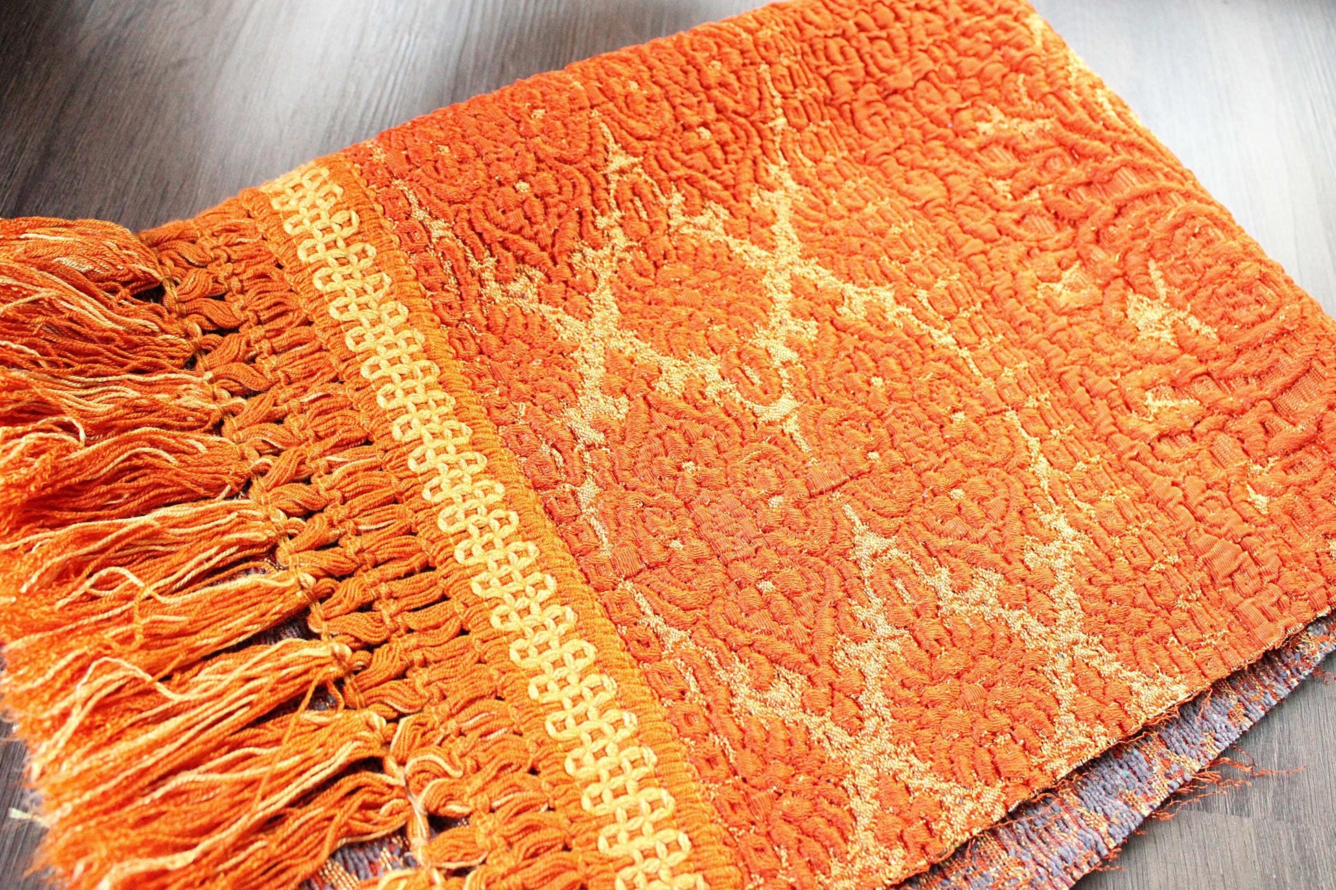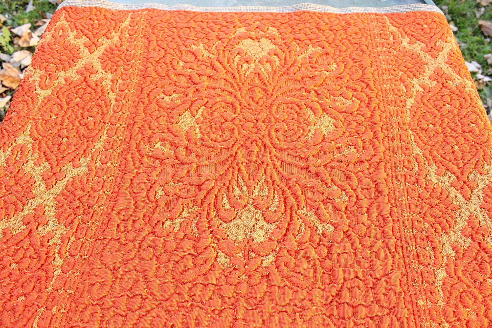 If you're looking for that special piece of fabric to inspire or invigorate your project, you may have found it :) This is a rare piece of woven tapestry brocade fabric in a vivid orange with golden accents. The reverse side is equally unique and gives an unmatched depth to this standout fabric. Accent fringe along one edge is just as gorgeous as the fabric itself.Sourced from a 1960s era Bellissimo Italy-made bedspread. At about 20" x 25" inches, this is a beautiful piece of fabric that represents Italian-made luxury at its very best - heavier weight fabric has a sophisticated shimmer and outstanding visual & textural presentation. 🌺