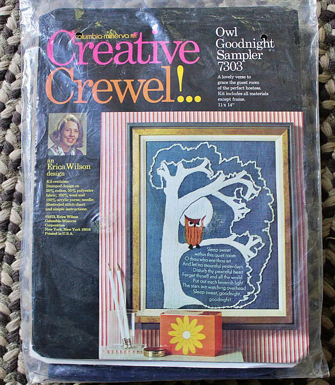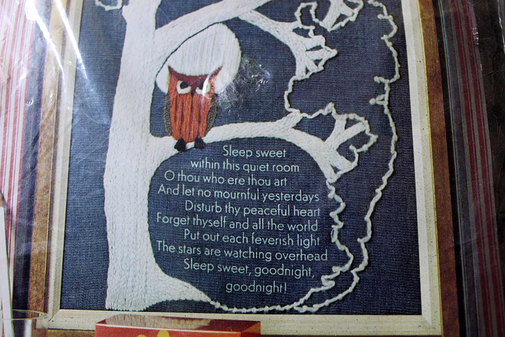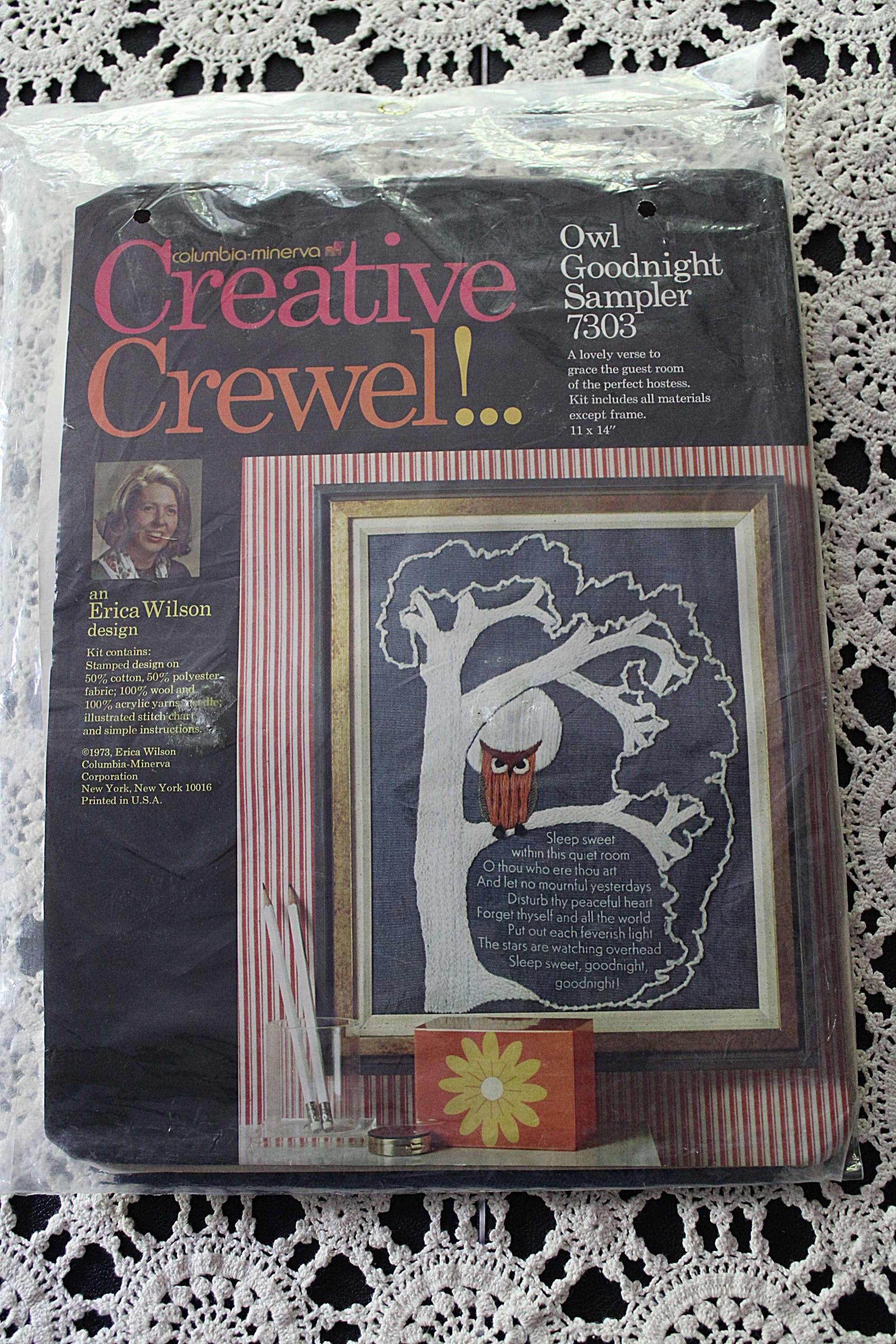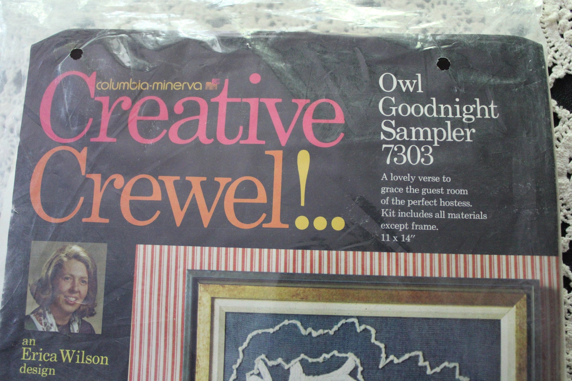 Step back in time to the height of the hippie era & stitch this OWL GOODNIGHT Sampler featuring a whimsical design and sweet little poem. A hard to find 1973 CREWEL embroidery kit. An Erica Wilson Design.Vintage Columbia Minerva Creative CREWEL Stitchery # 7303. Fits an 11" x 14" frame size when finished (not included).