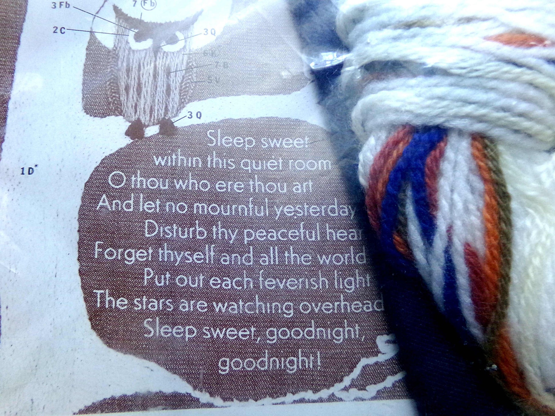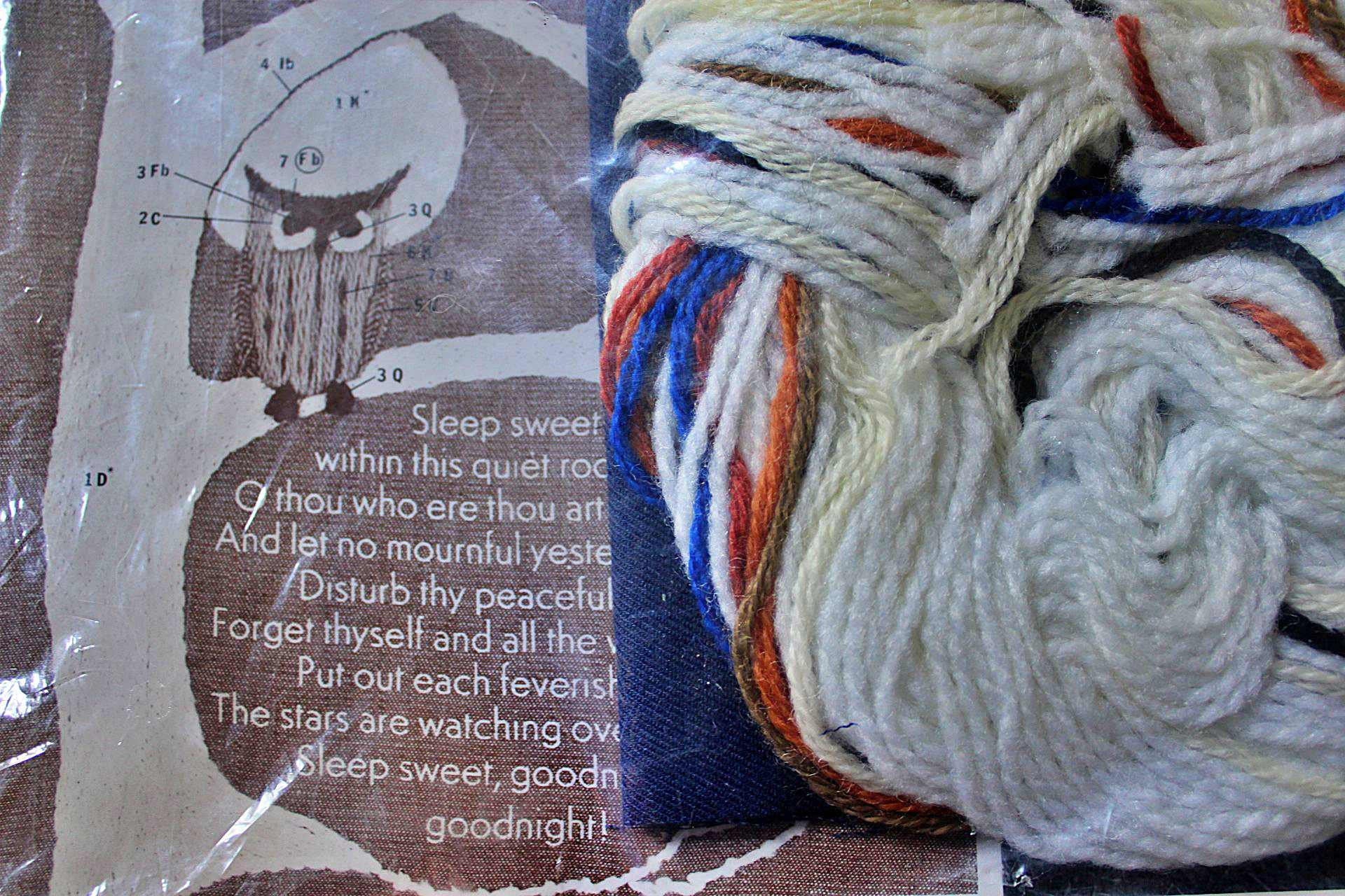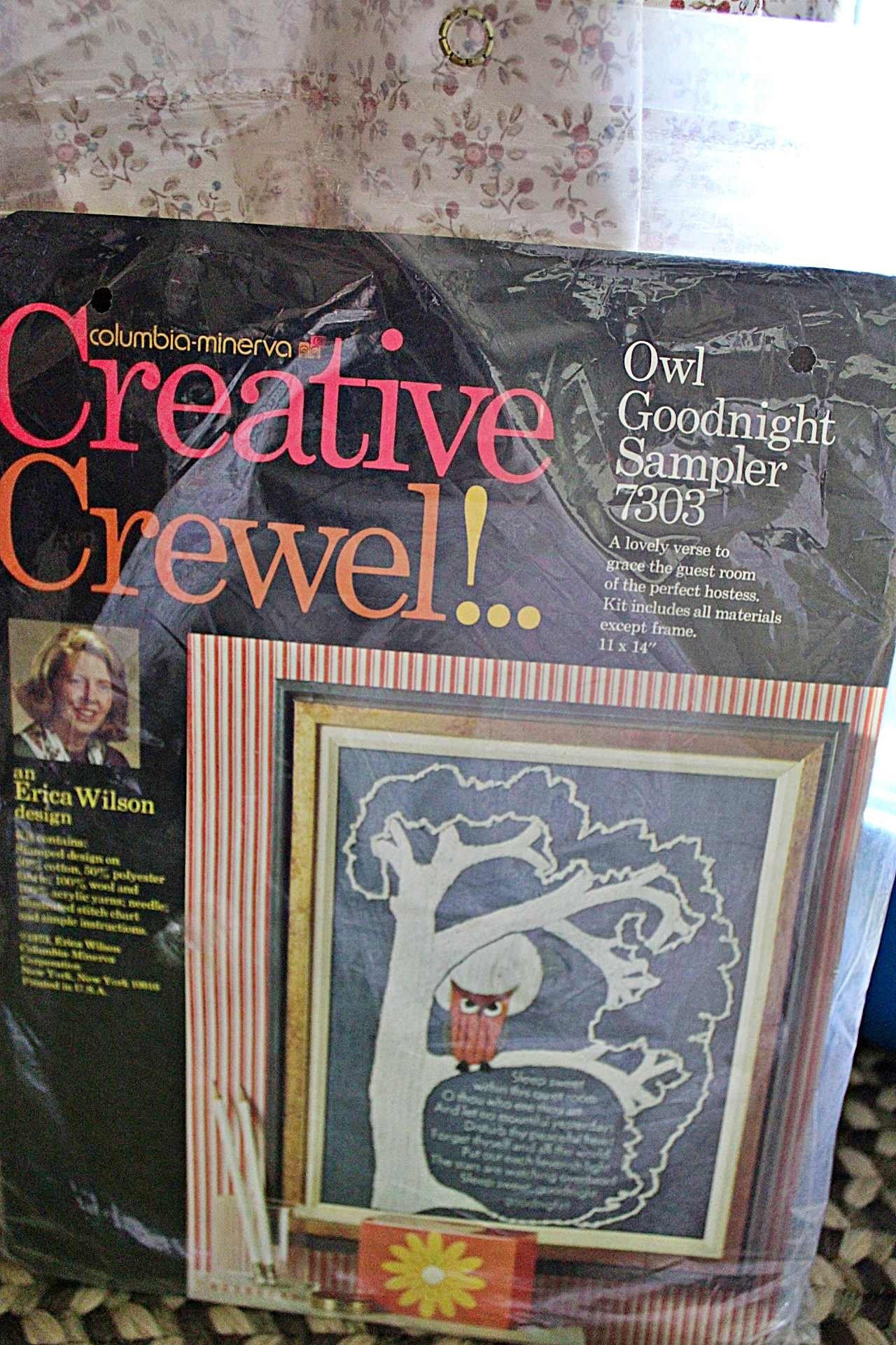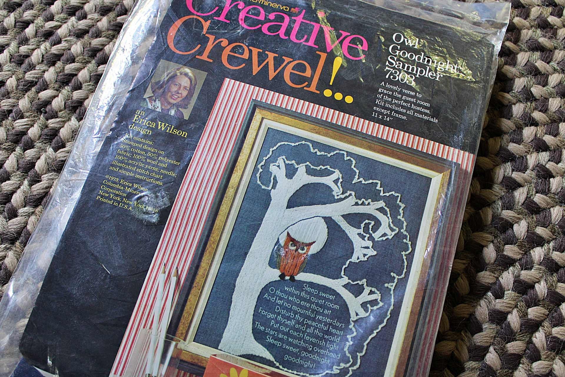 Step back in time to the height of the hippie era & stitch this OWL GOODNIGHT Sampler featuring a whimsical design and sweet little poem. A hard to find 1973 CREWEL embroidery kit. An Erica Wilson Design.Vintage Columbia Minerva Creative CREWEL Stitchery # 7303. Fits an 11" x 14" frame size when finished (not included).