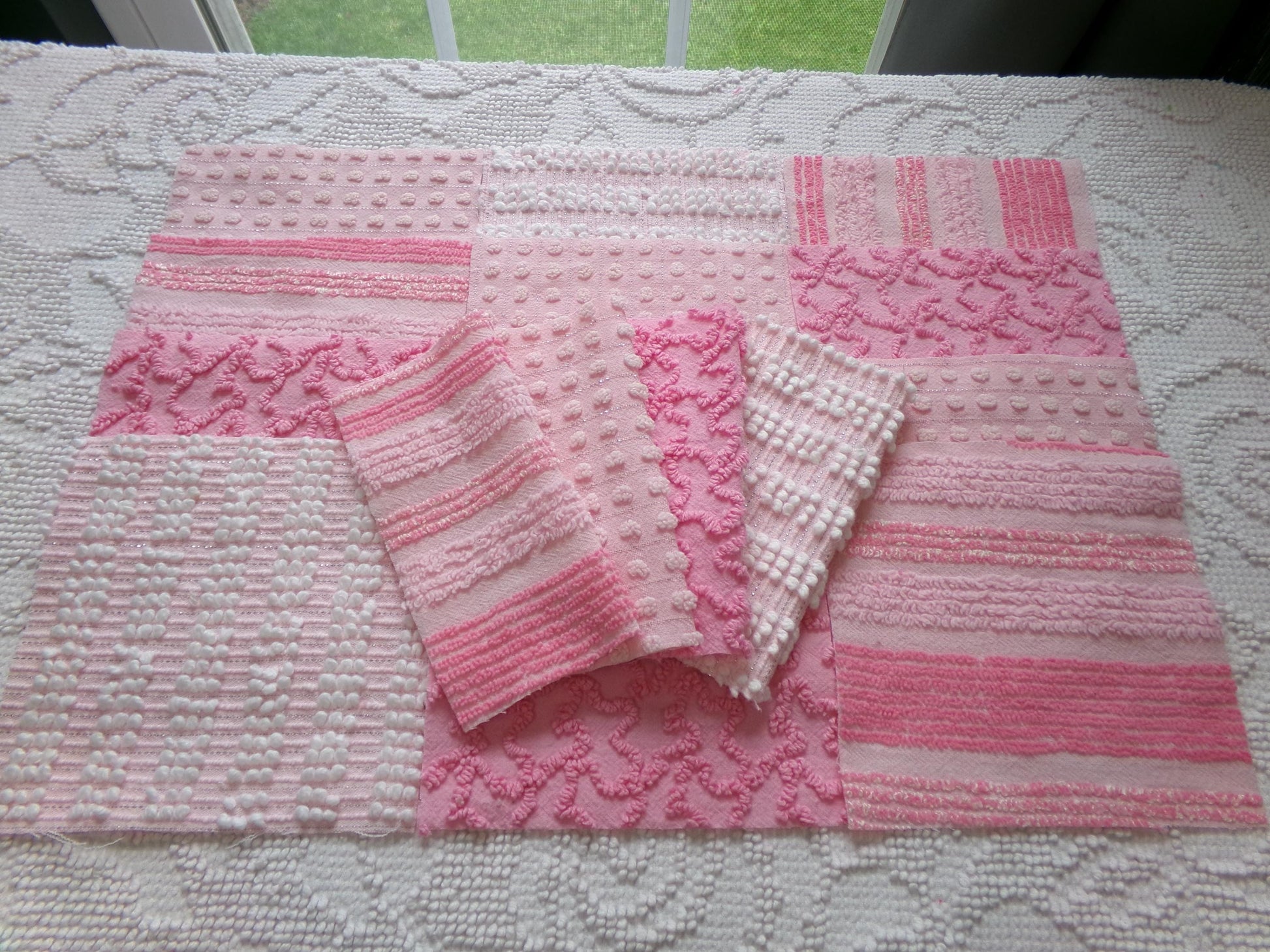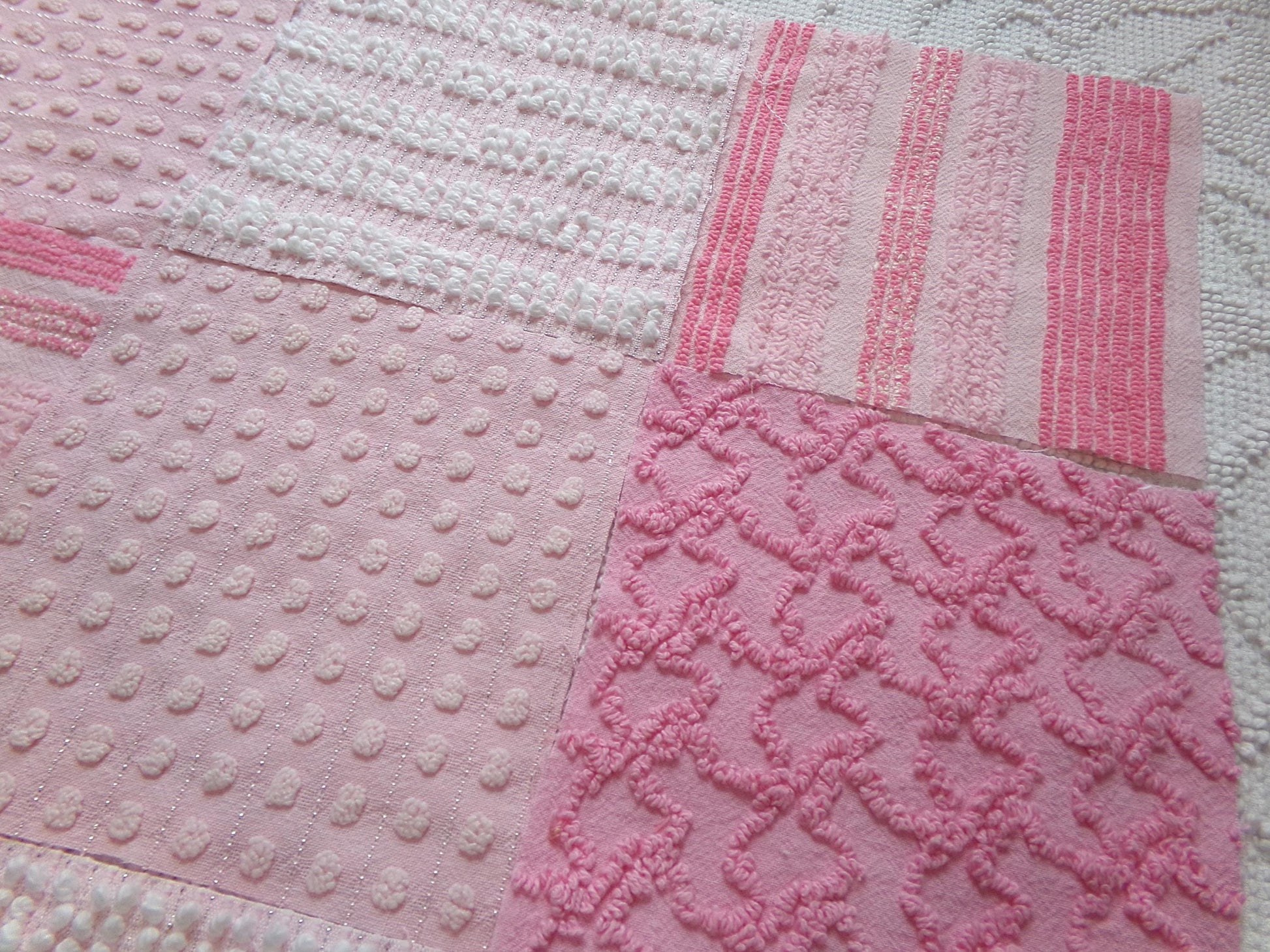 Here is a super fun set of vintage chenille fabric squares in shades of pink. A great range of texture from very lightweight dots to little squiggles.You'll receive an assorted premium mix of 4 in each pattern: pink multisize stripe, pink dot w/ lurex, bubblegum pink squiggle, white "pearls" on light pink