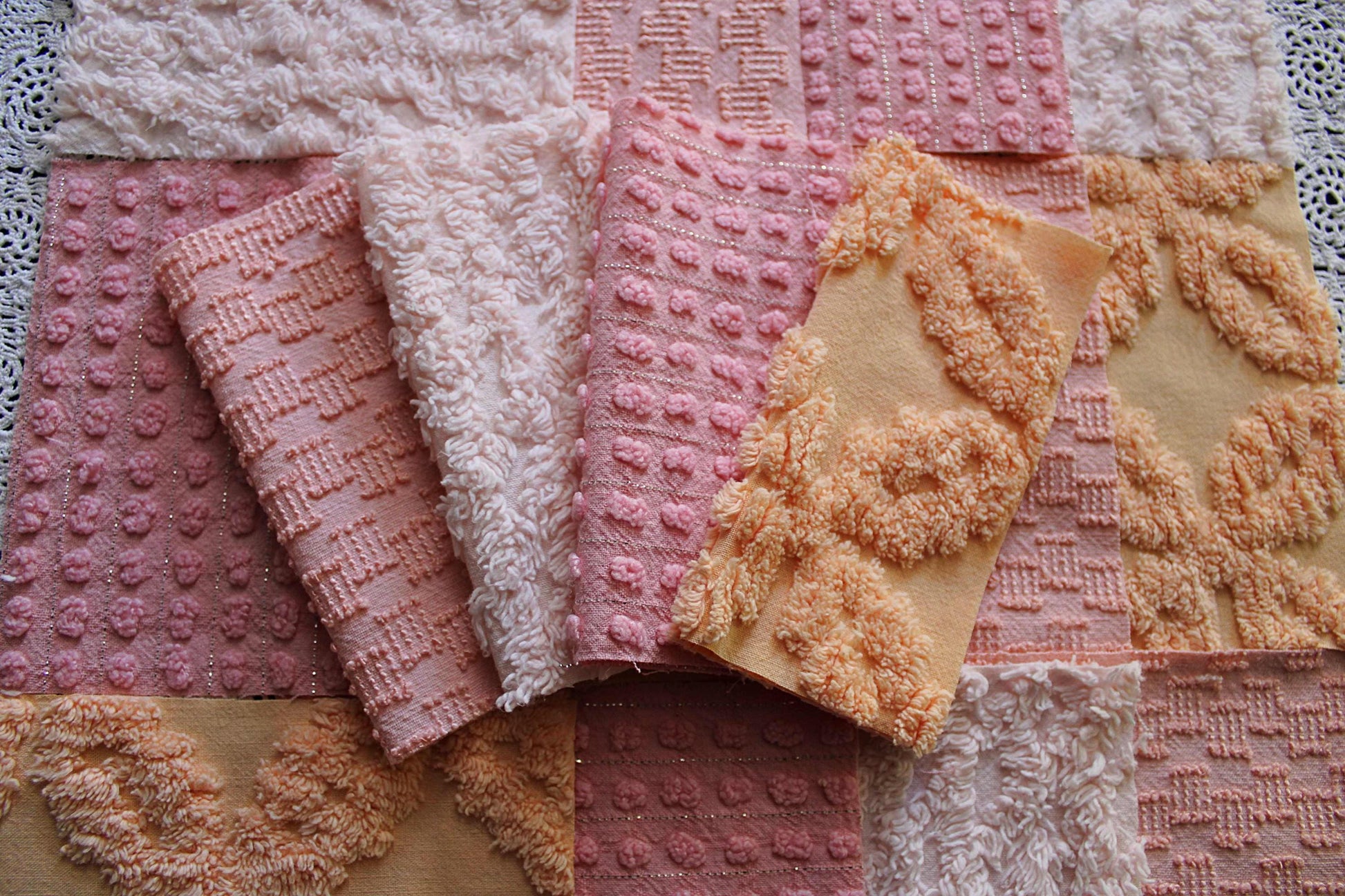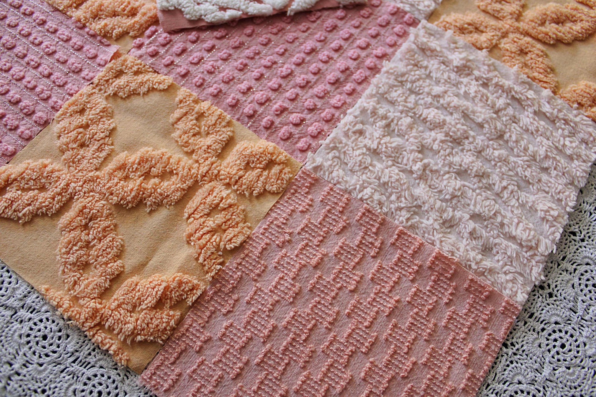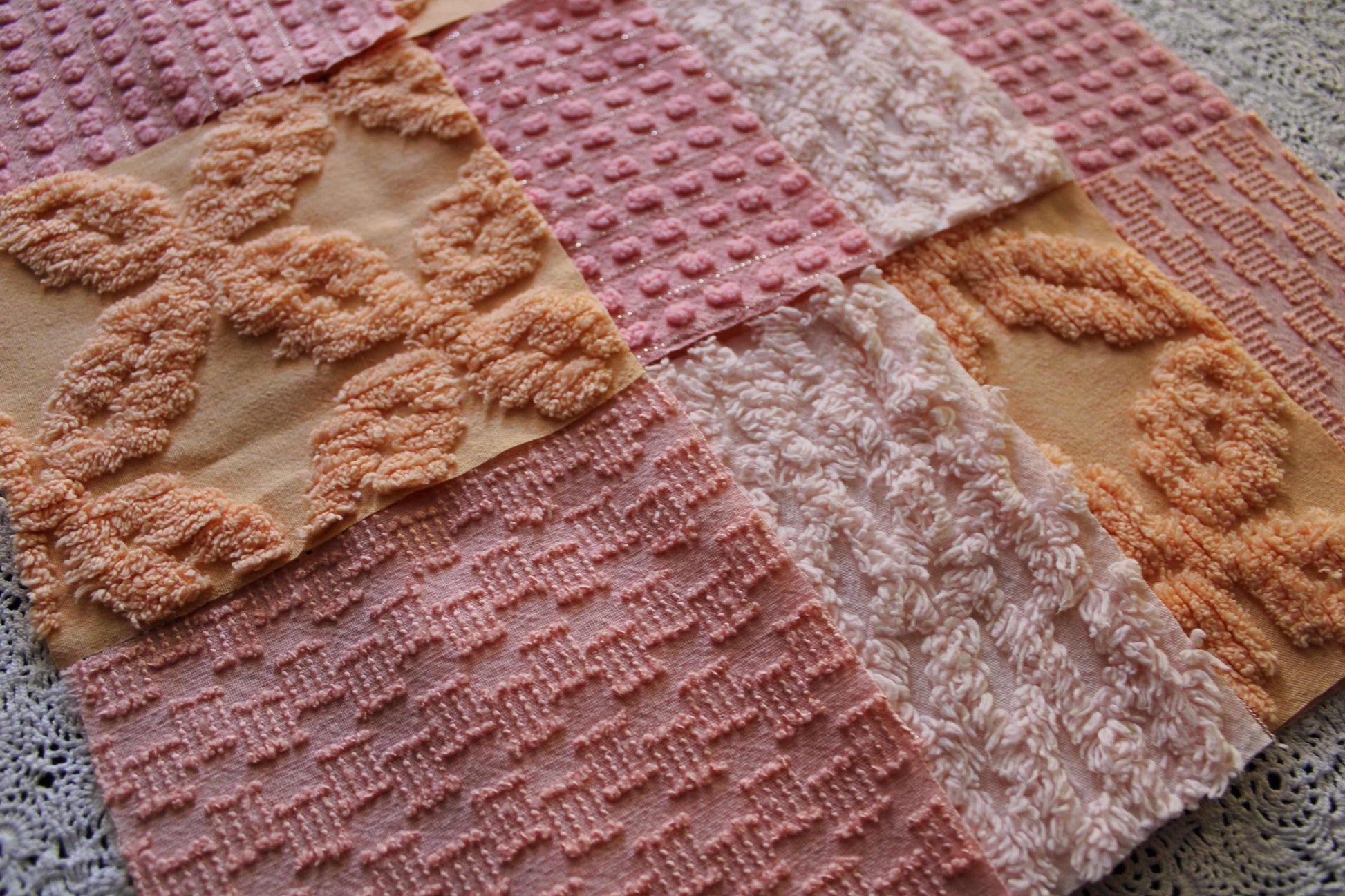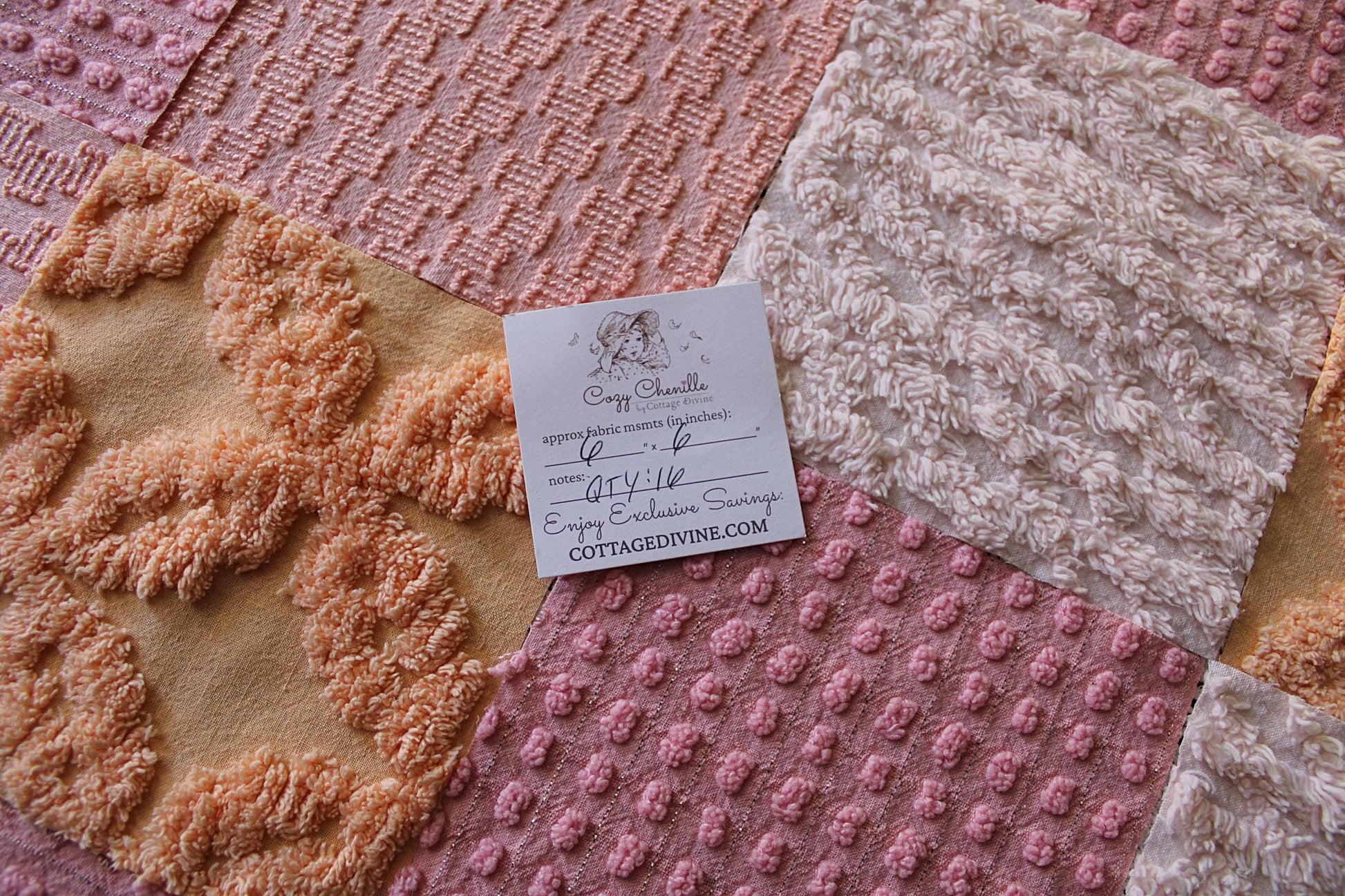 Peach Nectar... A selection of chenille fabric craft squares in shades of radiant peach with a hint of rose to evoke warmth, calm & comfort.Includes 4 of each pattern: tiny ripe peach "tempo tuft," soft iced peach lattice, rose pops with shimmer & geometric peach floral wedge. Such a lovely set to inspire or enhance your creative design.