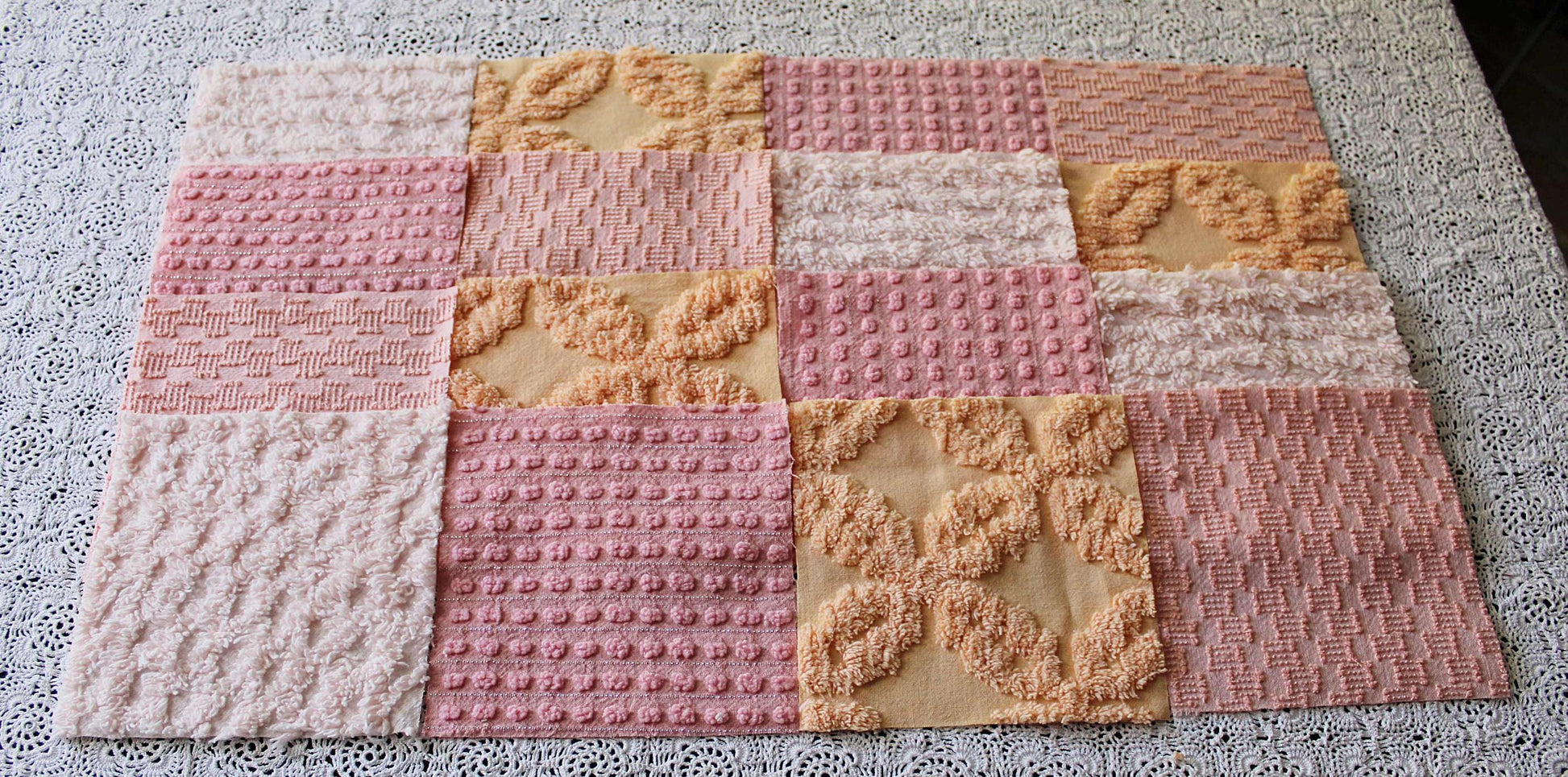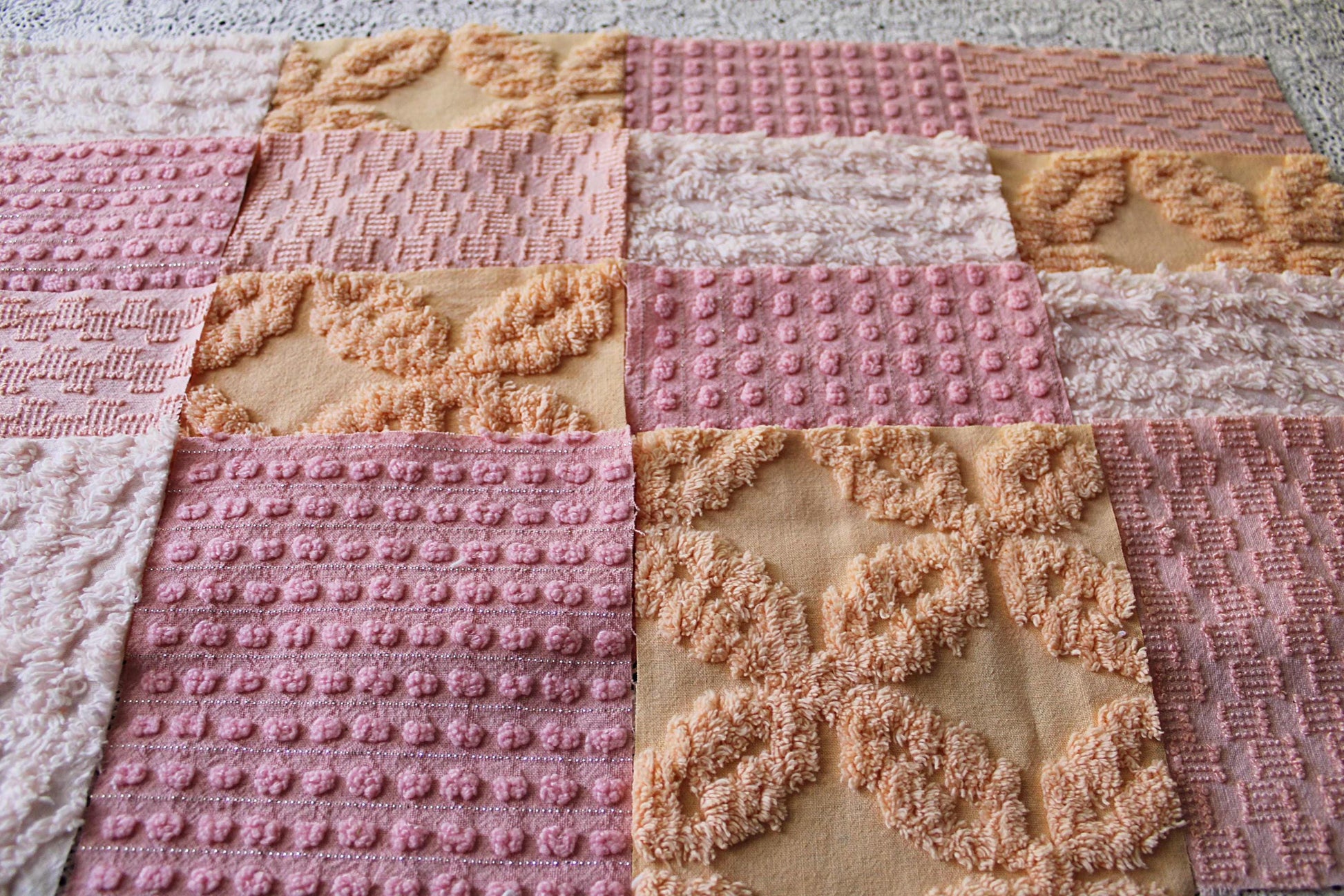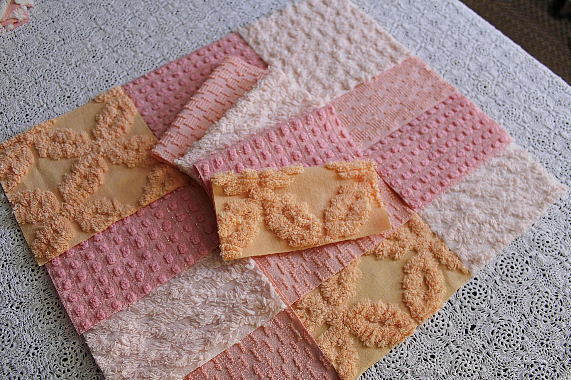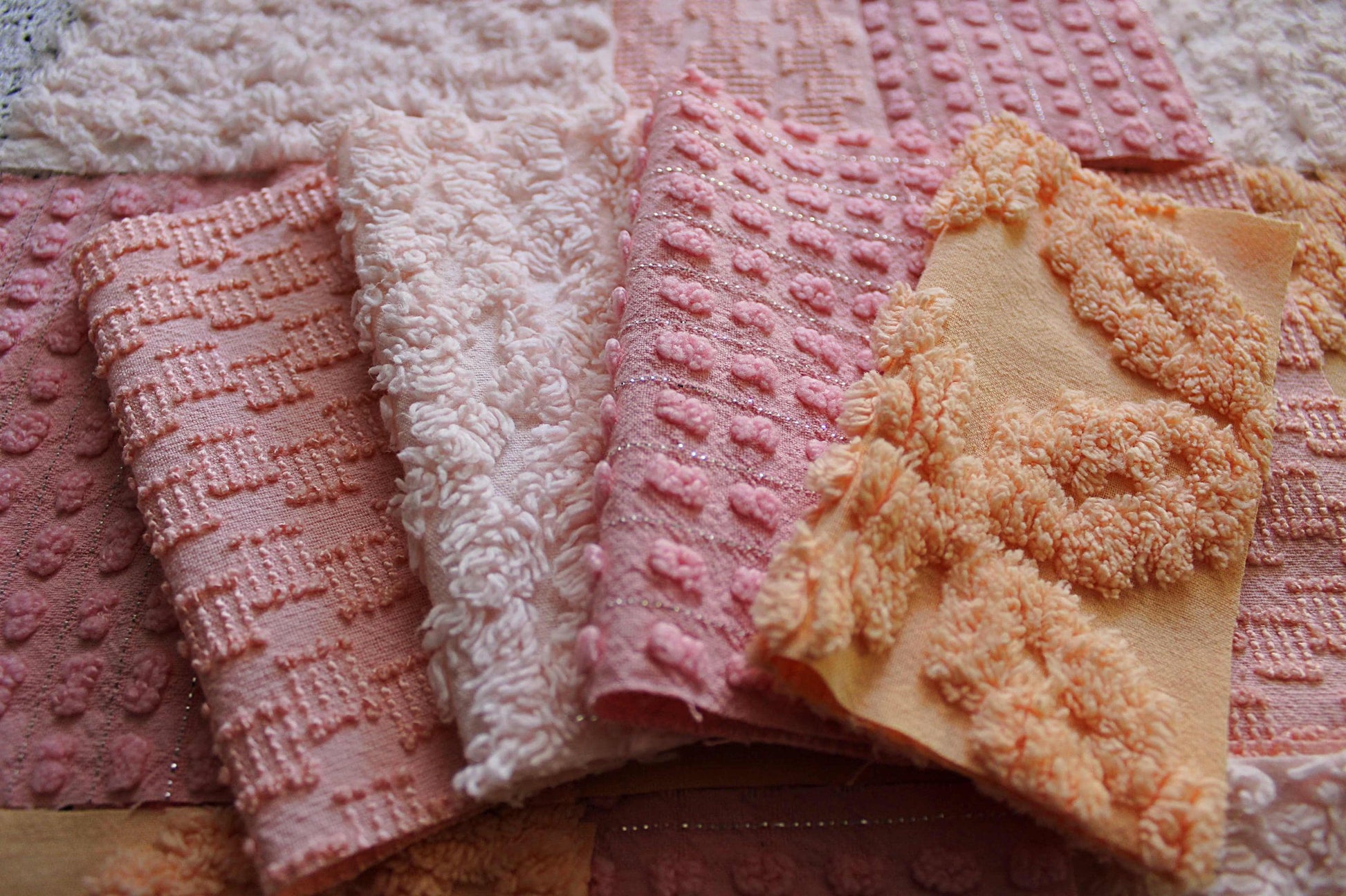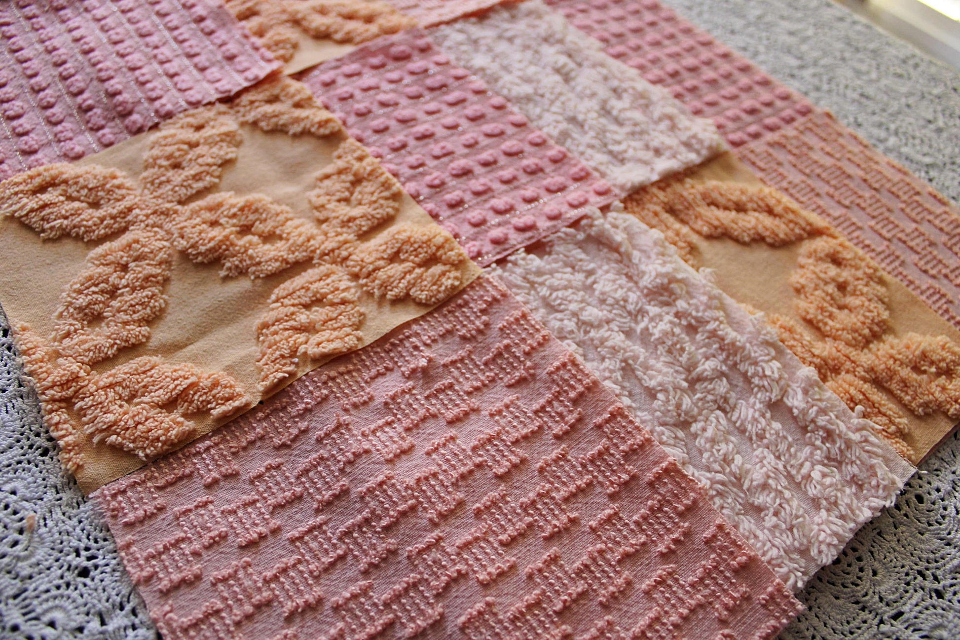 Peach Nectar... A selection of chenille fabric craft squares in shades of radiant peach with a hint of rose to evoke warmth, calm & comfort.Includes 4 of each pattern: tiny ripe peach "tempo tuft," soft iced peach lattice, rose pops with shimmer & geometric peach floral wedge. Such a lovely set to inspire or enhance your creative design.