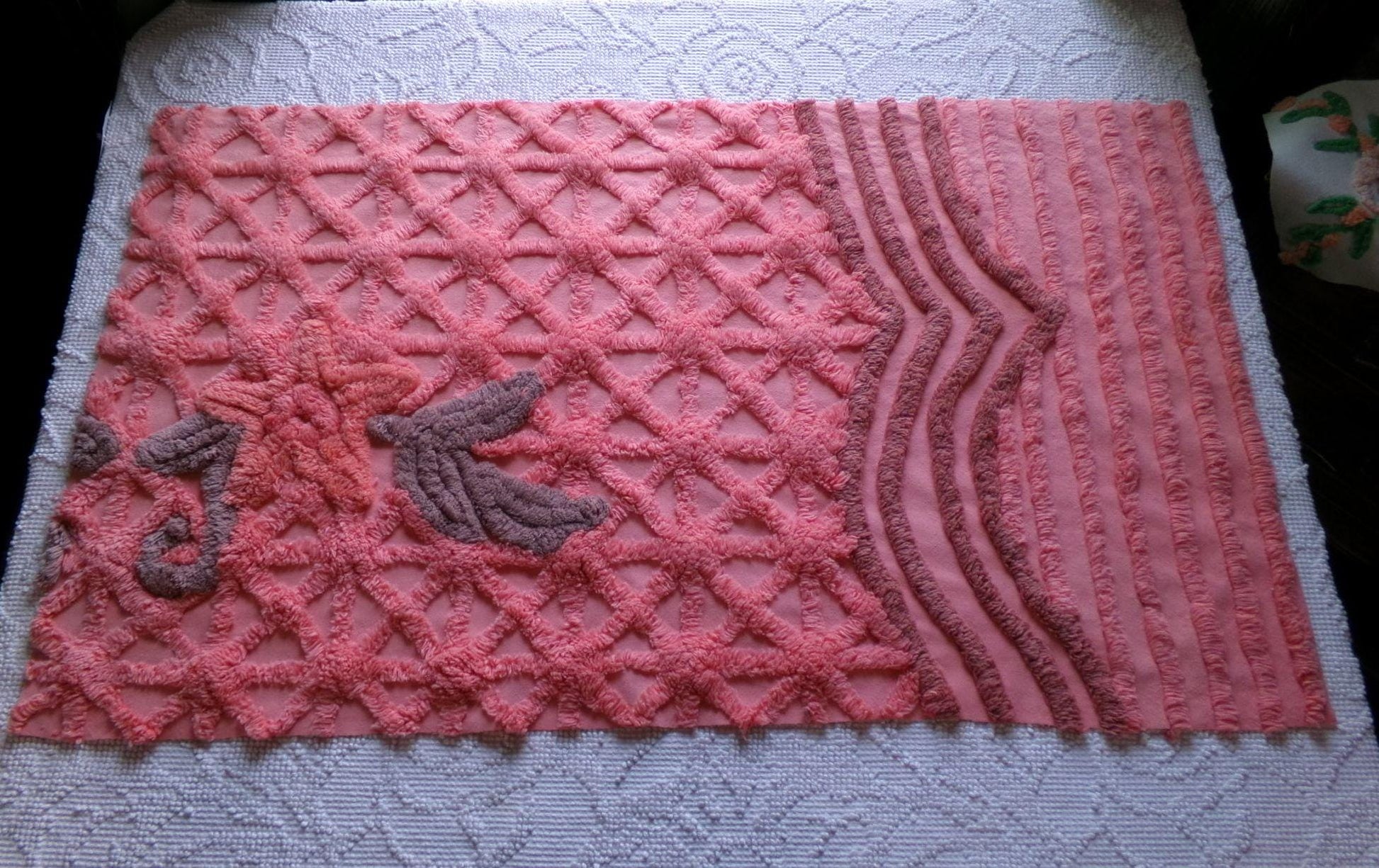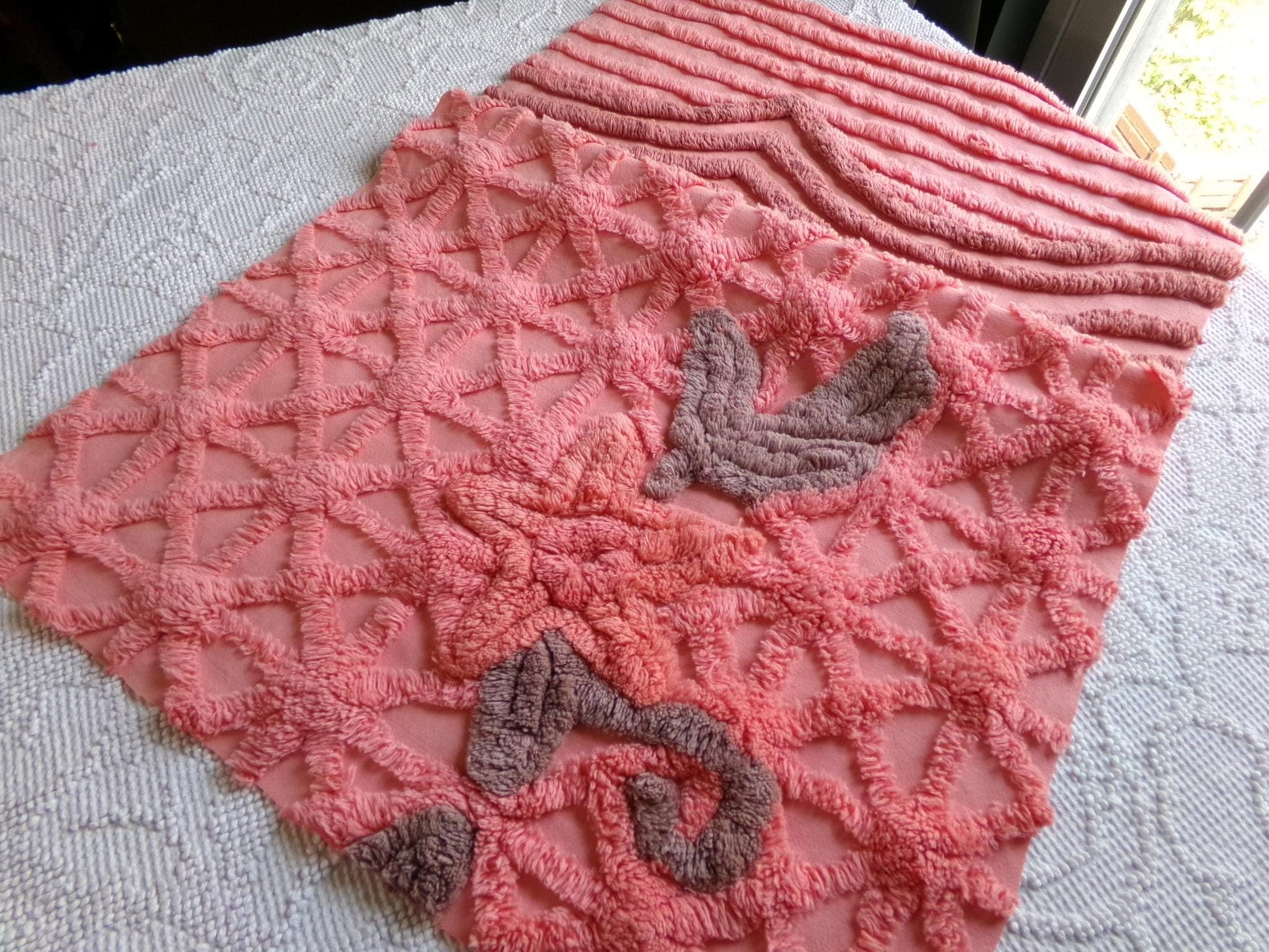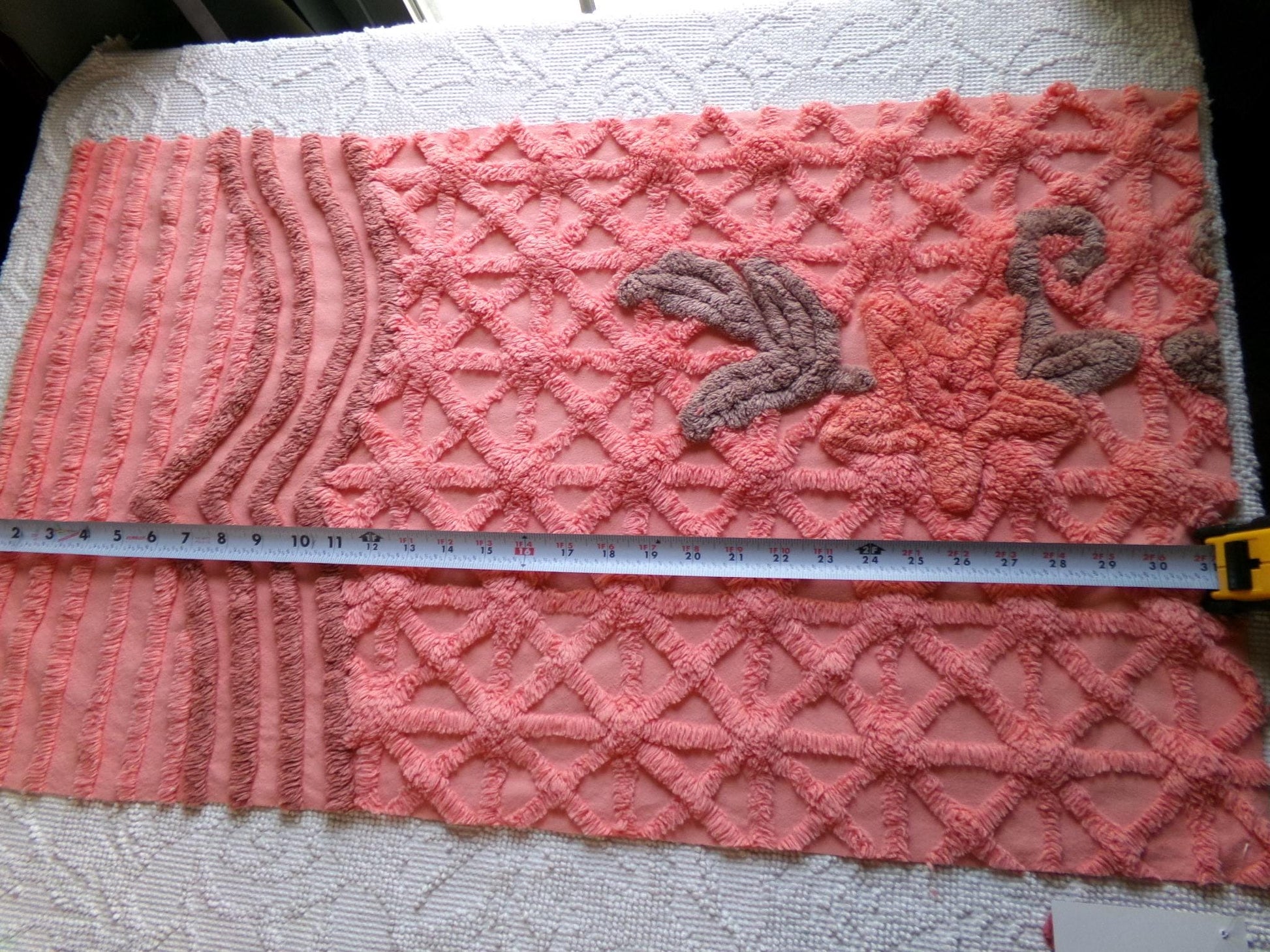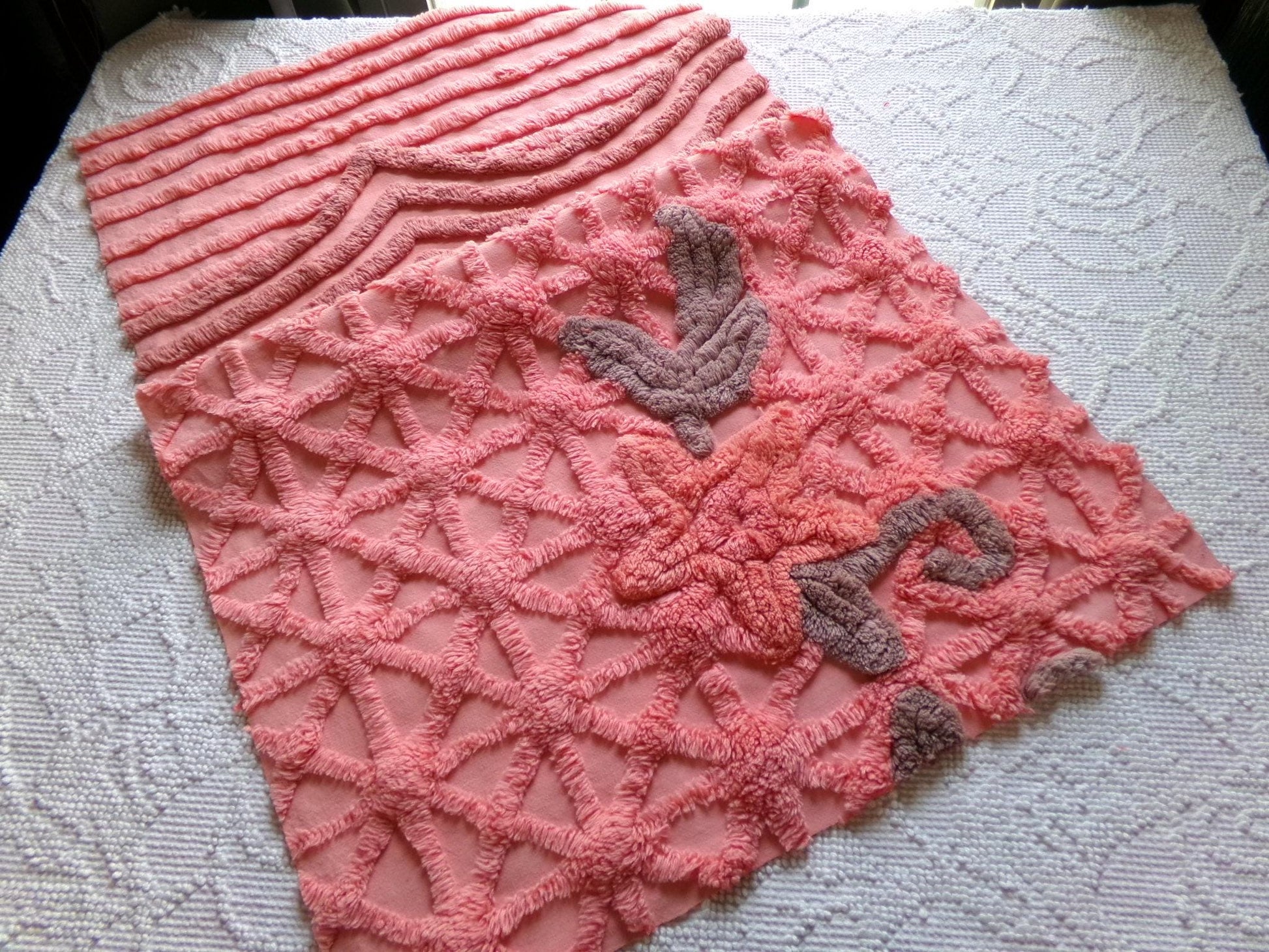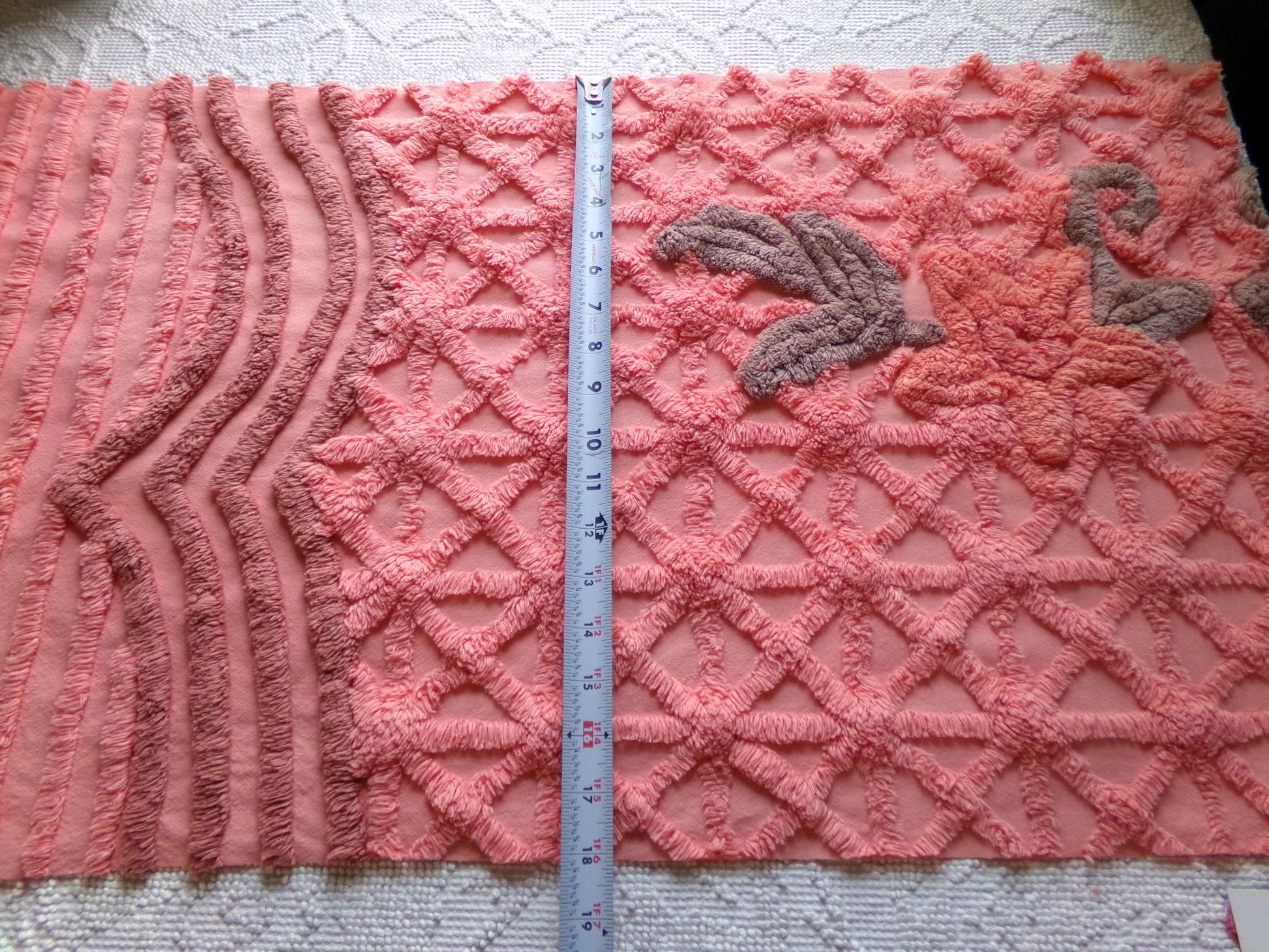 Here is a very unique piece of shabby vintage chenille fabric to inspire your creativity, in a seldom seen color that I would consider a warm, ripened melon with natural ombre variances. This is plush chenille from the 40s in a popular "starburst" or "twinkles" pattern, with a scroll design along one edge emphasizing a floral pattern tufted over the starbursts.Approx 30" x 17" inch pc. 100% cotton. Sourced from an original mid 1940s chenille bedspread. Natural color variations as noted above, may spot light tuft loss/pinholes. *Launder vintage fabrics of this colorway with great care and color test first, since it may not be not colorfast.