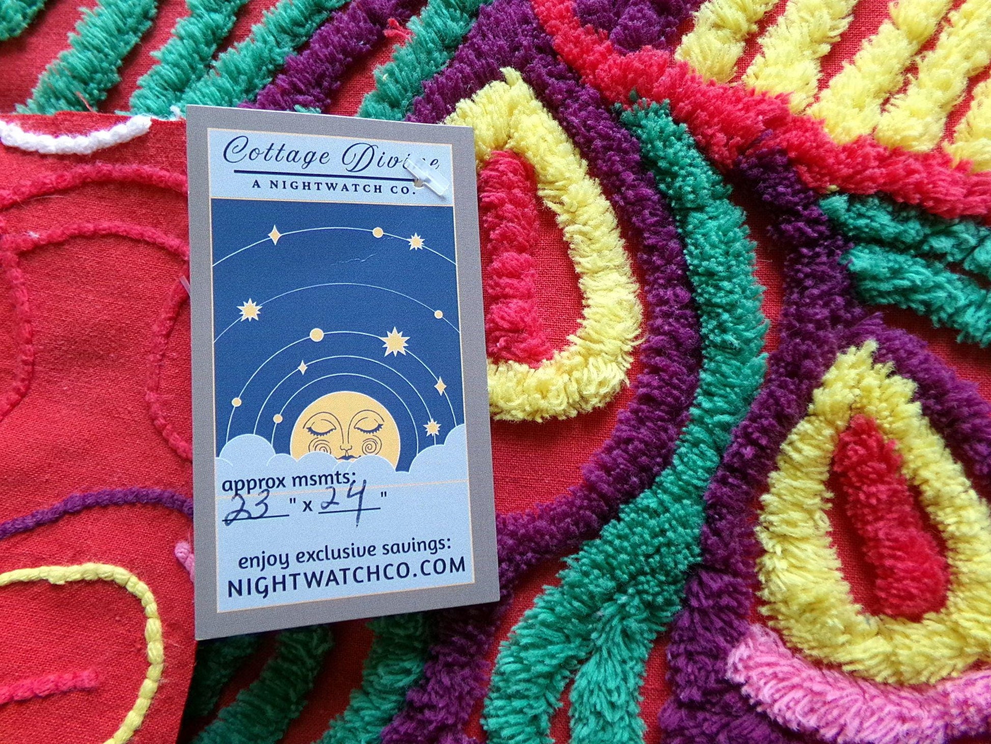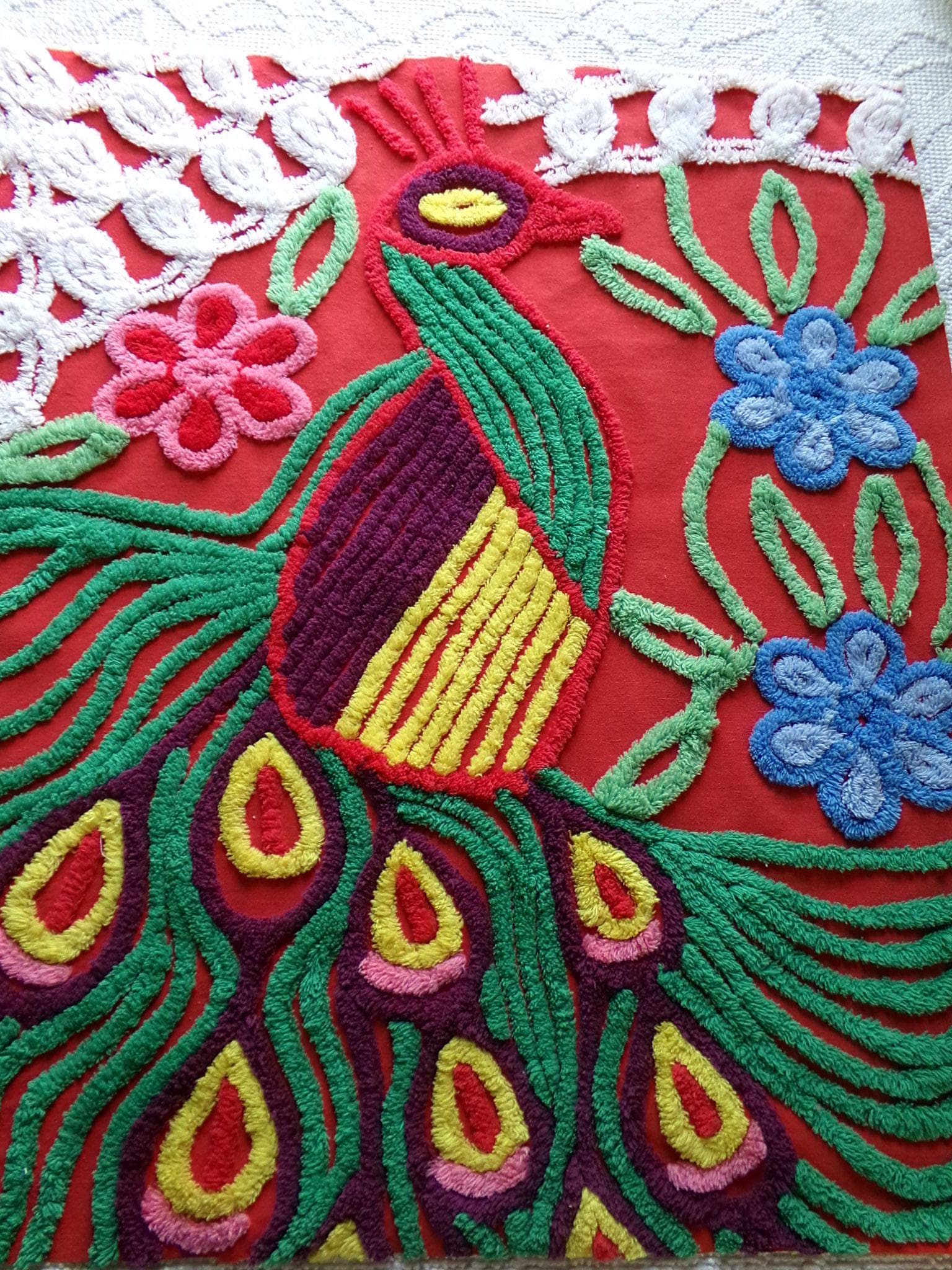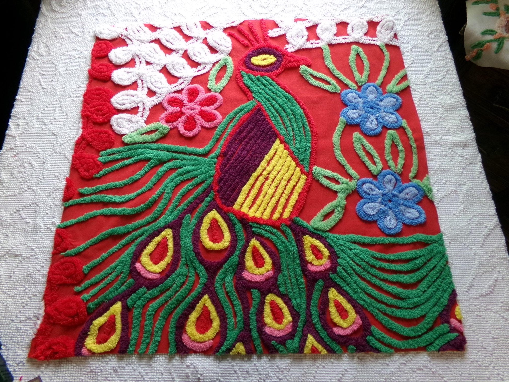 What a great wall hanging this premium piece of vintage peacock chenille fabric would make. An exotic bird situated among three colorful flowers stands proud on a saturated red bkgd.Approx 23" x 24" inch piece. 100% cotton. Sourced from an original early 1950s chenille bedspread. *Launder vintage red fabrics with great care and color test first, since many early reds & other vibrant colors are not colorfast.