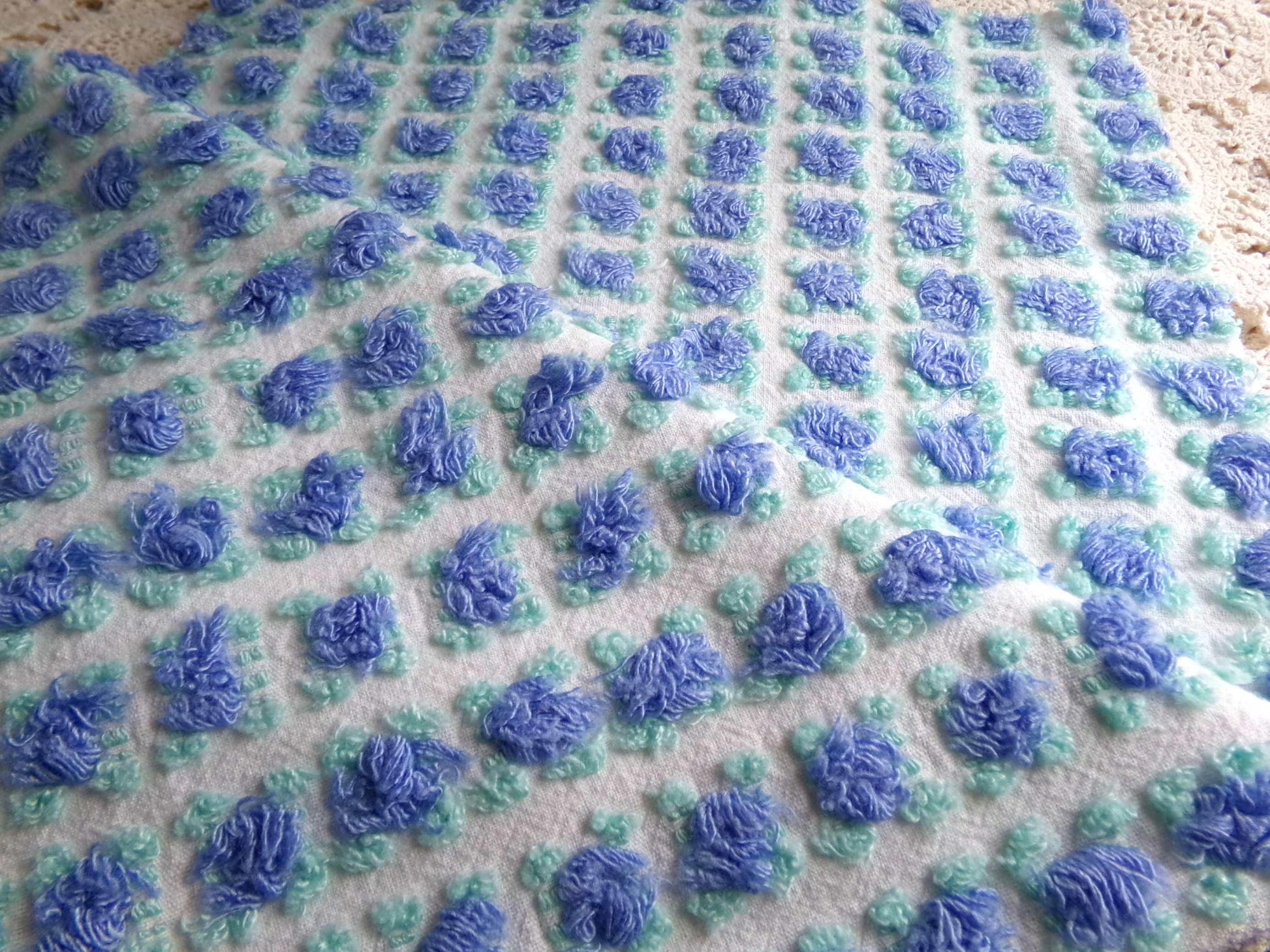 Inspire your beautiful project with this amazing piece of vintage chenille rosebud fabric. Darling fairytale periwinkle blue rosebuds with a hint of shimmer dot a warm white background, flanked by cute mint green leaves. Approx 20" x 24" inch piece. *This special material was sourced from a new, old stock vintage chenille bedspread that had been kept lovely stored for over 50 years in a linen closet. It was stored near fragranced dryer sheets & does retain a scent, which I want you to be aware of. Lightweight cotton or cotton blend original fabric c. 1960s. w h y - v i n t a g e? Incorporating vintage fabric into your project brings unique benefits: an unparalleled charm, a whisper of nostalgia...a deep-rooted history embedded in every fiber. Not only is the quality often superior to modern, vintage fabric is a sustainable choice - an eco-friendly option that stands out in a world consumed by mass-produced goods. For your next cherished design, think vintage 3 w h a t - t o - k n o w - this is a vintage fabric piece, not an entire bedspread - expect vtg attributes such as age spots, pulled threads, color variances, etc. - items are laundered/stored near fragranced products - combined shipping available; overages over $1 refunded t h e - c o t t a g e - d i v i n e From the tiniest quilt square to elaborately tufted chenille bedspreads & lovingly handcrafted robes, we are committed to honoring the legacy of this beloved textile.