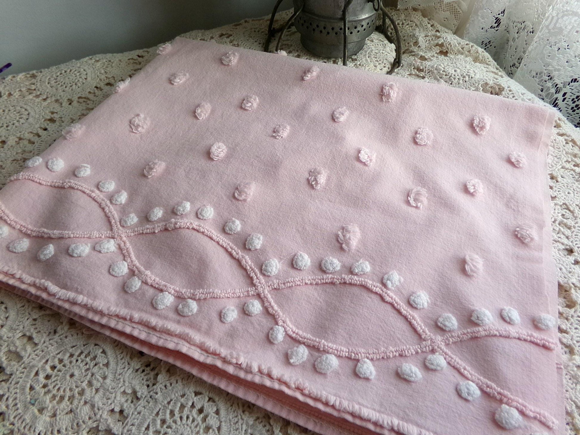 This vintage feminine petal pink chenille fabric is easy to envision in any creative project, from DIY pillow covers to patchwork chenille quilts. Wideset puff dots are accented along an edge with a dainty chain link design. Photos taken in hi/lo light to show color adaptation.Vintage fabric measures 20" x 27" inches. 100% solid cotton has the feel of an old school sheet. Expect it to wrinkle easily given fabric composition. Few tiny factory dot dye marks as seen final img.