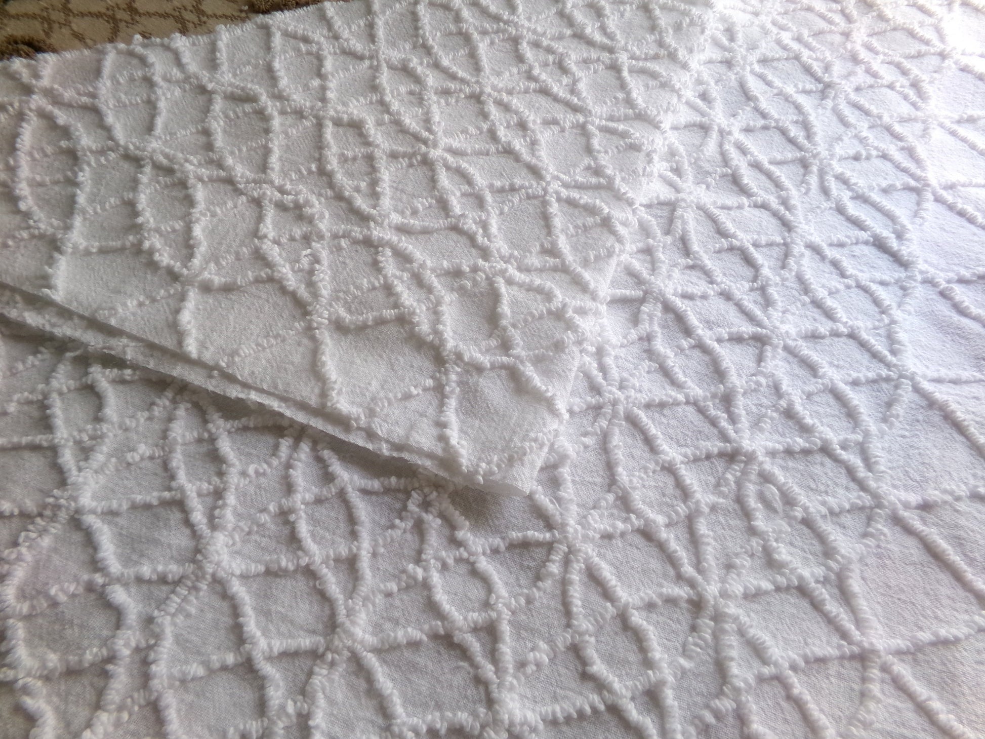 Bring a simple, timeless elegance to your creative project with this lovely vintage chenille fabric in a solid white eternity link design. Delicate needletufting adds sophistication without overpowering.Approx 20" x 24" inch piece. Lightweight cotton. Fresh bright white, not off-white or cream. A few light age marks as seen final img.