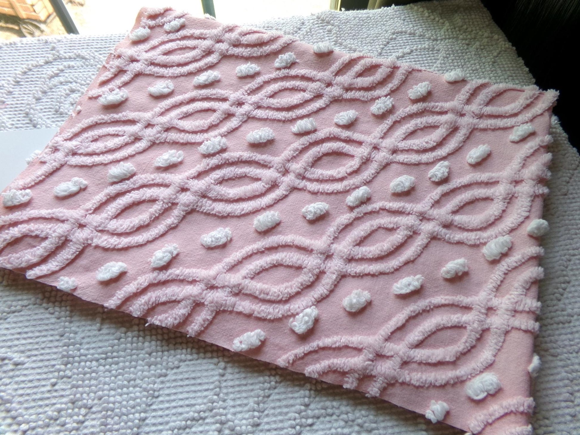 This lovely piece of dusty pink vintage chenille fabric will infuse a romantic, feminine essence into your special project. It features a unique geometric infinity link pattern, accented by rows of white puff pops.Approx 17" x 25" inch pc. 100% cotton. Sourced from an original mid 1940s chenille bedspread. You may spot light tuft loss/pinholes.