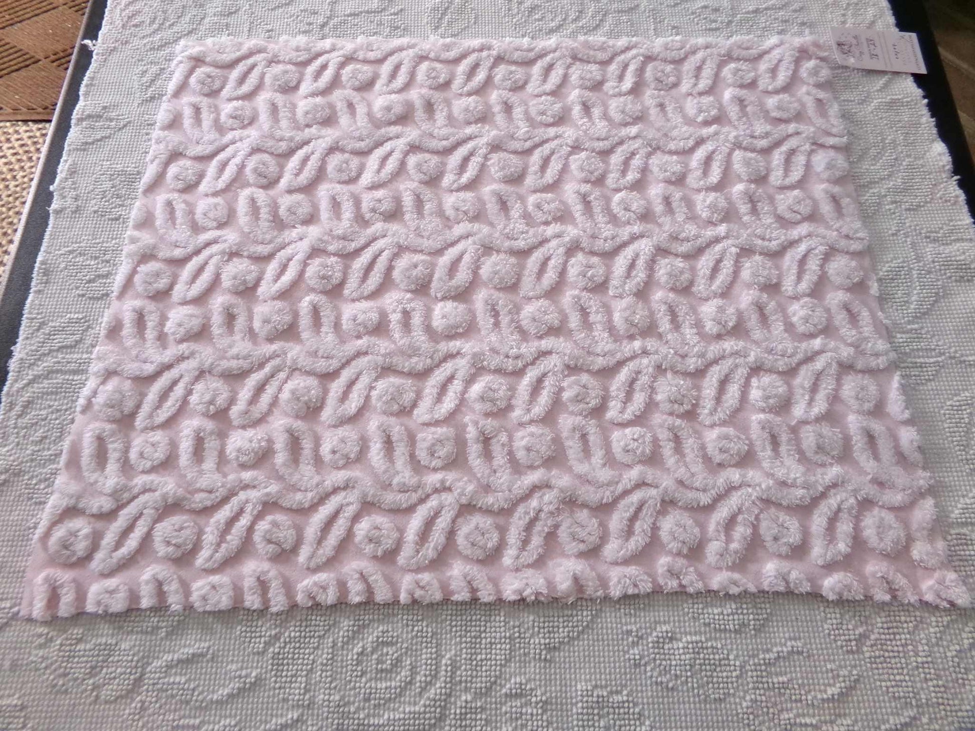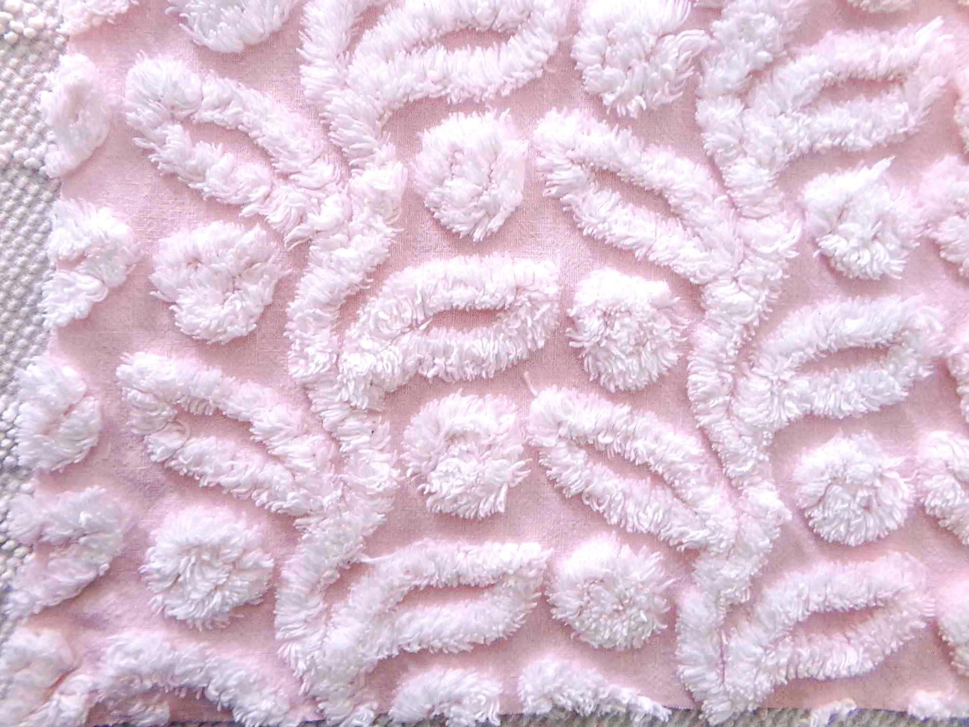 Looking for that special piece of fabric to create an heirloom appeal to your creative design? This vintage chenille piece is absolutely exquisite in a soft pink, tufted in a white plush ivy berry pattern.This textile treasure is one of the most elusive, desirable patterns from vintage chenille maker, Hofmann Textiles, best known for their tufted daisy designs loved by quilters for generations.