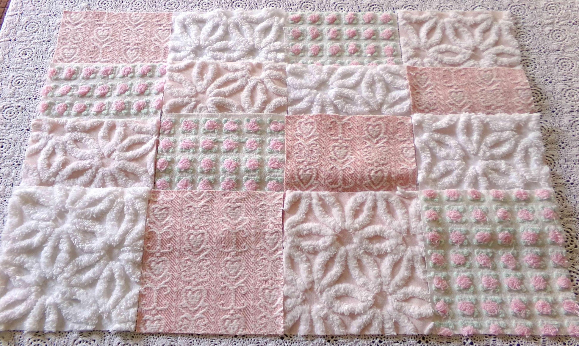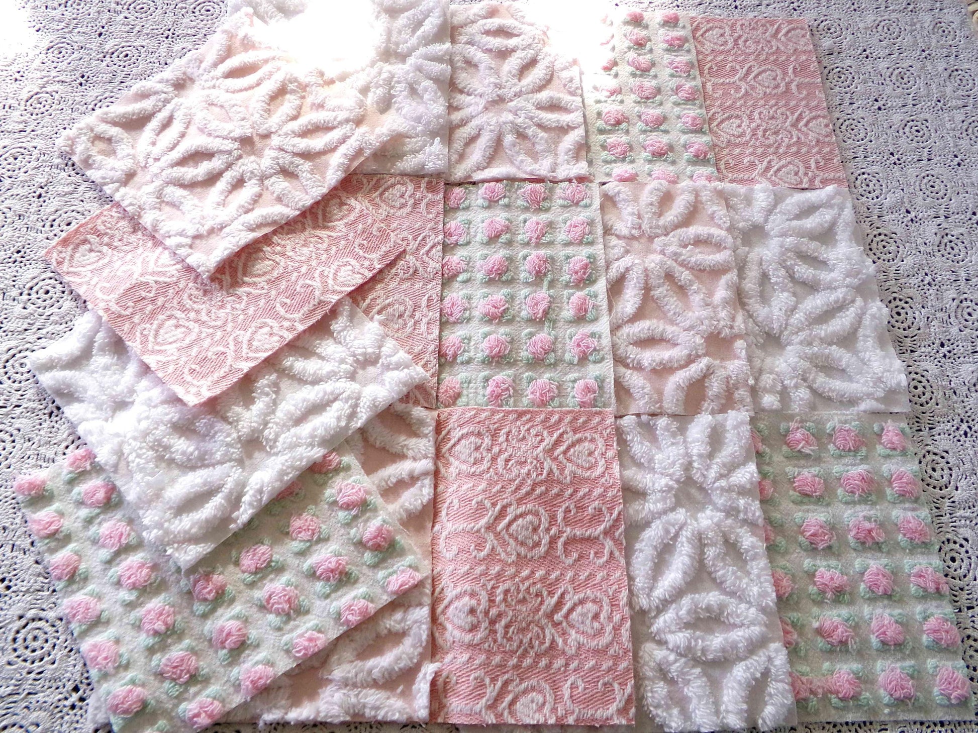 Classic feminine colors in this set of vintage woven & chenille fabric squares. Includes a mix of 4 different patterns. The following squares are in traditional chenille: pink rosebud, pink & white daisy, all white daisy. The woven squares (qty 4) are the pink & white country heart print.::total qty: 16 chenille quilt squares
