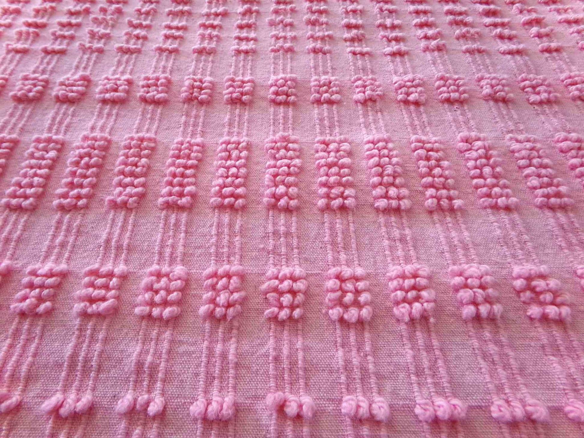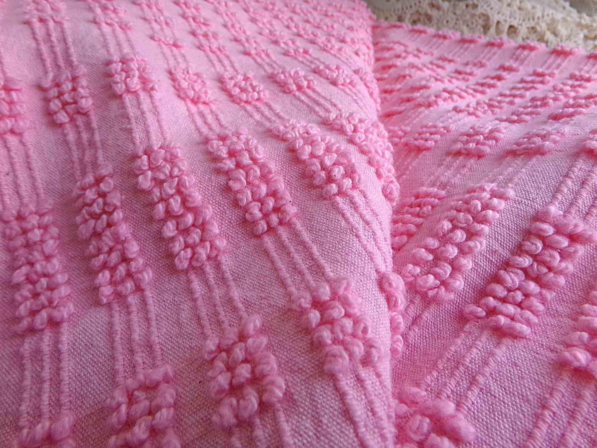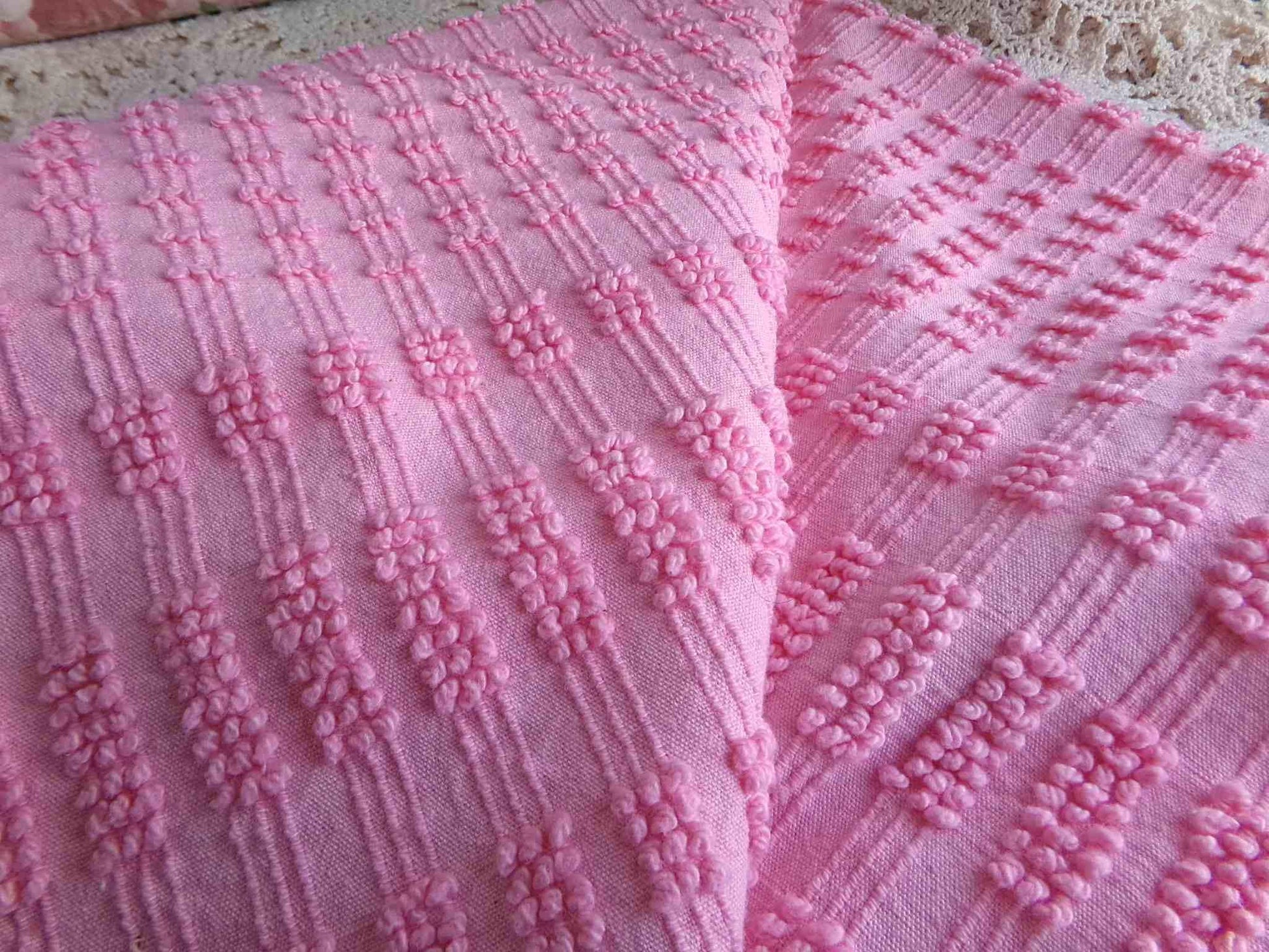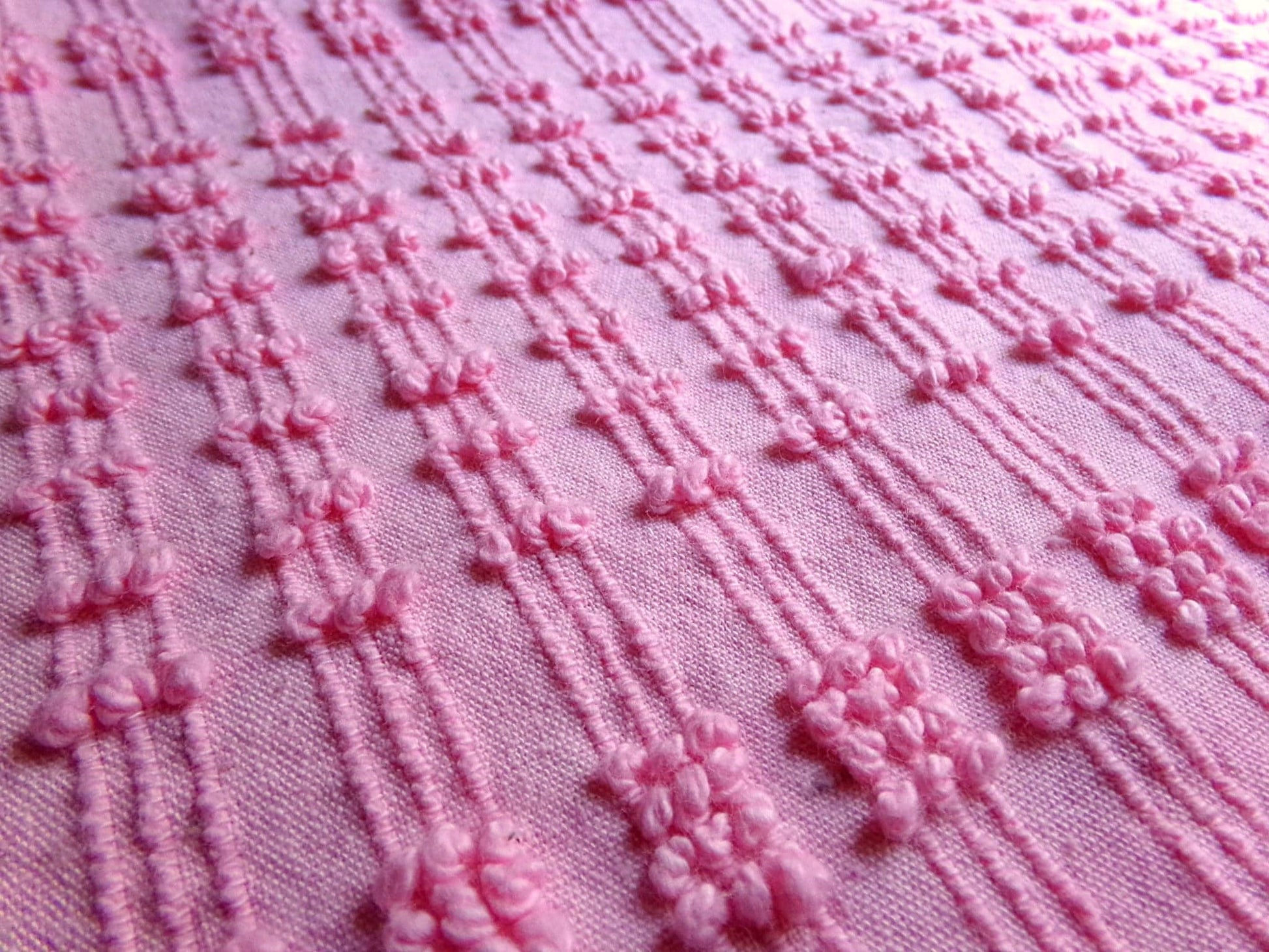 Add pretty pink color and great nubby texture to your sewing project with this 20" x 24" inch piece of vintage chenille fabric. An interesting design of raised, texturized "pearl" pops connected by skinny lines creates a very unique presentation. Beautiful rich shade of feminine pink.100% strong cotton, this fabric was sourced from a never used, NOS vintage Canada-made chenille woven hobnail bedspread. Excellent quality. All photos taken in natural light.