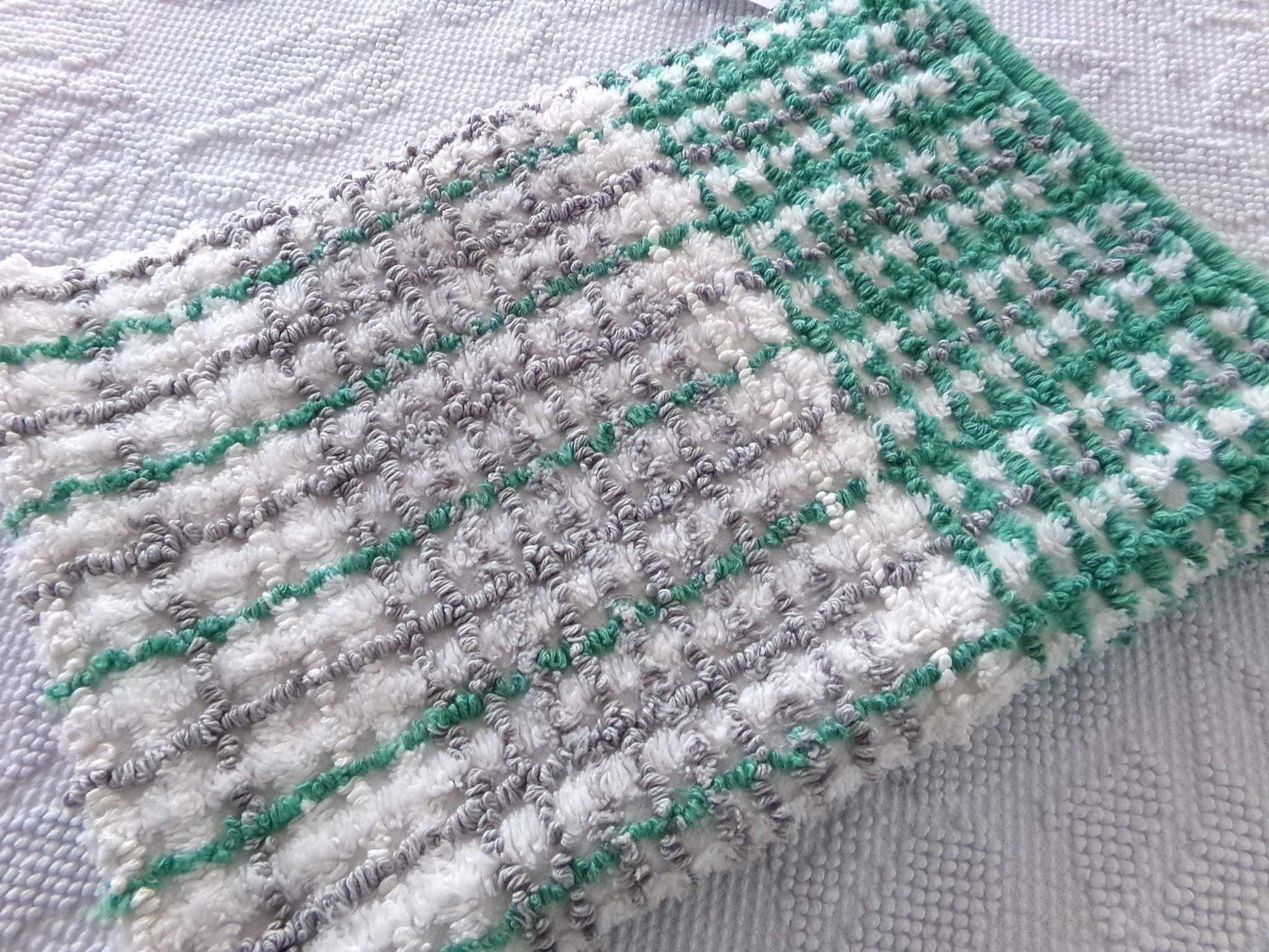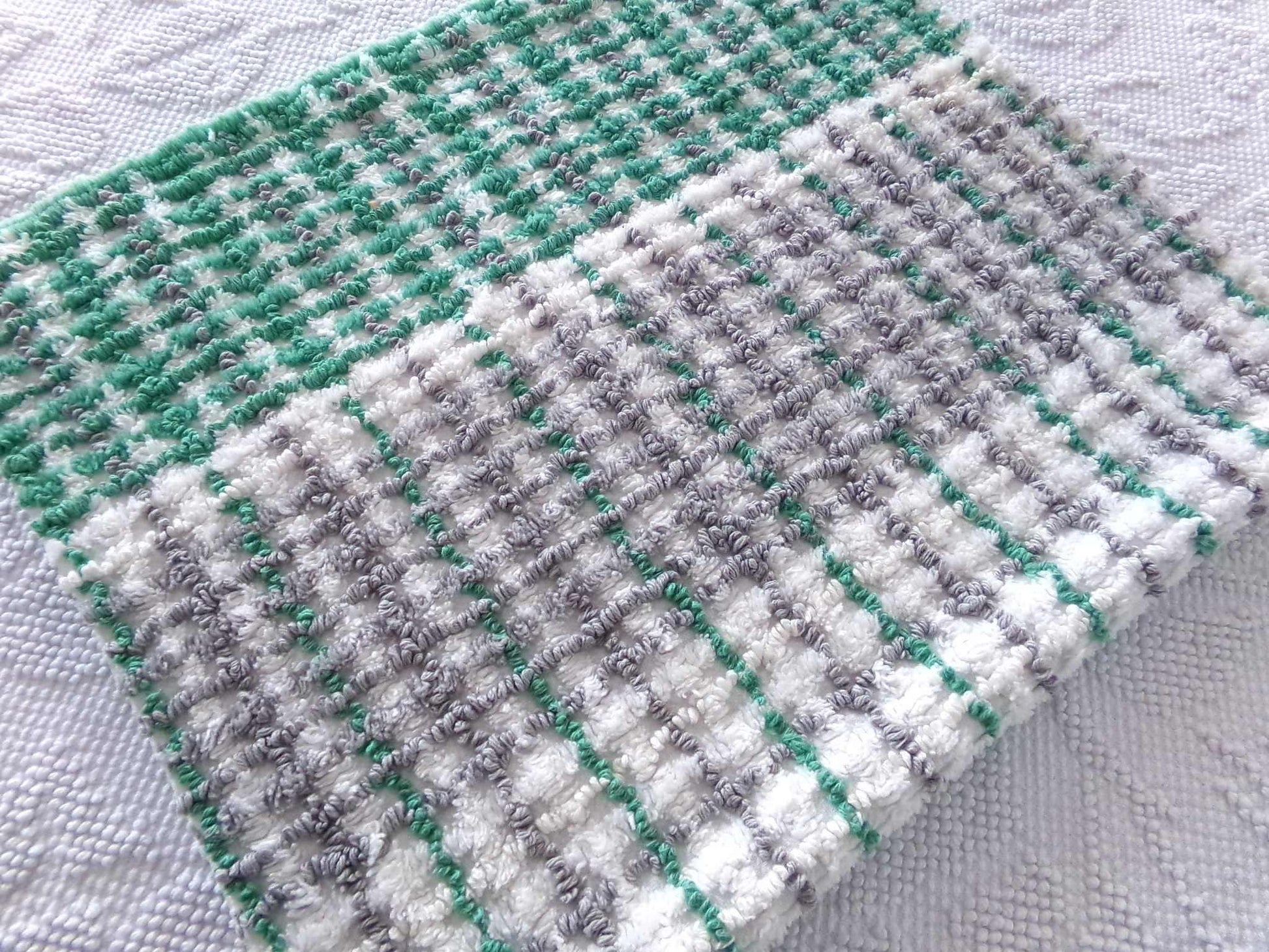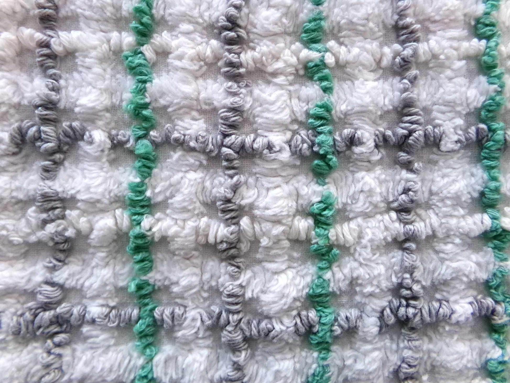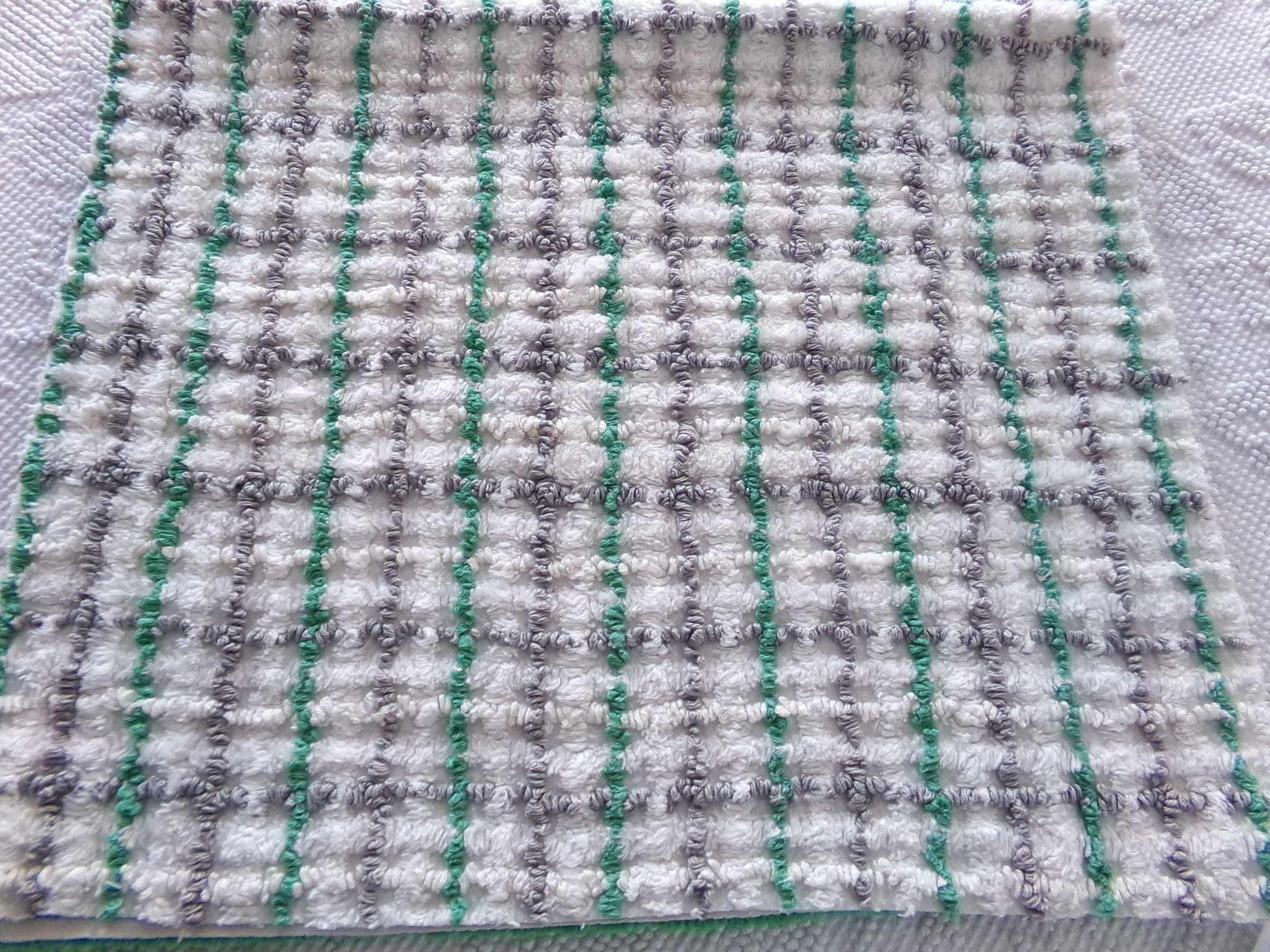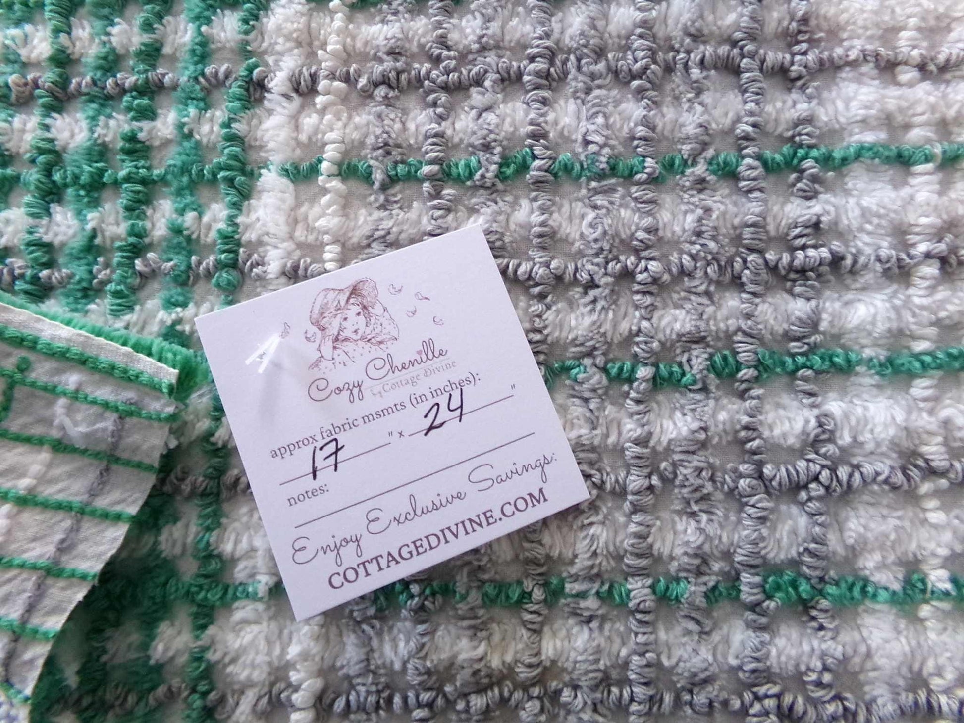 see more, cottagedivine.comNeed an unusual piece of vintage chenille fabric with excellent texture? This material might be what you've been searching for. A prominent geometric pattern makes a striking statement in kelly green and dove grey, set on a white bkgd.